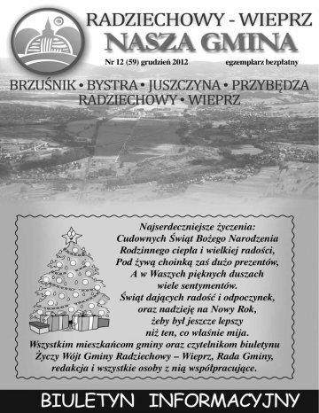 Nr 12 (59) grudzień 2012 egzemplarz bezpłatny Najserdeczniejsze życzenia: Cudownych Świąt Bożego Narodzenia Rodzinnego ciepła i wielkiej radości, Pod żywą choinką zaś dużo prezentów, A w Waszych pięknych duszach wiele sentymentów. Świąt dających radość i odpoczynek, oraz nadzieję na Nowy Rok, żeby był jeszcze lepszy niż ten, co właśnie mija. Wszystkim mieszkańcom gminy oraz czytelnikom biuletynu Życzy Wójt Gminy Radziechowy – Wieprz, Rada Gminy, redakcja i wszystkie osoby z nią współpracujące. Nasza Gmina • GRUDZIEŃ • 2012 Informacje dotyczące sesji Rady Gminy z dnia 6 grudnia 2012 r. 6 grudnia b.r. odbyła się XXIV sesja Rady Gminy, na którą zaproszony został Dyrektor Wojewódzkiego Ośrodka Ruchu Drogowego w Bielsku – Białej P. Edward Płonka. Poinformował on o działaniach WORD skupiających się nie tylko na przeprowadzaniu egzaminów na przyszłych kierowców, ale również na szeroko pojętym bezpieczeństwie ruchu drogowego. P. Płonka przekazał 600 znaków odblaskowych znacznie poprawiających bezpieczeństwo pieszych na drodze. Na sesji Radni podjęli uchwały związane z wejściem w życie ustawy tzw. śmieciowej – uregulowane zostały kwestie szczegółowego sposobu i zakresy świadczenia usług w zakresie odbierania odpadów komunalnych od właścicieli zamieszkujących nieruchomość, od właścicieli częściowo zamieszkałych oraz od nieruchomości niezamieszkałych. Określony został również termin, częstotliwość i tryb uiszczania opłat, metoda ustalania opłat, rodzaje dodatkowych usług świadczonych przez Gminę oraz wzór deklaracji składanej przez właściciela nieruchomości. Podjęte zostały również uchwały regulujące określenie przebiegu dróg gminnych w Brzuśniku, Bystrej oraz Przybędzy – proces ten trwa i na kolejnych sesjach podjęte zostaną uchwały określające przebieg dróg w pozostałych sołectwach. Jednym z ważniejszych punktów porządku obrad było przyjęcie budżetu na 2013 rok. W trakcie dyskusji nad budżetem stwierdzono, że w 2013 roku Gmina nie będzie zaciągała nowych kredytów oraz nie będą planowane nowe inwestycje. Ponieważ budżet Unii planowany na lata 2014 – 2020 będzie stwarzał możliwości do pozyskania nowych środków, nasza Gmina chce się do tego czasu przygotować, aby w przyszłości móc skorzystać z możliwości ich pozyskania. Uchwałę budżetową Radni podjęli jednogłośnie. Ponadto na sesji przedstawiona została informacja dotycząca wykorzystaniu środków z Unii Europejskiej. Wszystkie podjęte uchwały oraz protokół z sesji zamieszone są na stronie internetowej: http://bip.radziechowy-wieprz.pl Co nas czeka w sprawie śmieci c.d. Na sesji 06 grudnia 2012r. Rada Gminy podjęła uchwały dotyczące zasad gospodarowania śmieciami na terenie Gminy Radziechowy – Wieprz. Wynika to z konieczności dostosowania się do zmienionych przepisów ustawy z dnia 13 września 1996r. o utrzymaniu czystości i porządku w gminach. To gmina będzie świadczyć usługi w zakresie odbierania odpadów komunalnych od wszystkich właścicieli nieruchomości, zamieszkałych i niezamieszkałych, a także częściowo zamieszkałych. Od 1 lipca 2013r. nie będą już obowiązywały umowy, które mieszkańcy podpisali z dotychczasowym odbiorcą śmieci. - Wieprz www.bip.radziechowy-wieprz. pl w zakładce ochrona środowiska, dodatkowo w biurach sołtysów w poszczególnych miejscowościach, a także w sekretariacie Urzędu Gminy. Planujemy również aby ułatwić Państwu wypełnienie deklaracji, zorganizowanie w poszczególnych sołectwach spotkań, na których pracownicy urzędu wyjaśnią wszelkie wątpliwości i pomogą prawidłowo wypełnić deklaracje. Informacja o terminach i godzinach spotkań będzie dostępna na stronie internetowej Urzędu Gminy www. radziechowy-wieprz.pl oraz ogłoszona w kościołach. O tym czy mieszkaniec chce płacić 15 czy 8 złotych zadeklaruje sam wypełniając deklarację o wysokości opłaty za gospodarowanie odpadami komunalnymi. Właściciel nieruchomości zgodnie z uchwałą Rady Gminy Radziechowy – Wieprz zobowiązany jest złożyć w Urzędzie Gminy pierwszą deklarację o sposobie gospodarowania odpadami w terminie do 30 marca 2013 roku. Właściciel nieruchomości jest również zobowiązany złożyć do wójta, deklarację o wysokości opłaty za gospodarowanie odpadami komunalnymi w terminie 14 dni od dnia zamieszkania na danej nieruchomości pierwszego mieszkańca lub powstania na danej nieruchomości odpadów komunalnych. Wzór deklaracji otrzymacie Państwo Pocztą Polską, będzie ona dostępna również w Biuletynie Informacji Publicznej Urzędu Gminy Radziechowy W przypadku zmiany danych będących podstawą ustalenia wysokości należnej opłaty za gospodarowanie odpadami komunalnymi (tj. zgon, Opłata dla mieszkańca za miesiąc za odpady zbierane selektywnie w naszej gminie wynosić będzie 8,00 złotych, natomiast jeżeli mieszkaniec nie będzie chciał segregować odpadów zapłaci stawkę 15,00 złotych na miesiąc. 2 urodzenie, wyjazd lub inne) lub zmianie wytwarzania odpadów (wzrost lub spadek) określonej w deklaracji ilości odpadów komunalnych powstających na danej nieruchomości właściciel nieruchomości jest zobowiązany złożyć nową deklarację w terminie 14 dni od dnia nastąpienia zmiany. Opłatę za gospodarowanie odpadami komunalnymi w zmienionej wysokości będzie trzeba dokonać za miesiąc, w którym nastąpiła zmiana. W ramach stawki opłaty za gospodarowanie odpadami komunalnymi poniesionej przez mieszkańca zamieszkującego nieruchomość odbierana będzie każda ilość następujących odpadów komunalnych: - odpadów zmieszanych (nieselektywnie zbieranych), - odpadów selektywnie zbieranych : plastiku, metalu, papieru, tkaniny, szkła, - żużlu po uzgodnieniu telefonicznym Odbiór w/w odpadów odbywał się będzie jeden raz w miesiącu. - odpadów wielkogabarytowych, o
