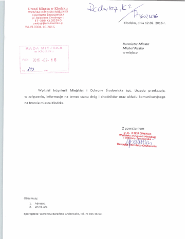 Urzad Miaata w KJodzku WYDZlAt I N ~ Y N I E MIEJSKIEJ RI~ I OCHRONY SRODOWISKA pl. Bolestrwr Chrabrego 1 5 7 - 3 0 0 KLODZKO umklod@um:kledzko.pI / Ktodzko, dnia 12.02. 2016 r. WI.V1.0004.10.2016 Burmistrz Miasta Michat Piszko w miejscu Wydziat lnzynierii Miejskiej i Ochrony ~rodowiska tut. Urzqdu przekazuje, w zatqczeniu, informacje na temat stanu drog i chodnikow oraz ukiadu komunikacyjnego na terenie miasta Ktodzka. Z powaianiem Otrzymujg: 1. 2. Adresat, WI.VI, a/a Sporzgdzila:Weronika Barariska Grabowska, tel. 74 865 46 50. 1. DROGl PUBLICZNE NA TERENIE MIASTA KLODZKA Na terenie miasta Ktodzko siec drogowq tworzy 84,49 km drog publicznych, z tego 63% to drogi gminne, ktorych jest 53,27 km, drog krajowych jest 11,17 km, wojewodzkich jest 0,63 km oraz dr6g powiatowych 19,42 km. Zarzqdcami drog samorzqdowych z mocy ustawy o drogach publicznych tj, wojewodzkich, powiatowych i gminnych s q odpowiednio: Marszalek Wojewodztwa Dolnoslqskiego, Starosta Klodzki i Burmistrz Klodzka. Drogi wojewodzkie i powiatowe zarzqdzane s q przez powotane zarzqdy drogowe, a drogi gminne zarzqdzane s q bezposrednio przez Burmistrza Klodzka. Drogi krajowe podlegajq Generalnemu Dyrektorowi Drog Krajowych i Autostrad. Nalezy rowniez nadmienit, ze na terenie miasta sick drogowq tworzq rowniez gminne drogi niepubliczne, czyli wewnqtrzne, ktorych dlugosc szacuje sie na okolo 20 km. W zdecydowanej wiekszoSci drog wewnetrznych nawierzchniq stanowi grunt rodzimy. Ale s q tez drogi o nawierzchni bitumicznej np. W-wy Centrum, Lisia, Rataja. 2 . 1 ~ 0 SI tSTAN D R ~ G GMINNYCH W MIESCIE 2.1 DROGl GMINNE PUBLICZNE. Na terenie miasta Klodzko znajduje sie ogolem okolo 76 km drog gminnych, w tym o nawierzchni twardej (bitumicznej, betonowej, kostkowej, brukowcowej) 46,73 km, stanowiqce 61 % drog, a pozostale drogi to drogi gruntowe. Nalezy zaznaczyk, ze zgodnie z przepisami prawa o ruchu drogowym do drog twardych zalicza sie drogi z jezdniqo nawierzchni bitumicznej, betonowej, kostkowej, klinkierowej lub brukowcowej oraz z plyt betonowych lub kamienno-betonowych. Inne drogi s q drogami gruntowymi, w tym rowniez drogi z jezdniqo nawierzchni tluczniowej. W zdecydowanej wiekszosci konstrukcje istniejqcych jezdni asfaltowych stanowi podbudowa z tlucznia gruboSci Srednio 1 9 2 0 cm oraz asfaltobeton jako warstwa wiqzqca i Scieralna grubosci Srednio 4+4 cm. 2.2. DROGl GMINNE NIEPUBLICZNE. Gmina Miejska Klodzko posiada ok. 20 km drog o nawierzchni gruntowej, w tym nawierzchniq ttuczniowq oraz z destruktu asfaltowego stanowi okolo 8 km tj. ul. Piekna, ul. Rozana, ul. Rakowa, ul. Widokowa, ul. Cedrowa, ul. Brzoskwiniowa, ul. Czeresniowa, pozostale drogi s q drogami z gruntu rodzimego. Wiekszosc nie posiada uzbrojenia technicznego, niezbedne jest wykonanie sieci kanalizacji deszczowej oraz oSwietlenia ulicznego. Wyjqtkiem jest ul. Wisniowa w ktorej, w 2009 roku zostata wybudowana sieC kanalizacji sanitarnej oraz wodociqgowej. WiekszosC z drog gruntowych nalezy utrzymywac w stanie przejezdnosci poniewaz sluzq do obslugi m.in, domkow jednorodzinnych, co wymaga corocznego angazowania srodkow finansowych na poziomie okolo kilkudziesieciu tysiecy zlotych rocznie. 3. OCENA STANU TECHNICZNEGO SlECl DROG GMINNYCH KRYTERIA OCENY Analiza wynikow przeglqdow technicznych nawierzchni pozwala na ocene stanu nawierzchni i podjecie niezbednych decyzji dotyczqcych sposobu i zakresu naprawy nawierzchni z uwzglednieniem zakresu uszkodzen. Sposob i zakres naprawy powinny by6 wybrane na podstawie: - istniejqcego i przewidywanego obciqzenia ruchem drogowym, - oceny stanu technicznego nawierzchni na podstawie wynikow przeprowadzonych badan i ogledzin, - koniecznosci naprawy uszkodzen nawierzchni w zaleznosci od ich rodzaju i genezy, - optymalizacji planowanych dzialan. Ocene stanu technicznego nawierzchni asfaltowych drog gminnych dokonano na podstawie danych o takich cechach techniczno- eksploatacyjnych nawierzchni jak: - stanu spekan, informujqcy o stopniu nieciqglosci gornych warstw nawierzchni, - rownos6 podluzna, informujqca o komforcie jazdy i majqca wplyw na koszty eksploatacji pojazdu, - rownoSC poprzeczna (glqbokosc kolein), informujqca o zagrozeniach zwiqzanych z bezpieczeristwem ruchu drogowego, - stan powierzchni, informujqcy o stopniu dezintegracji, - wpiyw urzqdzen obcych na stan nawierzchni jezdni i chodnikow, - estetyka drogi Stan nawierzchni wyraza siq w czterostopniowej skali od klasy A do klasy D. Do oceny stanu nawierzchni drog twardych (asfaltowej, betonowej, brukowcowej i z kostki brukowej) wykorzystano czterostopniowq skale przedstawionq w tablicy ponizej: Oceng drbg o nawiemhni asfaltmj, betonowej, b r u k s w w e j i z kastki brukowej dokonano na podstawie codziermych pmql4d 6w i wielobtnich obserwacji eksplaatowania nawierzchni ulic oraz Infraetruktury Un@u Miasta Khdzka. 4. DROGl BITUMICZNE, BETONOWE I Z KOSTKI BRUKOWEJ Ocenie poddano ogolem 55,20 km drog publicznych, ktorych zarzqdcq jest Burmistrz Miasta Klodzka z tego: - 43,21 km ulic o nawierzchni asfaltowej, - 0,03 km ulic o nawierzchni betonowej - 3,02 km ulic o nawierzchni z kostki brukowej - 0,48 km ulic z brukowca, - 6,53 km drog o nawierzchni tluczniowej i gruntowej. Do stanu dobrego (klasa A) zaliczono 8,32 km ulic. Nawierzchnie tych ulic s q nowe, odnowione i nie wymagajq remontu. S q to ulice: - Braci Gierymskich, - Czeska od ul. Browarnej do PI. B. Chrobrego, - Floriana Szarego, - Forteczna, - Grottgera, - Kolejowa, - KoScielna, - Matejki, - Nadrzeczna, - Objazdowa na odcinku od Dusznickiej do galerii handlowej, - PI. Koscielny, - Rajska, - Spddzielcza od ul. Dusznickiej do ul. Jana Pawla 11, - Slowackiego, - Sw. Wojciecha od Drzymaly do nieruchomoSci nr 17, - Slowiaiska, - Tumska, - Walecznych na odcinku od ul. Piastowskiej do Brzozowej, - Wierzbowa od ul. Walecznych do Wierzbowej nr 10, - Zajecza od ul. Objazdowej do DK 8, - Zofii Stryjehskiej. Do stanu zadowalajqcego (klasa B) zaliczono 20,36 km. Sq to nawierzchnie, na ktorych mogq sporadycznie wystepowaC uszkodz