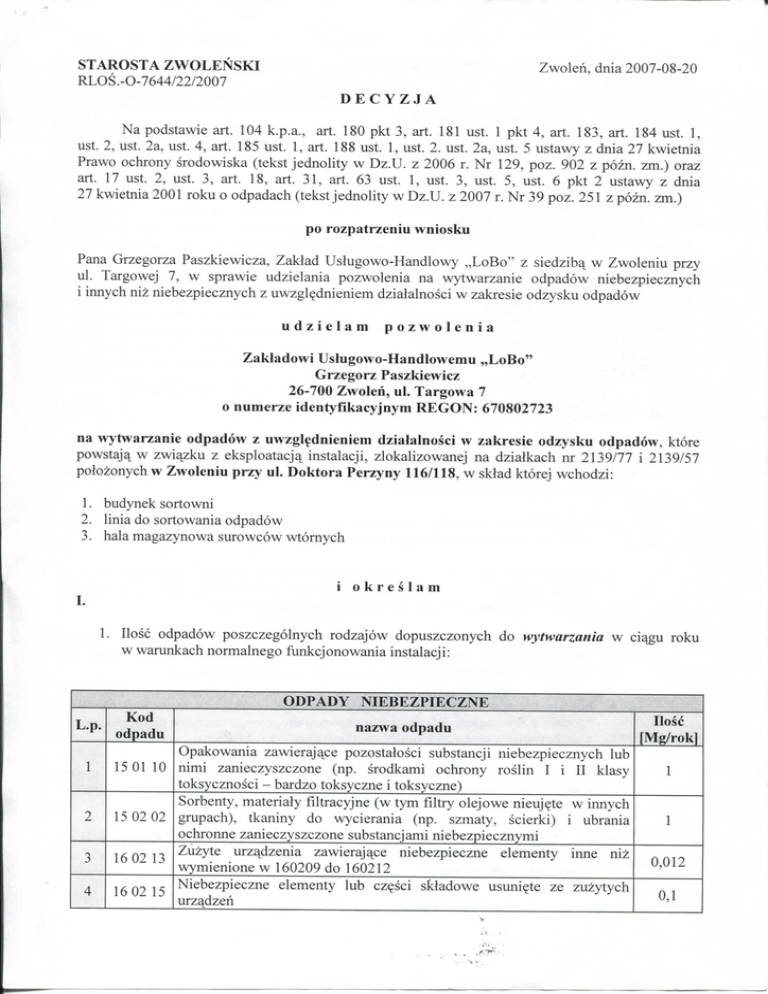 STAROSTA Z W O L E N S K I RLOS.-O-7644/22/2007 Zwolen, dnia 2007-08-20 DECYZJA Na podstawie art. 104 k.p.a., art. 180 pkt 3, art. 181 ust. 1 pkt 4, art. 183, art. 184 ust. 1, ust. 2, ust. 2a, ust. 4, art. 185 ust. 1, art. 188 ust. 1, ust. 2. ust. 2a, ust. 5 ustawy z dnia 27 kwietnia Prawo ochrony srodowiska (tekst jednolity w Dz.U. z 2006 r. Nr 129, poz. 902 z pozn. zm.) oraz art. 17 ust. 2, ust. 3, art. 18, art. 31, art. 63 ust. 1, ust. 3, ust. 5, ust. 6 pkt 2 ustawy z dnia 27 kwietnia 2001 roku o odpadach (tekst jednolity w Dz.U. z 2007 r. Nr 39 poz. 251 z pozn. zm.) po rozpatrzeniu wniosku Pana Grzegorza Paszkiewicza, Zaklad Uslugowo-Handlowy „LoBo" z siedzib^ w Zwoleniu przy ul. Targowej 7, w sprawie udzielania pozwolenia na wytwarzanie odpadow niebezpiecznych i innych niz niebezpiecznych z uwzgl^dnieniem dzialalnosci w zakresie odzysku odpadow u dzie1 am pozwolenia Zakladowi Uslugowo-Handlowemu „LoBo" Grzegorz Paszkiewicz 26-700 Zwolen, ul. Targowa 7 0 numerze identyfikacyjnym R E G O N : 670802723 na wytwarzanie odpadow z uwzgl^dnieniem dzialalnosci w zakresie odzysku odpadow, ktore powstaj^ w zwiqzku z eksploatacj^ instalacji, zlokalizowanej na dzialkach nr 2139/77 i 2139/57 poiozonych w Zwoleniu przy ul. Doktora Perzyny 116/118, w sklad ktorej wchodzi: 1. budynek sortowni 2. linia do sortowania odpadow 3. hala magazynowa surowcow wtornych i 0 k res 1 am I. 1. Ilosc odpadow poszczegolnych rodzajow dopuszczonych do wytwarzania w ciqgu roku w warunkach normalnego funkcjonowania instalacji: ODPADY N I E B E Z P I E C Z N E L.p. Kod odpadu 1 1501 10 2 15 02 02 3 16 02 13 4 16 02 15 Ilosc fMg/rok] nazwa odpadu Opakowania zawieraj^ce pozostalosci substancji niebezpiecznych lub nimi zanieczyszczone (np. srodkami ochrony roslin I i I I klasy toksycznosci - bardzo toksyczne i toksyczne) Sorbenty, materialy filtracyjne (w tym filtry olejowe nieuj^te w innych grupach), tkaniny do wycierania (np. szmaty, scierki) i ubrania ochronne zanieczyszczone substancjami niebezpiecznymi Zuzyte urz^dzenia zawieraj^ce niebezpieczne elementy inne niz wymienione w 160209 do 160212 Niebezpieczne elementy lub cz^sci skladowe usuni^te ze zuzytych urz^dzen Ik ... . • • 1 1 0,012 0,1 ODPADY INNE NIZ N I E B E Z P I E C Z N E Kod L.p. odpadu 1 08 03 18 2 15 01 01 3 15 01 02 4 15 01 03 5 15 01 04 6 15 01 05 7 15 01 07 8 15 01 09 9 15 02 03 10 11 12 13 14 15 19 19 19 19 19 19 16 19 12 12 1201 12 02 12 03 12 04 12 05 12 08 nazwa odpadu Odpadowe tonery drukarskie Opakowania z papieru i tektury Opakowania z tworzyw sztucznych Opakowania z drewna Opakowania z metali Opakowania wielomaterialowe Opakowania ze szkla Opakowania z tekstyliow Sorbenty, materialy filtracyjne, tkaniny do wycierania i ubrania ochronne inne niz wymienione w 150202 Papier i tektura Metale zelazne Metale niezelazne Tworzywa sztuczne i guma Szklo Tekstylia Inne odpady z mechanicznej obrobki odpadow inne niz wymienione w 191211 Ilosc [Mg/rokl 0,03 10000 10000 2000 10000 10000 10000 2000 1 3000 3000 3000 3000 3000 2000 650 2. Sposob dalszego gospodarowania odpadami, z uwzgl^dnieniem zbierania, transportu, odzysku i unieszkodliwiania odpadow: • wnioskodawca prowadzi dzialalnosc w zakresie zbierania, transportu, odzysku odpadow zgodnie z uzyskanymi zezwoleniami; • odpady, ktore powstan^ w wyniku funkcjonowania instalacji, przekazywane bqd^ innym podmiotom, posiadajqcym uregulowany stan formalno-prawny w zakresie gospodarki odpadami w celu odzysku lub unieszkodliwienia; • odpady po wytworzeniu zostanq^ przygotowane do transportu, w sposob uniemozliwiajqcy przedostanie si§ ich do srodowiska oraz zapewniaj^cy ich bezpieczne dostarczenie do miejsca odzysku lub unieszkodliwienia; • odpady transportowane b^d^ specjalnie do tego przystosowanymi samochodami, zgodnie z wymogami dotycz^cymi przewozu drogowego towarow niebezpiecznych, z zachowaniem wymogow mi^dzynarodowej umowy ADR; • transport odpadow do miejsc odzysku odbywal si§ bqdzie na podstawie umow transportem przewoznika, posiadaj^cego stosowne zezwolenie w zakresie transportu odpadow lub transportem wlasnym wnioskodawcy; • odpady przekazywane b^d^tylko odbiorcom, posiadajqcym stosowne zezwolenia na prowadzenie dzialalnosci, gwarantuj^cych prawidlowe wykonanie odzysku lub unieszkodliwienie odpadow. 3. Miejsce i sposob oraz rodzaj magazynowanych odpadow. • odpady tymczasowo magazynowane b^d^ na terenie zakladu, do ktorego wnioskodawca posiada tytul prawny, tj. na dzialkach nr 2139/77 i 2139/57 poiozonych w Zwoleniu przy ul. Perzyny 116/118; • wytworzone odpady magazynowane b?d^ w sposob selektywny w hali magazynowej surowcow wtornych lub na placu magazynowym, na utwardzonym podlozu, do czasu zgromadzenia odpowiedniej ich ilosci, co uwarunkowane b^dzie wzgl^dami ekonomicznymi i logistycznymi; • odpady magazynowane b?d^ w sposob zapobiegajq^cy przenoszenie ich lekkiej frakcji przez wiatr - odpady b^d^ zbelowane lub umieszczone w kontenerach, workach typu BIG-BAG lub w inny sposob zapobiegaj^cy szkodom dla srodowiska; • odpady do momentu ich przekazania przechowywane b^d^ w sposob bezpieczny dla srodowiska, bez mozliwosci dost^pu osob postronnych; » 1. Rodzaj e i ilosci odpadow przewidzianych do odzysku w okresie roku. ODPADY INNE NIZ N I E B E Z P I E C Z N E L.p. Kod odpadu 1 2 3 4 5 6 7 8 9 10 19 1201 19 12 02 19 12 03 19 12 04 19 12 05 200101 200102 200139 200140 200199 Ilosc [Mg/rok] Papier i tektura 15000 Metale zelazne 10000 Metale niezelazne 10000 Tworzywa sztuczne i guma 15000 Szklo 15000 Papier i tektura 15000 Szklo 15000 Tworzywa sztuczne 15000 metale 15000 Inne nie wymienione frakcje zbierane w sposob selektywny 15000 nazwa odpadu 2. Miejsce i dopuszczone metody odzysku odpadow. • metody odzysku odpadow wymienionych w punkcie I I podpunkcie 1 jest proces odzysku R15 - przetwarzanie odpadow w celu przygotowania ich do odzysku, w tym do recyklingu; • odpady odzyskiwane b^d^ na terenie, do ktorego wnioskodawca posiada tytul prawny, tj. w instalacji zlokalizowanej 