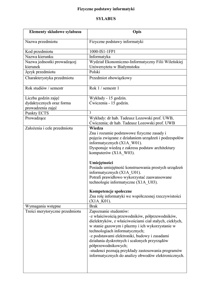 Fizyczne podstawy informatyki SYLABUS Elementy składowe sylabusu Opis Nazwa przedmiotu Fizyczne podstawy informatyki Kod przedmiotu Nazwa kierunku Nazwa jednostki prowadzącej kierunek Język przedmiotu Charakterystyka przedmiotu 1000-IS1-1FP1 Informatyka Wydział Ekonomiczno-Informatyczny Filii Wileńskiej Uniwersytetu w Białymstoku Polski Przedmiot obowiązkowy Rok studiów / semestr Rok 1 / semestr 1 Liczba godzin zajęć dydaktycznych oraz forma prowadzenia zajęć Punkty ECTS Prowadzące Wykłady - 15 godzin. Ćwiczenia - 15 godzin. Założenia i cele przedmiotu 3 Wykłady: dr hab. Tadeusz Lozowski prof. UWB, Ćwiczenia; dr hab. Tadeusz Lozowski prof. UWB Wiedza Zna i rozumie podstawowe fizyczne zasady i pojęcia związane z działaniem urządzeń i podzespołów informatycznych (X1A_W01). Dysponuje wiedzą z zakresu podstaw architektury komputerów (X1A_W03). Umiejętności Posiada umiejętność konstruowania prostych urządzeń informatycznych (X1A_U01). Potrafi prawidłowo wykorzystać zaawansowane technologie informatyczne (X1A_U03). Wymagania wstępne Treści merytoryczne przedmiotu Kompetencje społeczne Zna rolę informatyki we współczesnej rzeczywistości (X1A_K01). Brak Zapoznanie studentów: -z właściwością przewodników, półprzewodników, dielektryków, z właściwościami ciał stałych, ciekłych, w stanie gazowym i plazmy i ich wykorzystanie w technologiach informatycznych; -z podstawami elektroniki, budowy i zasadami działania dyskretnych i scalonych przyrządów półprzewodnikowych; -studenci poznają przykłady zastosowania programów informatycznych do analizy obwodów elektronicznych. Wykłady 1. Materia i jej formy. Wielkości fizyczne. System jednostek fizycznych SI. Pole elektryczne. Prąd elektryczny. Przewodniki i dyelektryki w polu elektrycznym. Pojemność elektryczna. Pamięć elektrostatyczna. 2. Własności elektryczne metali Przewodnictwo metali. Praca wyjścia elektronu z metalu. Kontaktowa różnica potencjałów. Emisja elektronu z metalu, emisja termoelektryczna i jej zastosowanie. 3. Prąd elektryczny w cieczach, zastosowanie. Chemiczne źródła prądu elektrycznego. Prąd elektryczny w gazach, zastosowanie. 4. Materiały półprzewodnikowe. Półprzewodniki. Prąd elektryczny w półprzewodnikach. Przyrządy półprzewodnikowe i ich zastosowanie. 5. Złącze p n. Właściwości złącza p n. Budowa i zasada działania dyskretnych przyrządów półprzewodnikowych (dioda półprzewodnikowa, tranzystor polowy, tranzystor bipolarny i tranzystor MOS). Wzmacniacze. Pamięci półprzewodnikowe. 6. Wzmacniacze elektroniczne. 6. Układy scalone. Mikro i Nano elektronowe technologie. Pamięci SRAM i DRAM. 7. Pole magnetyczne. Ciała diamagnetyczne, paramagnetyczne i ferromagnetyczne. Indukcja elektromagnetyczna. Drgania i fale elektromagnetyczne. Prąd zmienny. Zapis przechowanie i odczyt informacji w nośnikach magnetycznych. Pamięć stała. 8. Drgania i fale elektromagnetyczne ich właściwości. Skala fal elektromagnetycznych. Drgania w obwodzie LC. Drgania wymuszone i rezonans. Obwód otwarty. Zasady radio łączności. Modulacja i demodulacja. 9. Zapis, przechowanie i odczyt informacji w warstwach elektrofotograficznych. Zasady działania drukarki laserowej i atramentowej. 10. Zapis, odczyt i przechowanie informacji w nośnikach CD, DVD I Bly Ray, Holografia, Monitory. Zjawiska fizyczne wykorzystywane w monitorach. Monitor przyszłości. Ćwiczenia. Zagadnienia realizowane na ćwiczeniach odpowiadają treści wykładu. 1.Prąd elektryczny. Przewodnictwo, oporność. Rozwiązywanie zadań. 2. Łączenie elementów w obwodach. Analiza obwodów elektronicznych programem MicroCap 10 Evolution. Rozwiązywanie zadań.. 3. Kontaktowa różnica potencjałów. Zjawisko Seebecka i Peltiera. Ogniwo termoelektryczne. Rozwiązywanie zadań. Forma i warunki zaliczenia przedmiotu Wykaz literatury podstawowej i uzupełniającej 4. Złącze p-n. Zastosowanie złącza p-n. Tranzystory i ich zastosowania 5.Uklady elektroniczne ich charakterystyki i ich zastosowanie. 6.Budowa elementów pamięci elektronicznej. Rozwiązywanie zadań. 7. Kontrolna Zaliczenie na ocenę. Pierwszym warunkiem zaliczenia przedmiotu jest obecność na zajęciach ćwiczeniowych, (do 7 punktów ogólnej oceny, jedne zajęcie 1 punkt). Drugim warunkiem zaliczenia jest wymagane 2 prace kontrolne (do 23 punktów ogólnej oceny, oceniają się prace kontrolne, pierwsza praca kontrolna - 15 punktów, druga praca kontrolna - 13 punktów, ogółem – 23 punktów). Trzecim warunkiem zaliczenia przedmiotu jest wykonanie dwóch prac domowych – po 15 punktów, ogółem - 30 punktów Czwartym warunkiem zaliczenia przedmiotu jest pisemny sprawdzian - do 40 punktów ogólnej oceny. Końcowa ocena składa się z punktowego udziału tych trzech warunków. ((100-91)% - 5); ((90-81)% - 4,5); ((8071)% - 4); ((70-61)% - 3,5); ((50-60)% - 3,0). Literatura podstawowa i dodatkowa. Podstawowa. Bobrowski Cz. Fizyka: krótki kurs. WNT, W-wa, 2005 Hennel J. Podstawy elektroniki półprzewodnikowej; WNT, W-wa, 2003 Prince B. Nowoczesne pamięci półprzewodnikowe; WNT, W-wa, 1999 Kalisz J. Podstawy elektroniki cyfrowej; WKŁ, W-wa, 2007 Szostka J. Fale i anteny. WKL, 2001. Wojtuszkiewicz K. Urządzenia techniki komputerowej; cz 1, PWN SA, W-wa, 2007. Wojtuszkiewicz K. Urządzenia techniki komputerowej; cz 2, PWN SA, W-wa, 2007. Nawrocki W. Komputerowe systemy pomiarowe. WKL, 2006 Dodatkowa. Łukaszewski K. Wstęp do elektroniki kwantowej i optyki nieliniowej,Wydział FTIMS, Lódź, 1999. Suizdak T. Telekomunikacja światłowodowa; WNT, W-wa, 1998 A. Tamašauskas, J.Vosylius. Fizika. II d. V.: Mokslas, 1989, 195 p. S .Masiokas. Elektrotechnika. V. Mokslas, 1989, 424 p, B. Kukšas, S.Vičas, Fizika. 1, 2 T. V.: Mokslas, 1988, 256 p. A. Lašas ir kt. Pramoninė elektronika. I, 2 d; V.: Mokslas, 1991, 256 p. ………………………………. podpis osoby składającej sylabus