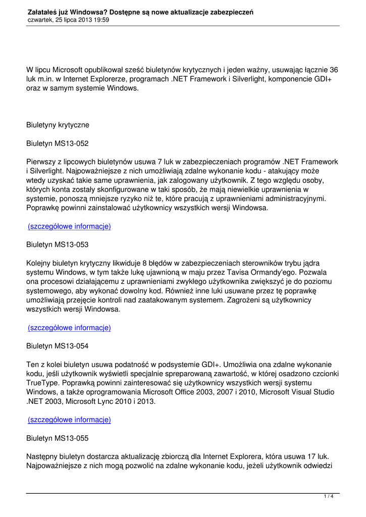 Załatałeś już Windowsa? Dostępne są nowe aktualizacje zabezpieczeń czwartek, 25 lipca 2013 19:59 W lipcu Microsoft opublikował sześć biuletynów krytycznych i jeden ważny, usuwając łącznie 36 luk m.in. w Internet Explorerze, programach .NET Framework i Silverlight, komponencie GDI+ oraz w samym systemie Windows. Biuletyny krytyczne Biuletyn MS13-052 Pierwszy z lipcowych biuletynów usuwa 7 luk w zabezpieczeniach programów .NET Framework i Silverlight. Najpoważniejsze z nich umożliwiają zdalne wykonanie kodu - atakujący może wtedy uzyskać takie same uprawnienia, jak zalogowany użytkownik. Z tego względu osoby, których konta zostały skonfigurowane w taki sposób, że mają niewielkie uprawnienia w systemie, ponoszą mniejsze ryzyko niż te, które pracują z uprawnieniami administracyjnymi. Poprawkę powinni zainstalować użytkownicy wszystkich wersji Windowsa. (szczegółowe informacje) Biuletyn MS13-053 Kolejny biuletyn krytyczny likwiduje 8 błędów w zabezpieczeniach sterowników trybu jądra systemu Windows, w tym także lukę ujawnioną w maju przez Tavisa Ormandy'ego. Pozwala ona procesowi działającemu z uprawnieniami zwykłego użytkownika zwiększyć je do poziomu systemowego, aby wykonać dowolny kod. Również inne luki usuwane przez tę poprawkę umożliwiają przejęcie kontroli nad zaatakowanym systemem. Zagrożeni są użytkownicy wszystkich wersji Windowsa. (szczegółowe informacje) Biuletyn MS13-054 Ten z kolei biuletyn usuwa podatność w podsystemie GDI+. Umożliwia ona zdalne wykonanie kodu, jeśli użytkownik wyświetli specjalnie spreparowaną zawartość, w której osadzono czcionki TrueType. Poprawką powinni zainteresować się użytkownicy wszystkich wersji systemu Windows, a także oprogramowania Microsoft Office 2003, 2007 i 2010, Microsoft Visual Studio .NET 2003, Microsoft Lync 2010 i 2013. (szczegółowe informacje) Biuletyn MS13-055 Następny biuletyn dostarcza aktualizację zbiorczą dla Internet Explorera, która usuwa 17 luk. Najpoważniejsze z nich mogą pozwolić na zdalne wykonanie kodu, jeżeli użytkownik odwiedzi 1/4 Załatałeś już Windowsa? Dostępne są nowe aktualizacje zabezpieczeń czwartek, 25 lipca 2013 19:59 specjalnie spreparowaną stronę - atakujący może wówczas uzyskać takie same uprawnienia, jak zalogowany użytkownik. Błędy znaleziono we wszystkich wersjach IE. Aktualizację należy zainstalować, nawet jeżeli na co dzień nie używamy przeglądarki Microsoftu, zdarza się bowiem, że inne, potrzebne nam oprogramowanie wykorzystuje komponenty Internet Explorera. (szczegółowe informacje) Biuletyn MS13-056 Kolejny biuletyn zabezpieczeń usuwa lukę w komponencie DirectShow. Umożliwia ona zdalne wykonanie kodu, jeżeli użytkownik otworzy specjalnie spreparowany plik graficzny (w formacie GIF). Efektywne wykorzystanie luki pozwala atakującemu na uzyskanie takich samych uprawnień, jak zalogowany lokalnie użytkownik. Błąd występuje we wszystkich wersjach systemu Windows z wyjątkiem RT, którą można znaleźć na tabletach. (szczegółowe informacje) Biuletyn MS13-057 Ten natomiast biuletyn likwiduje lukę w pakiecie kodeków Windows Media Format Runtime i programie Media Player. Umożliwia ona zdalne wykonanie kodu, jeżeli użytkownik otworzy specjalnie spreparowany plik multimedialny (w formacie WMV, nie mylić z niesławnym WMF). Atakujący może wówczas uzyskać takie same uprawnienia, jak zalogowany lokalnie użytkownik. Aktualizacja przeznaczona jest dla wszystkich wersji Windowsa. (szczegółowe informacje) Biuletyny ważne Biuletyn MS13-058 Ostatni z udostępnionych w tym miesiącu biuletynów został oznaczony jako ważny i dotyczy użytkowników programu Windows Defender w systemach Windows 7 i Windows Server 2008 R2. Usuwana luka pozwala na podniesienie uprawnień - atakujący, któremu uda się ją wykorzystać, będzie mógł przejąć kontrolę nad zaatakowanym systemem. Będzie mógł wówczas instalować programy, przeglądać, zmieniać i usuwać dane oraz tworzyć nowe konta z pełnymi uprawnieniami. 2/4 Załatałeś już Windowsa? Dostępne są nowe aktualizacje zabezpieczeń czwartek, 25 lipca 2013 19:59 (szczegółowe informacje) źródło: di.com.pl 3/4 Załatałeś już Windowsa? Dostępne są nowe aktualizacje zabezpieczeń czwartek, 25 lipca 2013 19:59 4/4