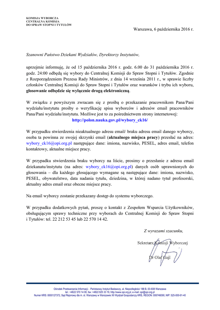 KOMISJA WYBORCZA CENTRALNA KOMISJA DO SPRAW STOPNI I TYTUŁÓW Warszawa, 6 października 2016 r. Szanowni Państwo Dziekani Wydziałów, Dyrektorzy Instytutów, uprzejmie informuję, że od 15 października 2016 r. godz. 6.00 do 31 października 2016 r. godz. 24:00 odbędą się wybory do Centralnej Komisji do Spraw Stopni i Tytułów. Zgodnie z Rozporządzeniem Prezesa Rady Ministrów, z dnia 14 września 2011 r., w sprawie liczby członków Centralnej Komisji do Spraw Stopni i Tytułów oraz warunków i trybu ich wyboru, głosowanie odbędzie się wyłącznie drogą elektroniczną. W związku z powyższym zwracam się z prośbą o przekazanie pracownikom Pana/Pani wydziału/instytutu prośby o weryfikację spisu wyborców i adresów email pracowników Pana/Pani wydziału/instytutu. Możliwe jest to za pośrednictwem strony internetowej: http://polon.nauka.gov.pl/wybory_ck16/ W przypadku stwierdzenia nieaktualnego adresu email/ braku adresu email danego wyborcy, osoba ta powinna ze swojej skrzynki email (aktualnego miejsca pracy) przesłać na adres: [email protected] następujące dane: imiona, nazwisko, PESEL, adres email, telefon kontaktowy, aktualne miejsce pracy. W przypadku stwierdzenia braku wyborcy na liście, prosimy o przesłanie z adresu email dziekanatu/instytutu (na adres: [email protected]) danych osób uprawnionych do głosowania – dla każdego głosującego wymagane są następujące dane: imiona, nazwisko, PESEL, obywatelstwo, data nadania tytułu, dziedzina, w której nadano tytuł profesorski, aktualny adres email oraz obecne miejsce pracy. Na email wyborcy zostanie przekazany dostęp do systemu wyborczego. W przypadku dodatkowych pytań, proszę o kontakt z Zespołem Wsparcia Użytkowników, obsługującym sprawy techniczne przy wyborach do Centralnej Komisji do Spraw Stopni i Tytułów: tel. 22 212 53 45 lub 22 570 14 42. Z wyrazami szacunku, Ośrodek Przetwarzania Informacji - Państwowy Instytut Badawczy, al. Niepodległości 188 B, 00-608 Warszawa tel.: +4822 570 14 00, fax: +4822 825 33 19, http://www.opi.org.pl, e-mail: [email protected] Numer KRS: 0000127372, Sąd Rejonowy dla m. st. Warszawy w Warszawie XII Wydział Gospodarczy KRS, REGON: 006746090, NIP: 525-000-91-40