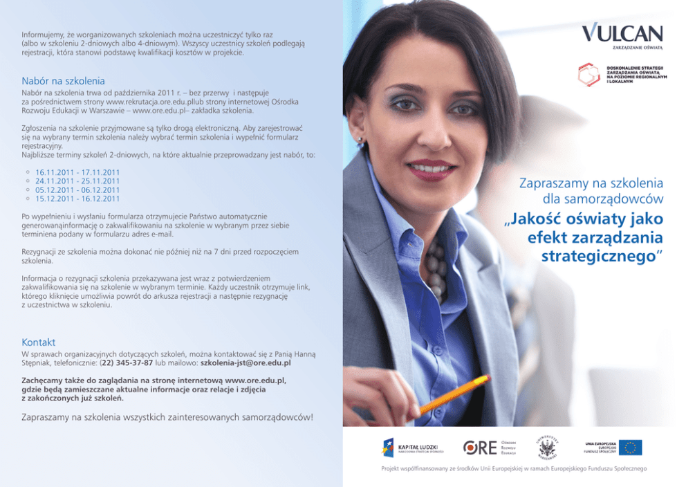 Informujemy, że worganizowanych szkoleniach można uczestniczyć tylko raz (albo w szkoleniu 2-dniowych albo 4-dniowym). Wszyscy uczestnicy szkoleń podlegają rejestracji, która stanowi podstawę kwalifikacji kosztów w projekcie. Nabór na szkolenia Nabór na szkolenia trwa od października 2011 r. – bez przerwy i następuje za pośrednictwem strony www.rekrutacja.ore.edu.pllub strony internetowej Ośrodka Rozwoju Edukacji w Warszawie – www.ore.edu.pl– zakładka szkolenia. Zgłoszenia na szkolenie przyjmowane są tylko drogą elektroniczną. Aby zarejestrować się na wybrany termin szkolenia należy wybrać termin szkolenia i wypełnić formularz rejestracyjny. Najbliższe terminy szkoleń 2-dniowych, na które aktualnie przeprowadzany jest nabór, to: 16.11.2011 - 17.11.2011 24.11.2011 - 25.11.2011 05.12.2011 - 06.12.2011 15.12.2011 - 16.12.2011 Po wypełnieniu i wysłaniu formularza otrzymujecie Państwo automatycznie generowanąinformację o zakwalifikowaniu na szkolenie w wybranym przez siebie terminiena podany w formularzu adres e-mail. Rezygnacji ze szkolenia można dokonać nie później niż na 7 dni przed rozpoczęciem szkolenia. Zapraszamy na szkolenia dla samorządowców „Jakość oświaty jako efekt zarządzania strategicznego” Informacja o rezygnacji szkolenia przekazywana jest wraz z potwierdzeniem zakwalifikowania się na szkolenie w wybranym terminie. Każdy uczestnik otrzymuje link, którego kliknięcie umożliwia powrót do arkusza rejestracji a następnie rezygnację z uczestnictwa w szkoleniu. Kontakt W sprawach organizacyjnych dotyczących szkoleń, można kontaktować się z Panią Hanną Stępniak, telefonicznie: (22) 345-37-87 lub mailowo: [email protected] Zachęcamy także do zaglądania na stronę internetową www.ore.edu.pl, gdzie będą zamieszczane aktualne informacje oraz relacje i zdjęcia z zakończonych już szkoleń. Zapraszamy na szkolenia wszystkich zainteresowanych samorządowców! Projekt współfinansowany ze środków Unii Europejskiej w ramach Europejskiego Funduszu Społecznego Jednym z działań realizowanych w projekcie „Doskonalenie strategii zarządzania oświatą na poziomie regionalnym i lokalnym”przez Ośrodek Rozwoju Edukacjisą szkolenia adresowane do przedstawicieli samorządów (gminnych, powiatowych i wojewódzkich). Szkolenia realizowane są przez spółkę VULCAN – Instytut Zarządzania w Edukacji – wyłonioną w trybie ustawy o zamówieniach publicznych. Cele i programy szkoleń Postępująca decentralizacja zarządzania oświatą powoduje wzrost kompetencji, ale i odpowiedzialności jednostek samorządu terytorialnego za trafność decyzji i efektywność działań podejmowanych w obszarze lokalnej edukacji. Samorząd z jednej strony musi prowadzić lokalną politykę oświatową w taki sposób, aby zaspokajać potrzeby mieszkańców, z drugiej strony jednak realizować ją w oparciu wymagania państwa w zakresie oświaty. Aby wyjść naprzeciw potrzebom samorządów terytorialnych w tym zakresie oraz pomóc w radzeniu sobie z nowymi kompetencjami, proponujemy uczestnictwo w szkoleniach, których celem jest doskonalenie umiejętności efektywnego i skutecznego zarządzania lokalną oświatą. Podczas szkoleń: zapoznajemy uczestników z najnowocześniejszymi instrumentami zarządzania oświatą na poziomie lokalnym; pomagamy interpretować i wykorzystywać wskaźniki oświatowe, wskaźniki odniesienia, raportyz ewaluacji zewnętrznych szkół i placówek, dane dotyczące wyników egzaminów zewnętrznych i edukacyjnej wartości dodanej – EWD; przedstawiamy modele sporządzania informacji o stanie realizacji zadań oświatowych oraz zapoznajemy z dobrymi praktykami w tym zakresie; pomagamy budować lokalne strategie oświatowe „krok po kroku”. Dwa autorskie programy szkoleń „Jakość oświaty jako efekt zarządzania strategicznego” przygotowane zostały przez grupę ekspertów (także samorządowców) współpracujących z Zespołem Ośrodka Rozwoju Edukacji dla dwóch grup odbiorców szkoleń. Adresaci szkoleń Szkolenia organizowane są dla dwóch grup odbiorców: decydentów – szkolenie 2-dniowe oraz pracowników bezpośrednio odpowiedzialnych za wykonywanie zadań oświatowych – 4-dniowe szkolenie. Szkolenia 2-dniowe (14 godzin dydaktycznych)– to szkolenia o charakterze dyskusyjnopanelowym, kierowane głównie do decydentów. Ich celem jest przybliżenie zagadnień z zakresu zarządzania strategicznego oświatą oraz wykorzystywania w tym procesie określonych narzędzi czy modeli na szczeblu decydentów- menadżerów. Prowadzący szkolenia koncentrują się na tym, co i w jaki sposób może wykorzystać samorząd, aby lepiej diagnozować stan lokalnej oświaty orazco zrobić, aby podnieść jej jakość, posługując się ekspertyzami i studiami przypadków wypracowanymi w projekcie. Do uczestnictwa w tych szkoleniach zachęcamy szczególnie:starostów, prezydentów, burmistrzów, wójtów, przewodniczących rad gminnychi powiatowych, przewodniczących komisji oświaty oraz radnych.Dodatkowym celem szkoleń-seminariów jest zachęcenie decydentów do oddelegowania na szkolenie tematyczne pracowników wydziałów oświaty ich urzędu. Szkolenia 4-dniowe (30 godzin dydaktycznych) – to szkolenia o charakterze poznawczowarsztatowym. Ich celem jest zapoznanie osób bezpośrednio zajmujących się w samorządach oświatą z narzędziami i modelami wykorzystywanymi w procesie strategicznego zarządzania oraz praktyczne ichprzećwiczenie. Szkolenie ma podnieść gotowość jego uczestników do całościowego postrzegania lokalnej oświaty oraz doskonalenia własnych umiejętności w zakresie planowania, tworzenia i wdrażania lokalnej polityki oświatowej, wprowadzania modyfikacji działań realizowanych w oparciu o przyjętą i monitorowaną strategię, analizowania i oceniania danych (wskaźników)o stanie realizacji zadań oświatowych, a także tworzenia mechanizmów dyskutowania o oświa