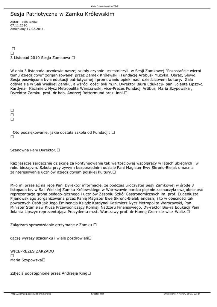 Koło Dziennikarskie ZSG Sesja Patriotyczna w Zamku Królewskim Autor: Ewa Bielak 07.11.2010. Zmieniony 17.02.2011. 3 Listopad 2010 Sesja Zamkowa W dniu 3 listopada uczniowie naszej szkoły czynnie uczestniczyli w Sesji Zamkowej "Pozostańcie wierni temu dziedzictwu" zorganizowanej przez Zamek Królewski i Fundację Artibus- Muzyka, Obraz, Słowo. Sesja poświęcona była edukacji patriotycznej i promowaniu opieki nad dziedzictwem kultury. Gala odbyła się w Sali Wielkiej Zamku, a wśród gości byli m.in. Dyrektor Biura Edukacji- pani Jolanta Lipszyc, Kardynał Kazimierz Nycz Metropolita Warszawski, vice-Prezes Fundacji Artibus Maria Szypowska , Dyrektor Zamku prof. dr hab. Andrzej Rottermund oraz inni. Oto podziękowanie, jakie dostała szkoła od Fundacji: Szanowna Pani Dyrektor, Raz jeszcze serdecznie dziękuję za kontynuowanie tak wartościowej współpracy w latach ubiegłych i w roku bieżącym. Szkoła przy żywym bezpośrednim udziale Pani Magister Ewy Skrońc-Bielak umacnia zainteresowanie uczniów dziedzictwem polskiej kultury. Miło mi przesłać na ręce Pani Dyrektor informację, że podczas uroczystej Sesji Zamkowej w środę 3 listopada br. w Sali Wielkiej Zamku Królewskiego w War-szawie bardzo pięknie zaznaczyła swą obecność reprezentacja grona pedago-gicznego i uczniów Zespołu Szkół Gastronomicznych im. prof. Eugeniusza Pijanowskiego zorganizowana przez Panią Magister Ewę Skrońc-Bielak – i to w obecności tak poważnych Osób jak Jego Eminencja Ksiądz Kardynał Kazimierz Nycz Metropolita Warszawski, Pan Minister Stanisław Kluza Przewodniczący Komisji Nadzoru Finansowego, Dy-rektor Biu-ra Edukacji Pani Jolanta Lipszyc reprezentująca Prezydenta m.st. Warszawy prof. dr Hannę Gron-kie-wicz-Waltz. Załączam sprawozdanie otrzymane z Zamku Łączę wyrazy szacunku i wiele pozdrowień WICEPREZES ZARZĄDU Maria Szypowska Zdjęcia udostępnione przez Andrzeja Ring http://admzsg.edu.pl/dziennikarskie Kreator PDF Utworzono 7 March, 2017, 02:24