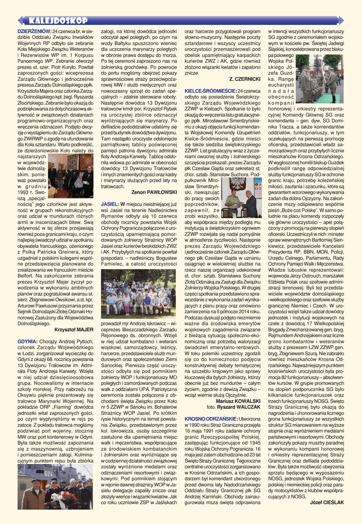 kalejdoskop DZIERŻENIÓW: 24 czerwca br. w siedzibie Oddziału Związku Inwalidów Wojennych RP odbyło sie zebranie Koła Miejskiego Związku Weteranów i Rezerwistów WP im. 1 Korpusu Pancernego WP. Zebranie otworzył prezes st. szer. Piotr Kuryło. Powitał zaproszonych gości: wiceprezesa Zarządu Głównego i jednocześnie prezesa Zarządu Dolnośląskiego ppłk. Krzysztofa Majera oraz członka Zarządu Dolnośląskiego kpt. żegl. Ryszarda Złocińskiego. Zebranie było okazją do podziękowania za dotychczasową aktywność w związkowych działaniach programowo-organizacyjnych oraz wręczenia odznaczeń. Podjęto decyzję o wystąpieniu do Zarządu Głównego ZWiRWP o zgodę na ufundowanie dla Koła sztandaru. Warto podkreślić, że dzierżoniowskie Koło należy do najstarszych w województwie dolnośląskim, ponieważ powstało w grudniu 1993 r. Swoistą „specjalnością” jego członków jest aktywność w grupach rekonstrukcyjnych oraz udział w mundurach różnych armii w inscenizacjach bitew. Swą aktywność w tej sferze przejawiają również poza granicami kraju, o czym najlepiej świadczył udział w spotkaniu obywatela francuskiego, ożenionego z Polką Patricka Greinera, który uzgadniał z polskimi kolegami wspólne przedsięwzięcia planowane do zrealizowania we francuskim mieście Belfort. Na zakończenie zebrania prezes Krzysztof Majer życzył powodzenia w wykonaniu ambitnych planów oraz pogratulował awansu st. sierż. Zbigniewowi Owsikowi, a st. kpr. Arturowi Pawlusowi przyznania przez Sejmik Dolnośląski Złotej Odznaki Honorowej Zasłużony dla Województwa Dolnośląskiego. Krzysztof MAJER GDYNIA: Chorąży Andrzej Pytloch, członek Zarządu Wojewódzkiego w Łodzi, zorganizował wycieczkę do Gdyni z okazji 68. rocznicy powstania 13 Dywizjonu Trałowców im. Admirała Floty Andrzeja Karwety. Wzięła w niej udział dziesięcioosobowa grupa. Nocowaliśmy w internacie szkoły morskiej. Przy nabrzeżu na Oksywiu pięknie prezentowały się trałowce Marynarki Wojennej. Na pokładzie ORP „Flaming” dowódca jednostki witał zaproszonych gości, po czym wypłynęliśmy w rejs po zatoce. Z pokładu trałowca mogliśmy podziwiać port wojenny, stocznię MW oraz port kontenerowy w Gdyni. Była także możliwość zapoznania się z maszynownią, uzbrojeniem i pomieszczeniami załogi. Kulminacyjnym punktem rejsu była zbiórka załogi, na której dowódca jednostki odczytał apel poległych, po czym na wody Bałtyku spuszczono wieniec dla uczczenia marynarzy poległych w obronie prawa dostępu do morza. Po tej ceremonii zaproszono nas na żołnierską grochówkę. Po powrocie do portu mogliśmy obejrzeć pokazy sprawnościowe straży przeciwpożarowej MW i służb medycznych oraz nowoczesny sprzęt do zadań specjalnych – zdalnie sterowane roboty. Następnie dowódca 13 Dywizjonu trałowców kmdr por. Krzysztof Rybak na uroczystej zbiórce odznaczył wyróżniających się marynarzy. Po defiladzie pododdziałów udaliśmy się przed budynek dowództwa dywizjonu. Tam nastąpiło uroczyste odsłonięcie pamiątkowej tablicy poświęconej pamięci patrona dywizjonu admirała floty Andrzeja Karwety. Tablicę odsłoniła wdowa po admirale w obecności dowódcy 13 Dywizjonu Trałowców i innych znamienitych gości oraz kadry i marynarzy służących przed laty na trałowcach. Zenon PAWŁOWSKI JASIEL: W miejscu nieistniejącej już wsi Jasiel na terenie Nadleśnictwa Rymanów odbyły się 10 czerwca obchody rocznicy powstania Wojsk Ochrony Pogranicza połączone z uroczystością upamiętniającą pomordowanych żołnierzy Strażnicy WOP Jasiel oraz kurierów beskidzkich ZWZ i AK. Przybyłych na spotkanie powitał gospodarz – nadleśniczy Bogusław Famielec, a całość uroczystości prowadził mjr Andrzej Iskrowicz – wiceprezes Bieszczadzkiego Zarządu Rejonowego ds. obronnych. Wzięli w niej udział kombatanci i weterani wojskowi, samorządowcy, leśnicy, harcerze, przedstawiciele służb mundurowych oraz społeczeństwo Ziemi Sanockiej. Pierwsza część uroczystości odbyła się pod pomnikiem żołnierzy WOP i funkcjonariuszy MO poległych i zamordowanych podczas walk z oddziałami UPA. Patriotyczna ceremonia została połączona z obchodami święta Związku przez Koło nr 5 ZŻWP w Sanoku im. Bohaterów Strażnicy WOP Jasiel. Po krótkim rysie historycznym na temat powstania Związku, przedstawionym przez kol. Iskrowicza, osoby szczególnie zasłużone dla upamiętniania miejsc walk i męczeństwa, współpracujące ze środowiskiem kombatanckim i żołnierskim oraz wyróżniające się w codziennej działalności związkowej zostały wyróżnione medalami oraz odznaczeniami resortowymi i związkowymi. Pod pomnikiem stojącym w rejonie dawnej strażnicy WOP w Jasielu delegacje zapaliły znicze oraz złożyły wieńce i wiązanki kwiatów. Jak co roku uczniowie ZSP w Jaśliskach oraz harcerze przygotowali program słowno-muzyczny. Następnie poczty sztandarowe i wszyscy uczestnicy uroczystości przemaszerowali pod obelisk upamiętniający karpackich kurierów ZWZ i AK, gdzie również złożono wiązanki kwiatów i zapalono znicze. Z. CZERNICKI KIELCE-ŚRÓDMIEŚCIE: 24 czerwca odbyło się posiedzenie Świętokrzyskiego Zarządu Wojewódzkiego ZŻWP w Kielcach. Spotkanie to było okazją do wręczenia listu gratulacyjnego ppłk. Mirosławowi Smerdzyńskiemu z okazji objęcia funkcji komendanta Wojskowej Komendy Uzupełnień Kielce-Śródmieście, gdzie mieści się także siedziba świętokrzyskiego ZŻWP. List gratulacyjny wraz z życzeniami owocnej służby i żołnierskiego szczęścia przekazali: prezes Zarządu płk Czesław Gajda oraz sekretarz st. chor. sztab. Stanisław Suchora. Podpułkownik Mirosław Smerdzyński, nawiązując do pracy swoich poprzedników, zapewnił, że zrobi wszystko, aby współpraca między podległą mu instytucją a świętokrzyskim ogniwem ZŻWP rozwijała się nadal pomyślnie w atmosferze życzliwości. Następnie 