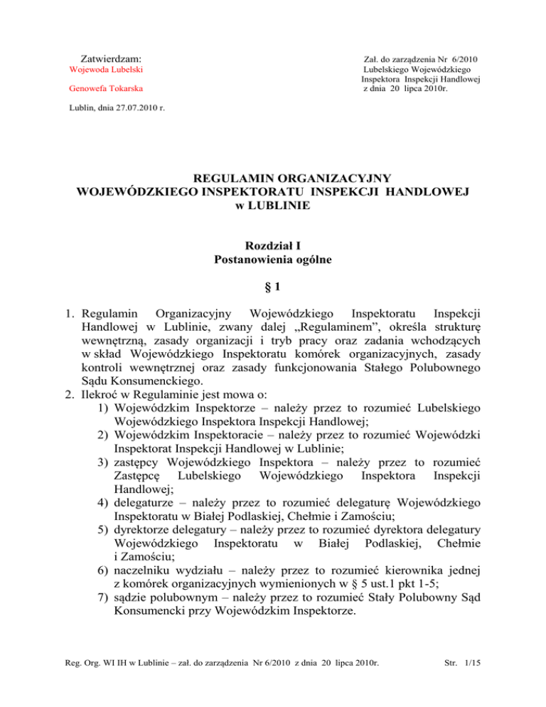 Zał. do zarządzenia Nr 6/2010 Lubelskiego Wojewódzkiego Inspektora Inspekcji Handlowej z dnia 20 lipca 2010r. Zatwierdzam: Wojewoda Lubelski Genowefa Tokarska Lublin, dnia 27.07.2010 r. Lublin, dnia ..........................2010 r. REGULAMIN ORGANIZACYJNY WOJEWÓDZKIEGO INSPEKTORATU INSPEKCJI HANDLOWEJ w LUBLINIE Rozdział I Postanowienia ogólne §1 1. Regulamin Organizacyjny Wojewódzkiego Inspektoratu Inspekcji Handlowej w Lublinie, zwany dalej „Regulaminem”, określa strukturę wewnętrzną, zasady organizacji i tryb pracy oraz zadania wchodzących w skład Wojewódzkiego Inspektoratu komórek organizacyjnych, zasady kontroli wewnętrznej oraz zasady funkcjonowania Stałego Polubownego Sądu Konsumenckiego. 2. Ilekroć w Regulaminie jest mowa o: 1) Wojewódzkim Inspektorze – należy przez to rozumieć Lubelskiego Wojewódzkiego Inspektora Inspekcji Handlowej; 2) Wojewódzkim Inspektoracie – należy przez to rozumieć Wojewódzki Inspektorat Inspekcji Handlowej w Lublinie; 3) zastępcy Wojewódzkiego Inspektora – należy przez to rozumieć Zastępcę Lubelskiego Wojewódzkiego Inspektora Inspekcji Handlowej; 4) delegaturze – należy przez to rozumieć delegaturę Wojewódzkiego Inspektoratu w Białej Podlaskiej, Chełmie i Zamościu; 5) dyrektorze delegatury – należy przez to rozumieć dyrektora delegatury Wojewódzkiego Inspektoratu w Białej Podlaskiej, Chełmie i Zamościu; 6) naczelniku wydziału – należy przez to rozumieć kierownika jednej z komórek organizacyjnych wymienionych w § 5 ust.1 pkt 1-5; 7) sądzie polubownym – należy przez to rozumieć Stały Polubowny Sąd Konsumencki przy Wojewódzkim Inspektorze. Reg. Org. WI IH w Lublinie – zał. do zarządzenia Nr 6/2010 z dnia 20 lipca 2010r. Str. 1/15 §2 Wojewódzki Inspektorat działa na podstawie: 1) ustawy z dnia 15 grudnia 2000 r. o Inspekcji Handlowej (Dz. U. z 2009 r. Nr 151, poz. 1219) i aktów wykonawczych wydanych na jej podstawie; 2) zarządzenia nr 114 Wojewody Lubelskiego z dnia 1 lipca 1999 r. w sprawie utworzenia delegatur Wojewódzkiego Inspektoratu Inspekcji Handlowej w Lublinie; 3) Statutu Lubelskiego Urzędu Wojewódzkiego w Lublinie; 4) Statutu Wojewódzkiego Inspektoratu Inspekcji Handlowej; 5) niniejszego regulaminu; 6) innych przepisów szczególnych. §3 Sąd polubowny działa na podstawie: 1) ustawy z dnia 15 grudnia 2000 r. o Inspekcji Handlowej (Dz. U. z 2009 r. Nr 151, poz. 1219); 2) ustawy z dnia 17 listopada 1964 r. – Kodeks postępowania cywilnego (Dz. U. Nr 43, poz. 296 z późn. zm.); 3) rozporządzenia Ministra Sprawiedliwości z dnia 25 września 2001 r. w sprawie określenia regulaminu organizacji i działania stałych polubownych sądów konsumenckich (Dz. U. Nr 113, poz. 1214); 4) umowy o zorganizowaniu sądu. §4 Wojewódzki Inspektor wykonuje w imieniu Wojewody Lubelskiego zadania Inspekcji Handlowej na obszarze województwa lubelskiego. Rozdział II Struktura organizacyjna §5 1. W skład Wojewódzkiego Inspektoratu wchodzą następujące komórki organizacyjne: 1) Wydział Kontroli Artykułów Żywnościowych i Gastronomii ŻG; 2) Wydział Kontroli Paliw, Artykułów Przemysłowych i Usług PU; 3) Wydział Nadzoru Rynku i Bezpieczeństwa Produktów NB; 4) Wydział Prawno-Organizacyjny i Ochrony Konsumentów POK; 5) Wydział Budżetowo-Administracyjny BA; 6) Stanowisko ds. Kadr i Szkolenia KS; Reg. Org. WI IH w Lublinie – zał. do zarządzenia Nr 6/2010 z dnia 20 lipca 2010r. Str. 2/15 7) Pełnomocnik ds. Ochrony Informacji Niejawnych IN; 8) Delegatura w Białej Podlaskiej BP; 9) Delegatura w Chełmie CH; 10) Delegatura w Zamościu ZA. 2. Przy Wojewódzkim Inspektorze działa sąd polubowny, obsługiwany przez sekretariat sądu polubownego (SPSK),. 3. Delegatura: 1) w Białej Podlaskiej obejmuje swoim zasięgiem działania powiaty: bialski, łukowski, parczewski, radzyński i miasto Biała Podlaska; 2) w Chełmie obejmuje swoim zasięgiem działania powiaty: chełmski, włodawski, krasnostawski i miasto Chełm; 3) w Zamościu obejmuje swoim zasięgiem działania powiaty: biłgorajski, hrubieszowski, tomaszowski, zamojski i miasto Zamość. 4. Schemat struktury organizacyjnej Wojewódzkiego Inspektoratu stanowi załącznik do Regulaminu. §6 1. W skład delegatury wchodzą: 1) zespół kontroli; 2) stanowisko ds. prawnych; 3) stanowisko ds. ochrony konsumentów. 2. Delegatury stanowią integralną część Wojewódzkiego Inspektoratu. Rozdział III Zasady kierowania pracą Wojewódzkiego Inspektoratu §7 1. Pracą Wojewódzkiego Inspektoratu kieruje Wojewódzki Inspektor przy pomocy zastępcy Wojewódzkiego Inspektora, dyrektorów delegatur oraz naczelników wydziałów. 2. W czasie nieobecności Wojewódzkiego Inspektora jego zadania wykonuje zastępca Wojewódzkiego Inspektora. 3. W razie jednoczesnej nieobecności Wojewódzkiego Inspektora i jego zastępcy, pracą Wojewódzkiego Inspektoratu kieruje wyznaczony imiennie przez Wojewódzkiego Inspektora naczelnik wydziału, który może wydawać dyspozycje wyłącznie w sprawach niecierpiących zwłoki, z wyłączeniem spraw budżetowych i kadrowych. 4. Pracą Wydziału Budżetowo-Administracyjnego kieruje Główny Księgowy. Reg. Org. WI IH w Lublinie – zał. do zarządzenia Nr 6/2010 z dnia 20 lipca 2010r. Str. 3/15 5. Naczelnika wydziału lub dyrektora delegatury zastępuje pracownik wyznaczony przez Wojewódzkiego Inspektora na wniosek naczelnika wydziału lub dyrektora delegatury. 6. Pełnomocnika ds. Ochrony Informacji Niejawnych wyznacza Wojewódzki Inspektor. 7. Pracą sekretariatu sądu polubownego kieruje sekretarz. §8 1. Do wyłącznych w szczególności: kompetencji Wojewódzkiego Inspektora należy 1) zawieranie i rozwiązywanie umów o pracę z pracownikami Wojewódzkiego Inspektoratu, dokonywanie przeszeregowań i awansów pracowników, ustalanie wysokości wynagrodzeń; 2) zatwierdzanie planów finansowych Wojewódzkiego Inspektoratu i dysponowanie środkami budżetowymi; 3) ustalanie o