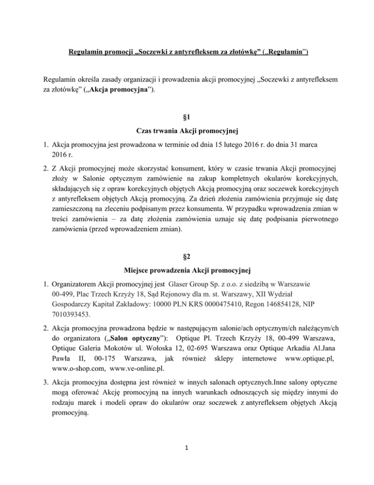 Regulamin promocji „Soczewki z antyrefleksem za złotówkę” („ Regulamin ”) Regulamin określa zasady organizacji i prowadzenia akcji promocyjnej „Soczewki z antyrefleksem za złotówkę” („ Akcja promocyjna ”). §1 Czas trwania Akcji promocyjnej 1. Akcja promocyjna jest prowadzona w terminie od dnia 15 lutego 2016 r. do dnia 31 marca 2016 r. 2. Z Akcji promocyjnej może skorzystać konsument, który w czasie trwania Akcji promocyjnej złoży w Salonie optycznym zamówienie na zakup kompletnych okularów korekcyjnych, składających się z opraw korekcyjnych objętych Akcją promocyjną oraz soczewek korekcyjnych z antyrefleksem objętych Akcją promocyjną. Za dzień złożenia zamówienia przyjmuje się datę zamieszczoną na zleceniu podpisanym przez konsumenta. W przypadku wprowadzenia zmian w treści zamówienia – za datę złożenia zamówienia uznaje się datę podpisania pierwotnego zamówienia (przed wprowadzeniem zmian). §2 Miejsce prowadzenia Akcji promocyjnej 1. Organizatorem Akcji promocyjnej jest Glaser Group Sp. z o.o. z siedzibą w Warszawie 00499, Plac Trzech Krzyży 18, Sąd Rejonowy dla m. st. Warszawy, XII Wydział Gospodarczy Kapitał Zakładowy: 10000 PLN KRS 0000475410, Regon 146854128, NIP 7010393453. 2. Akcja promocyjna prowadzona będzie w następującym salonie/ach optycznym/ch należącym/ch do organizatora („ Salon optyczny ”): Optique Pl. Trzech Krzyży 18, 00499 Warszawa, Optique Galeria Mokotów ul. Wołoska 12, 02695 Warszawa oraz Optique Arkadia Al.Jana Pawła II, 00175 Warszawa, jak również sklepy internetowe www.optique.pl, www.oshop.com, www.veonline.pl. 3. Akcja promocyjna dostępna jest również w innych salonach optycznych.Inne salony optyczne mogą oferować Akcję promocyjną na innych warunkach odnoszących się między innymi do rodzaju marek i modeli opraw do okularów oraz soczewek z antyrefleksem objętych Akcją promocyjną. 1 §3 Czas i Zasady Akcji promocyjnej 1. W ramach Akcji promocyjnej konsument otrzymuje możliwość zakupienia kompletnych okularów korekcyjnych składających się z: 1.1. opraw okularowych marek określonych w załączniku nr 1 do Regulaminu po cenie obowiązującej w Salonie optycznym („ Oprawy ”) oraz 1.2. soczewek korekcyjnych z antyrefleksem określonymi w załączniku nr 2 do Regulaminu do Opraw („ Soczewki ”), w promocyjnej cenie jeden (1) złoty brutto. 2. Akcja promocyjna dotyczy wyłącznie modeli Opraw znajdujących się w bieżącej ofercie Salonu optycznego. Szczegóły dotyczące konkretnych modeli Opraw objętych Akcją promocyjną są dostępne w Salonie optycznym. 3. Akcja promocyjna dotyczy wyłącznie wybranych rodzajów Soczewek określonych w załączniku nr 2 do Regulaminu. 4. Brak jest możliwości zamontowania Soczewek nabytych w cenie promocyjnej w ramach Akcji promocyjnej do innych opraw niż Oprawy. §4 Postanowienia końcowe 1. Wszelką korespondencję związaną z Akcją promocyjną należy kierować na adres Salonu optycznego. 2. Dodatkowe informacje związane z Akcją promocyjną można uzyskać w Salonie optycznym. Załączniki: 1. Lista marek opraw okularowych objętych Akcją promocyjną; 2. Lista rodzajów soczewek korekcyjnych z antyrefleksem objętych Akcją promocyjną. 2 Załącznik 1. Lista marek opraw okularowych objętych Akcją promocyjną: RayBan modele z tworzywa (plastikowego) od ceny 339,00 zł. W promocji nie biorą udziału oprawy typu patent, na żyłkę, metalowe, liteforce i light ray; Oakley modele z tworzywa (plastikowego) od ceny 419,00 zł. W promocji nie biorą udziału oprawy typu patent, na żyłkę, metalowe; Vogue modele z tworzywa (plastikowego) od ceny 299,00 zł. W promocji nie biorą udziału oprawy typu patent, na żyłkę, metalowe. Załącznik 2. Lista rodzajów soczewek korekcyjnych z antyrefleksem objętych Akcją promocyjną: Magazynowe soczewki jednoogniskowe Essilor Orma Trio (przy zakupie opraw marki RayBan lub Oakley) oraz magazynowe soczewki jednoogniskowe Essilor Smile 1,5 HC (przy zakupie opraw marki Vogue). 3