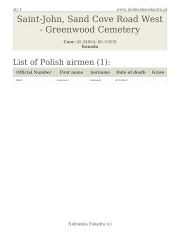 str.1 www.niebieskaeskadra.pl Saint-John, Sand Cove Road West - Greenwood Cemetery Coor.:45.24064,-66.10209 Kanada List of Polish airmen (1): Official Number 76823 First name Kazimierz Surname Kotłowski Niebieska Eskadra (c) Date of death 1973-06-12 Grave