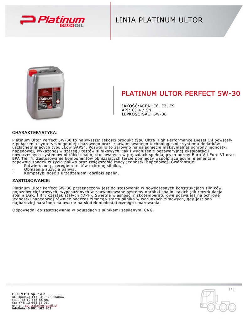 LINIA PLATINUM ULTOR PLATINUM ULTOR PERFECT 5W30 JAKOŚĆ: JAKOŚĆ:ACEA: E6, E7, E9 API: CJ4 / SN LEPKOŚĆ: LEPKOŚĆ:SAE: 5W30 CHARAKTERYSTYKA: Platinum Ultor Perfect 5W30 to najwyższej jakości produkt typu Ultra High Performance Diesel Oil powstały z połączenia syntetycznego oleju bazowego oraz zaawansowanego technologicznie systemu dodatków uszlachetniających typu „Low SAPS”. Pozwoliło to zarówno na osiągnięcie maksymalnej ochrony jednostki napędowej, wykazanej w szeregu testów silnikowych, jak i wydłużenie bezawaryjnej eksploatacji nowoczesnych systemów obróbki spalin, stosowanych w pojazdach spełniających normy Euro V i Euro VI oraz EPA Tier 4. Zastosowanie komponentów obniżających tarcie pomiędzy współpracującymi elementami zapewnia spadek zużycia paliwa oraz zwiększenie mocy jednostki napędowej. Gwarantuje: · Potwierdzoną szeregiem testów ochronę silnika, · Obniżenie zużycia paliwa, · Kompatybilność z urządzeniami obróbki spalin. ZASTOSOWANIE: Platinum Ultor Perfect 5W30 przeznaczony jest do stosowania w nowoczesnych konstrukcjach silników pojazdów ciężarowych, wyposażonych w zaawansowane systemy obróbki spalin, takich jak recyrkulacja spalin EGR, filtry cząstek stałych (DPF). Świetne własności niskotemperaturowe pozwalają na ochronę jednostki napędowej również podczas zimnego startu silnika w warunkach zimowych, gdy jest ona najbardziej narażona na awarie na skutek niedostatecznego smarowania. Odpowiedni do zastosowania w pojazdach z silnikami zasilanymi CNG. ORLEN OIL Sp. z o.o. ul. Opolska 114, 31323 Kraków, tel. +48 12 665 55 00, fax +48 12 665 55 01, email: [email protected], infolinia: 0 801 102 103 LINIA PLATINUM ULTOR NORMY, APROBATY, SPECYFIKACJE: Scania LA MBApproval 228.51 MAN M3477 MAN M3677 VOLVO VDS4 MACK EOO PREMIUM PLUS 07 RENAULT VI RLD3 MERCEDESBENZ MB228.31, Spełnia wymagania: CUMMINS CES 20078, CES 20081 DETROIT DIESEL EXTRANET 93K218 DEUTZ DQC IV10 LA JASO DH2 MTU TYPE 3.1 VOLVO VDS3 PARAMETRY klasa lepkości SAE lepkość kinematyczna w temp. 1000C wskaźnik lepkości Całkowita liczba zasadowa JEDNOSTKI WARTOŚCI TYPOWE 5W30 mm2/s 11,5 160 mgKOH/g 10 temperatura płynięcia 0C 45 temperatura zapłonu 0C 224 UWAGA: Powyższe wartości parametrów fizykochemicznych są wartościami typowymi. Wartości rzeczywiste są umieszczane na świadectwach jakości dołączanych do każdej partii produktu. ORLEN OIL Sp. z o.o. ul. Opolska 114, 31323 Kraków, tel. +48 12 665 55 00, fax +48 12 665 55 01, email: [email protected], infolinia: 0 801 102 103