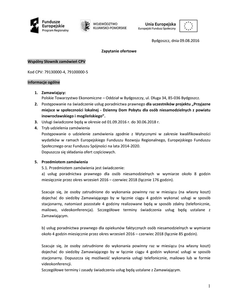 Bydgoszcz, dnia 09.08.2016 Zapytanie ofertowe Wspólny Słownik zamówień CPV Kod CPV: 79130000-4, 79100000-5 Informacje ogólne 1. Zamawiający: Polskie Towarzystwo Ekonomiczne – Oddział w Bydgoszczy, ul. Długa 34, 85-036 Bydgoszcz. 2. Postępowanie na świadczenie usług poradnictwa prawnego dla uczestników projektu „Przyjazne miejsce w społeczności lokalnej - Dzienny Dom Pobytu dla osób niesamodzielnych z powiatu inowrocławskiego i mogileńskiego”. 3. Usługi świadczone będą w okresie od 01.09.2016 r. do 30.06.2018 r. 4. Tryb udzielenia zamówienia Postępowanie o udzielenie zamówienia zgodnie z Wytycznymi w zakresie kwalifikowalności wydatków w ramach Europejskiego Funduszu Rozwoju Regionalnego, Europejskiego Funduszu Społecznego oraz Funduszu Spójności na lata 2014-2020. Dopuszcza się składania ofert częściowych. 5. Przedmiotem zamówienia 5.1. Przedmiotem zamówienia jest świadczenie: a) usług poradnictwa prawnego dla osób niesamodzielnych w wymiarze około 8 godzin miesięcznie przez okres wrzesień 2016 – czerwiec 2018 (łącznie 176 godzin). Szacuje się, że osoby zatrudnione do wykonania powinny raz w miesiącu (na własny koszt) dojechać do siedziby Zamawiającego by w łącznie ciągu 4 godzin wykonać usługi w sposób stacjonarny, natomiast pozostałe 4 godziny realizowane będą w sposób zdalny (telefonicznie, mailowo, videokonferencja). Szczegółowe terminy świadczenia usług będą ustalane z Zamawiającym. b) usług poradnictwa prawnego dla opiekunów faktycznych osób niesamodzielnych w wymiarze około 4 godzin miesięcznie przez okres wrzesień 2016 – czerwiec 2018 (łącznie 85 godzin). Szacuje się, że osoby zatrudnione do wykonania powinny raz w miesiącu (na własny koszt) dojechać do siedziby Zamawiającego by w łącznie ciągu 4 godzin wykonać usługi w sposób stacjonarny. Dopuszcza się możliwość wykonania usługi telefonicznie, mailowo lub w formie videokonferencji. Szczegółowe terminy i zasady świadczenia usług będą ustalane z Zamawiającym. 1 Warunki udziału w postępowaniu: O udzielenie zamówienia mogą ubiegać się Oferenci, którzy spełniają poniższe warunki: 1. Akceptują treść zapytania bez zastrzeżeń – złożenie oferty jest uważane za akceptację treści zapytania. 2. Posiadają uprawnienia do wykonywania określonej działalności lub czynności, jeżeli prawo nakłada obowiązek posiadania tych uprawnień. 3. Posiadają niezbędną wiedzę i doświadczenie oraz dysponują potencjałem technicznym. 4. W przypadku przedsiębiorstwa konieczne jest oddelegowanie pracownika spełniającego wymagania niniejszego zapytania. 5. Posiadają wykształcenie wyższe prawnicze oraz minimum 5-letnie doświadczenie w zawodzie. Do oferty należy dołączyć CV poświadczające wykształcenie i doświadczenie zawodowe. Opis sposobu przygotowania oferty: 1. Zaoferowana cena brutto dotyczy 1 godziny zegarowej poradnictwa prawnego. 2. Ofertę należy składać wyłącznie na formularzy stanowiącym załącznik nr 1 do niniejszego zapytania ofertowego. 3. Cenę należy wyrazić w PLN, z dokładnością do dwóch miejsc po przecinku. 4. Oferta powinna posiadać datę sporządzenia oraz powinna być podpisana przez osoby upoważnione do działania w imieniu Oferenta. 5. Osobami wyznaczonymi do obsługi zapytania ofertowego w tym wyboru wykonawcy są: Krzysztof Strzelecki, tel. 608 297 023, email: [email protected] Kryteria oceny ofert: 1. Kryteria oceny ofert: I. Cena brutto – 100% (100 punktów) Kryterium 1) (K1) Najwyższą ocenę otrzyma oferta o najniższej cenie brutto. Kryterium wyboru oferty stanowić cena brutto za 1 godzinę zegarową poradnictwa prawnego. Punkty za kryterium ,,cena” zostaną obliczone wg następującego wzoru: [(cena oferty najniższej)/(cena oferty badanej)] x 100 = ilość punktów Termin i miejsce składania oferty 1. Oferty należy składać do dnia 12.08.2016 r. do godziny 16.00 pocztą tradycyjną, osobiście lub na adres e-mail: [email protected]. O terminie złożenia oferty decyduje data wpływu. 2. Oferty złożone po terminie nie będą podlegały ocenie. 2 Załącznik nr 1 OFERTA NA ZAPYTANIE OFERTOWE W ZAKRESIE USŁUG PORADNICTWA PRAWNEGO DANE OFERETNA Imię i nazwisko/nazwa firmy: Adres: Telefon: E-mail: REGON: WWW: NIP: Reprezentant: (osoba uprawniona do złożenia oferty) OSOBA DO KONTAKTU Imię i nazwisko: Telefon: E-mail: Cena brutto w złotych za 1 godzinę poradnictwa prawnego Proponowana forma zatrudnienia ……………………………………………………… zł Umowa zlecenie Umowa z osobą fizyczną prowadzącą działalność gospodarczą Umowa z przedsiębiorstwem oddelegowującym pracownika Ja niżej podpisany pouczony o odpowiedzialności karnej oświadczam, że spełniam warunki opisane w treści niniejszej oferty. ………………………………………………… (data, podpis, pieczęć) 3