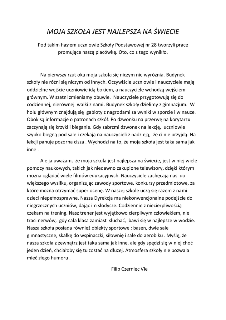 MOJA SZKOŁA JEST NAJLEPSZA NA ŚWIECIE Pod takim hasłem uczniowie Szkoły Podstawowej nr 28 tworzyli prace promujące naszą placówkę. Oto, co z tego wynikło. Na pierwszy rzut oka moja szkoła się niczym nie wyróżnia. Budynek szkoły nie różni się niczym od innych. Oczywiście uczniowie i nauczyciele mają oddzielne wejście uczniowie idą bokiem, a nauczyciele wchodzą wejściem głównym. W szatni zmieniamy obuwie. Nauczyciele przygotowują się do codziennej, nierównej walki z nami. Budynek szkoły dzielimy z gimnazjum. W holu głównym znajdują się gabloty z nagrodami za wyniki w sporcie i w nauce. Obok są informacje o patronach szkół. Po dzwonku na przerwę na korytarzu zaczynają się krzyki i bieganie. Gdy zabrzmi dzwonek na lekcję, uczniowie szybko biegną pod sale i czekają na nauczycieli z nadzieją, że ci nie przyjdą. Na lekcji panuje pozorna cisza . Wychodzi na to, że moja szkoła jest taka sama jak inne . Ale ja uważam, że moja szkoła jest najlepsza na świecie, jest w niej wiele pomocy naukowych, takich jak niedawno zakupione telewizory, dzięki którym można oglądad wiele filmów edukacyjnych. Nauczyciele zachęcają nas do większego wysiłku, organizując zawody sportowe, konkursy przedmiotowe, za które można otrzymad super ocenę. W naszej szkole uczą się razem z nami dzieci niepełnosprawne. Nasza Dyrekcja ma niekonwencjonalne podejście do niegrzecznych uczniów, dając im słodycze. Codziennie z niecierpliwością czekam na trening. Nasz trener jest wyjątkowo cierpliwym człowiekiem, nie traci nerwów, gdy cała klasa zamiast słuchad, bawi się w najlepsze w wodzie. Nasza szkoła posiada również obiekty sportowe : basen, dwie sale gimnastyczne, skałkę do wspinaczki, siłownię i sale do aerobiku . Myślę, że nasza szkoła z zewnątrz jest taka sama jak inne, ale gdy spędzi się w niej chod jeden dzieo, chciałoby się tu zostad na dłużej. Atmosfera szkoły nie pozwala mied złego humoru . Filip Czerniec VIe MOJA SZKOŁA JEST NAJLEPSZA NA ŚWIECIE! Znam szkołę taką I to wcale nie nijaką Nie nudną czy przesiąkniętą złem Lecz tryskającą mądrością, szczęściem i dobrem. Lubię ją mimo różnych rzeczy: Że są krótkie przerwy Gdy ktoś ma słabe nerwy Trudne klasówki, Niezapowiadane kartkówki, Okropna gramatyka Czy nawet matematyka. Ale medal ma strony dwie I gdyby tak dobrze przyjrzeć się To wcale nie jest aż tak źle. Są mili nauczyciele, Lekcje też są miłe Lecz przedmioty sypkie są jak mak I ja to wszystko widzę tak: Informatyka, angielski i przyroda -To dopiero przygoda! Matma, j. polski, religia Już mała przeszkoda Ale historia, muzyka i w-f - To najgorsza rzeczLecz mimo tego powiem wam jednowiecie? Moja szkoła jest najlepsza na świecie! Natalia Salwa VIb Justyna szła przez zatłoczony korytarz, starając się, by zauważyło ją jak najmniej osób. Omijała szerokim łukiem grupki stojące przy ścianie i szukające kogoś, komu można byłoby podokuczać. Widziała starsze dziewczyny, które pokazywały ją palcami i śmiały się głośno tak, aby zrobiło jej się przykro. W końcu doszła do sali, w której za chwilę będzie miała przyrodę. Zaraz podbiegło do niej dwóch chłopaków z jej klasy. Zaczęli lekko szarpać jej rude warkocze śmiejąc się przy tym. Justynie łzy stanęły w oczach. Podbiegła szybko do okna, usiadła na parapecie, schowała twarz w dłoniach i zaczęła płakać.Za chwilę jednak usłyszała dzwonek, starła więc łzy i weszła za nauczycielką i resztą klasy do sali. Przez pierwsze pięć minut nic niemiłego się nie wydarzyło, lecz po chwili usłyszała chichot za sobą. Odwróciła się, ale nic nie zauważyła. Dopiero na następnej lekcji nauczycielka zdjęła jej karteczkę z rysunkiem narysowanym czarną kredką. Tylko piegi i włosy były czerwone. -Nie wiem, jak mogłaś nie zauważyć, gdy ci to naklejali- powiedziała niemiłym głosem. Justyna z trudem wytrzymała do końca lekcji, a gdy wróciła do domu, jej mama znów zauważyła, że Justyna płakała. W następnym miesiącu Justyna była już w nowej szkole. Z nieufnością spoglądała na nową klasę. Wkrótce okazało się, że dziewczyny tu są bardzo miłe i szybko się z nimi zaprzyjaźniła. Zaczęła dobrze się uczyć, przestała mieć kłopoty z ortografią. -Bardzo lubię naszych nauczycieli - mówiła mamie nie śmieją się ze mnie. Częściej się uśmiechała, w końcu była naprawdę szczęśliwa. Pewnego dnia przed snem myślała o swoim życiu w poprzedniej szkole. Nie umiała sobie wyobrazić, jak mogła tam wytrzymać tyle czasu. "Moja szkoła jest najlepsza na świecie" pomyślała i zasnęła. Katarzyna Mikulska 5F