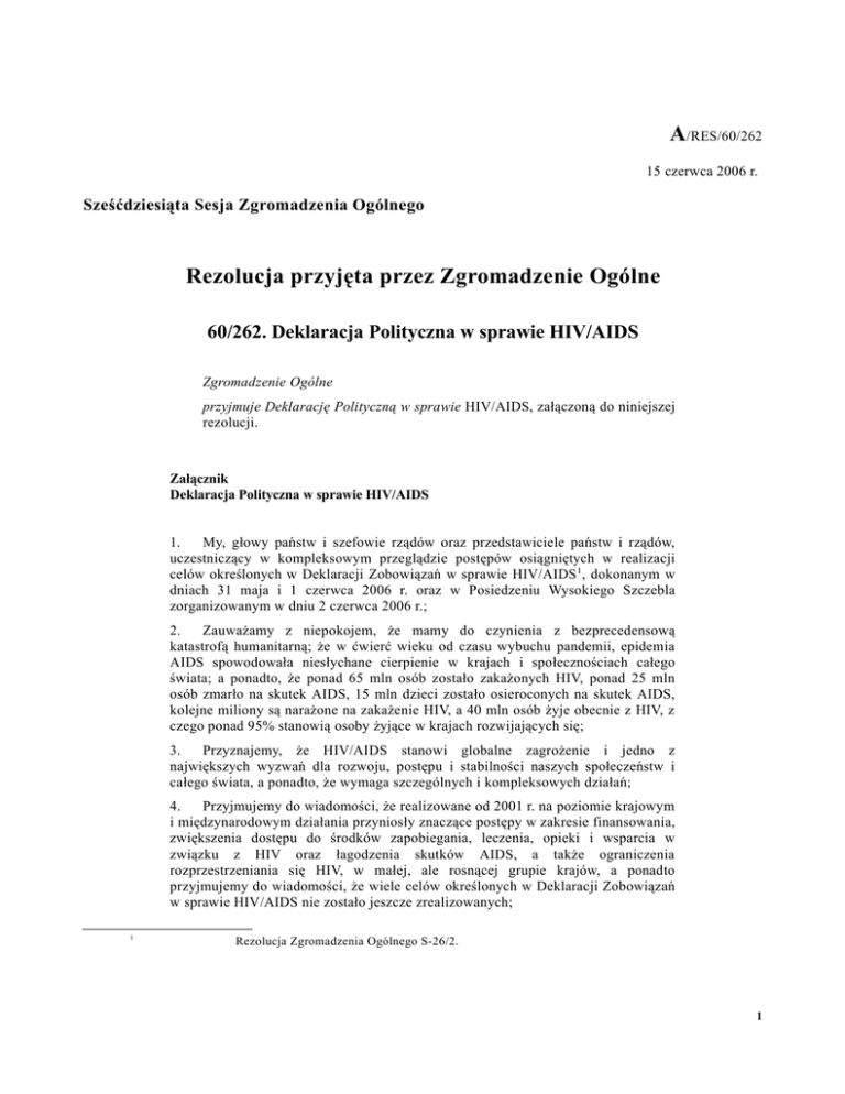 A/RES/60/262 15 czerwca 2006 r. Sześćdziesiąta Sesja Zgromadzenia Ogólnego Rezolucja przyjęta przez Zgromadzenie Ogólne 60/262. Deklaracja Polityczna w sprawie HIV/AIDS Zgromadzenie Ogólne przyjmuje Deklarację Polityczną w sprawie HIV/AIDS, załączoną do niniejszej rezolucji. Załącznik Deklaracja Polityczna w sprawie HIV/AIDS 1. My, głowy państw i szefowie rządów oraz przedstawiciele państw i rządów, uczestniczący w kompleksowym przeglądzie postępów osiągniętych w realizacji celów określonych w Deklaracji Zobowiązań w sprawie HIV/AIDS 1, dokonanym w dniach 31 maja i 1 czerwca 2006 r. oraz w Posiedzeniu Wysokiego Szczebla zorganizowanym w dniu 2 czerwca 2006 r.; 2. Zauważamy z niepokojem, że mamy do czynienia z bezprecedensową katastrofą humanitarną; że w ćwierć wieku od czasu wybuchu pandemii, epidemia AIDS spowodowała niesłychane cierpienie w krajach i społecznościach całego świata; a ponadto, że ponad 65 mln osób zostało zakażonych HIV, ponad 25 mln osób zmarło na skutek AIDS, 15 mln dzieci zostało osieroconych na skutek AIDS, kolejne miliony są narażone na zakażenie HIV, a 40 mln osób żyje obecnie z HIV, z czego ponad 95% stanowią osoby żyjące w krajach rozwijających się; 3. Przyznajemy, że HIV/AIDS stanowi globalne zagrożenie i jedno z największych wyzwań dla rozwoju, postępu i stabilności naszych społeczeństw i całego świata, a ponadto, że wymaga szczególnych i kompleksowych działań; 4. Przyjmujemy do wiadomości, że realizowane od 2001 r. na poziomie krajowym i międzynarodowym działania przyniosły znaczące postępy w zakresie finansowania, zwiększenia dostępu do środków zapobiegania, leczenia, opieki i wsparcia w związku z HIV oraz łagodzenia skutków AIDS, a także ograniczenia rozprzestrzeniania się HIV, w małej, ale rosnącej grupie krajów, a ponadto przyjmujemy do wiadomości, że wiele celów określonych w Deklaracji Zobowiązań w sprawie HIV/AIDS nie zostało jeszcze zrealizowanych; 1 Rezolucja Zgromadzenia Ogólnego S-26/2. 1 5. Udzielamy Sekretariatowi Sojuszu Agend Narodów Zjednoczonych ds. HIV/AIDS oraz współfinansującym ten program pochwały za ich przywództwo w odniesieniu do polityki i współpracy w związku z HIV/AIDS, a także za wsparcie, jakiego w ramach tego programu udzielają poszczególnym krajom; 6. Uznajemy wkład i rolę poszczególnych darczyńców w zwalczaniu HIV/AIDS, a także fakt, że jedna trzecia środków wydatkowanych w 2005 r. na działania dotyczące HIV/AIDS pochodziła ze źródeł krajowych krajów o niskich i średnich dochodach, a zatem podkreślamy znaczenie w naszych globalnych działaniach dotyczących HIV/AIDS wzmocnionej współpracy i partnerstwa na poziomie międzynarodowym; 7. Jednakże pozostajemy głęboko zaniepokojeni rozprzestrzenianiem się i feminizacją pandemii w ogóle, a także faktem, że kobiety stanowią obecnie 50% osób żyjących z HIV na całym świecie oraz blisko 60% osób żyjących z HIV w Afryce i w związku z tym przyznajemy, że nierówności płci i wszelkie formy przemocy przeciwko kobietom i dziewczętom zwiększają wśród nich ryzyko zakażenia się HIV i zachorowania na AIDS; 8. Wyrażamy głębokie zaniepokojenie, że połowa nowych przypadków zakażenia HIV dotyczy dzieci oraz młodzieży poniżej 25 roku życia, a także, że wśród młodzieży występuje brak informacji, wiedzy i umiejętności w zakresie HIV/AIDS; 9. Pozostajemy głęboko zaniepokojeni faktem, że 2,3 mln dzieci żyje obecnie z HIV/AIDS, a także przyznajemy, że w wielu krajach, brak leków dla dzieci znacząco utrudnia wysiłki mające na celu ochronę ich zdrowia; 10. Przypominamy po raz kolejny, z głębokim niepokojem, że pandemia dotyka każdego regionu, że Afryka, a w szczególności Afryka Subsaharyjska pozostaje regionem najbardziej dotkniętym i, że niezbędne jest podjęcie na wszystkich poziomach natychmiastowych i szczególnych działań mających na celu ograniczenie niszczycielskiego wpływu tej pandemii, a ponadto uznajemy ponowne zobowiązanie rządów państw afrykańskich i instytucji regionalnych do zwiększania skali swoich działań dotyczących HIV/AIDS; 11. Potwierdzamy, że pełna realizacja praw człowieka i podstawowych wolności każdej osoby stanowi istotny element globalnych działań dotyczących pandemii HIV/AIDS, w tym w zakresie zapobiegania, leczenia, opieki i wsparcia, a także przyznajemy, że radzenie sobie z problemami piętna i dyskryminacji stanowi istotny element globalnych działań dotyczących pandemii HIV/AIDS; 12. Potwierdzamy także, że w przypadku pandemii takiej, jak HIV/AIDS, dostęp do środków leczenia stanowi jeden z podstawowych elementów procesu stopniowej realizacji prawa każdej osoby do zapewnienia najwyższych możliwych standardów zdrowia fizycznego i psychicznego; 13. Przyznajemy, że w wielu częściach świata, rozprzestrzenianie się HIV/AIDS stanowi zarówno przyczynę jak i skutek ubóstwa, a także, że skuteczne zwalczanie HIV/AIDS jest niezbędne do osiągnięcia uzgodnionych na poziomie międzynarodowym celów i zadań w zakresie rozwoju, w tym Milenijnych Celów Rozwoju; 14. Przyznajemy również, że posiadamy obecnie środki do odwrócenia globalnego procesu rozprzestrzeniania się pandemii i zapobieżenia milionom niepotrzebnych zgonów, jak również, że abyśmy byli skuteczni, musimy podjąć wzmożone, o wiele bardziej niezwłoczne i kompleksowe działania, we współpracy w ramach systemu Narodów Zjednoczonych oraz z organizacjami międzyrządowymi, osobami żyjącymi 2 z HIV, grupami wysokiego ryzyka, instytucjami sektorów zdrowia, nauki i edukacji, organizacjami pozarządowymi, sektorem przedsiębiorstw, w tym spółek zajmujących się produkcją leków generycznych i spółek opierających swoją działalność na badaniach, związkami zawodowymi, środkami masowego przekazu, parlamentarzystami, fundacjami, organizacjami lokalnymi, organizacj