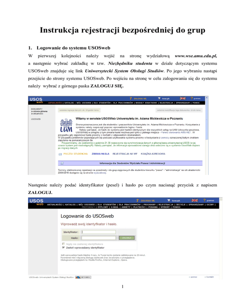 Instrukcja rejestracji bezpośredniej do grup 1. Logowanie do systemu USOSweb W pierwszej kolejności należy wejść na stronę wydziałową www.wse.amu.edu.pl, a następnie wybrać zakładkę w tzw. Niezbędniku studenta w dziale dotyczącym systemu USOSweb znajduje się link Uniwersytecki System Obsługi Studiów. Po jego wybraniu nastąpi przejście do strony systemu USOSweb. Po wejściu na stronę w celu zalogowania się do systemu należy wybrać z górnego paska ZALOGUJ SIĘ. Następnie należy podać identyfikator (pesel) i hasło po czym nacisnąć przycisk z napisem ZALOGUJ. 1 2. Rejestracja Z menu znajdującego się na górze strony należy wybrać REJESTRACJA a następnie z menu znajdującego się po lewej stronie REJESTRACJA BEZPOŚREDNIA DO GRUP. Jeżeli student będzie miał możliwość wybierania przedmiotów z więcej niż jednej rejestracji wówczas widoczna będzie lista dostępnych rejestracji, z których student będzie musiał wybrać właściwą. Jeżeli student będzie mógł wybierać przedmioty tylko w ramach jednej rejestracji wówczas nie pojawi się lista rejestracji tylko bezpośrednio okno z listą przedmiotów do wyboru. 2 Chcąc zarejestrować się na określony przedmiot należy nacisnąć przycisk Zarejestruj odpowiadający danemu przedmiotowi. Gdy przedmiot jest prowadzony w jednej grupie zajęciowej wówczas po naciśnięciu przycisku Zarejestruj wyświetli się informacja, że dana osoba została zarejestrowana i w kolumnie Wybrana grupa pojawi się termin zajęć, na który dokonano rejestracji. 3 W przypadku, gdy dany przedmiot będzie prowadzony w kilku grupach zajęciowych wówczas po naciśnięciu przycisku Zarejestruj pojawi się lista wszystkich grup zajęciowych wraz z informacją ile osób jest już zapisanych do danej grupy, jaki jest limit osób, które mogą się zapisać do danej grupy oraz termin zajęć i nazwisko prowadzącego dana grupę zajęciową. W kolumnie wybór należy zaznaczyć wybraną grupę i kliknąć przycisk Zarejestruj. Po naciśnięciu przycisku Zarejestruj wyświetli się informacja o tym, że dana osoba została zarejestrowana i w kolumnie Wybrana grupa pojawi się termin zajęć, na który dokonano rejestracji. 4 UWAGA !!!! Nie będzie możliwe: - zapisanie się do grupy zajęciowej ponad limit; - zapisanie się do 2 grup zajęciowych w ramach jednego przedmiotu; - zapisanie się na więcej przedmiotów do wyboru niż będzie to określone w rejestracji, tzn. w przypadku niektórych rejestracji będzie określone, że w jej ramach można zapisać się tylko na pewną liczbę przedmiotów. Informacja o liczbie przedmiotów, na które można się zapisać będzie wyświetlona nad tabelą z listą przedmiotów do wyboru. 3. Wyrejestrowywanie z grupy zajęciowej W celu wyrejestrowania się z grupy zajęciowej należy przy odpowiednim przedmiocie wcisnąć przycisk Wyrejestruj. Wówczas pojawi się okno z pytaniem czy jesteśmy przekonani o wyrejestrowaniu się z danego przedmiotu. 5 Po naciśnięciu przycisku OK., co jest jednoznaczne z zaakceptowaniem wypisania się z danej grupy zajęciowej, pojawi się informacja o wyrejestrowaniu z zajęć. 6