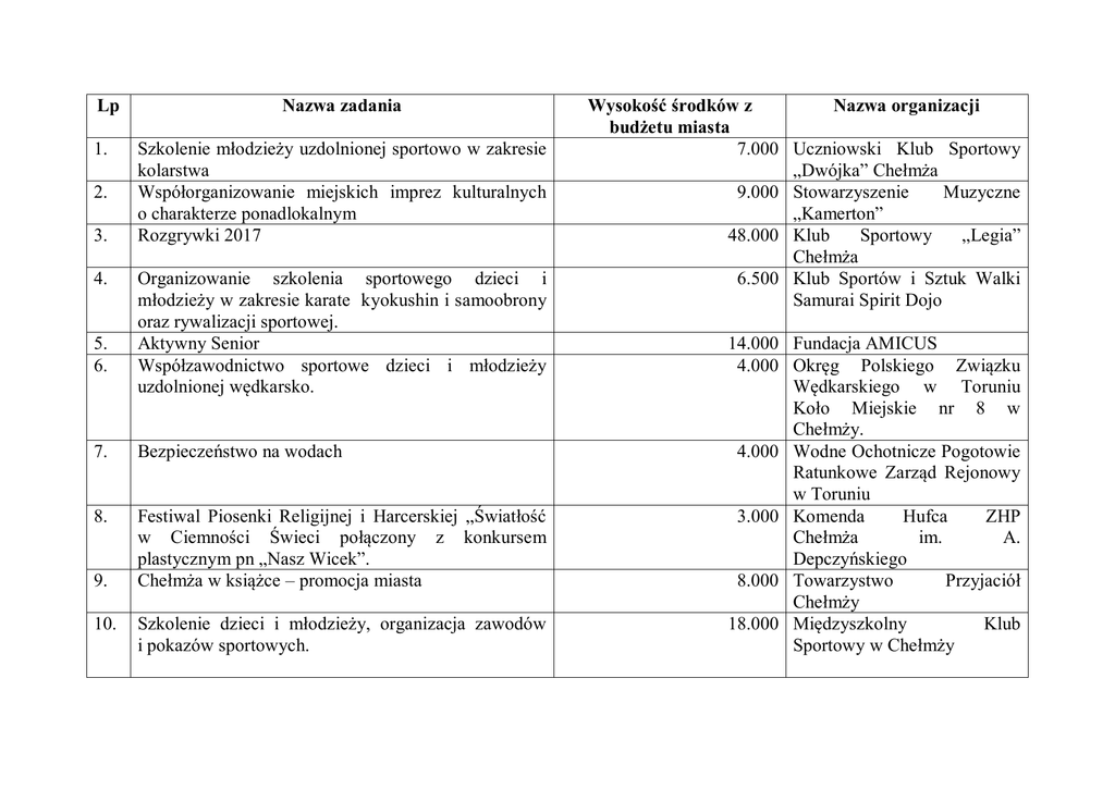 Lp 1. 2. 3. 4. 5. 6. Nazwa zadania Szkolenie młodzieży uzdolnionej sportowo w zakresie kolarstwa Współorganizowanie miejskich imprez kulturalnych o charakterze ponadlokalnym Rozgrywki 2017 Organizowanie szkolenia sportowego dzieci i młodzieży w zakresie karate kyokushin i samoobrony oraz rywalizacji sportowej. Aktywny Senior Współzawodnictwo sportowe dzieci i młodzieży uzdolnionej wędkarsko. 7. Bezpieczeństwo na wodach 8. Festiwal Piosenki Religijnej i Harcerskiej „Światłość w Ciemności Świeci połączony z konkursem plastycznym pn „Nasz Wicek”. Chełmża w książce – promocja miasta 9. 10. Szkolenie dzieci i młodzieży, organizacja zawodów i pokazów sportowych. Wysokość środków z Nazwa organizacji budżetu miasta 7.000 Uczniowski Klub Sportowy „Dwójka” Chełmża 9.000 Stowarzyszenie Muzyczne „Kamerton” 48.000 Klub Sportowy „Legia” Chełmża 6.500 Klub Sportów i Sztuk Walki Samurai Spirit Dojo 14.000 Fundacja AMICUS 4.000 Okręg Polskiego Związku Wędkarskiego w Toruniu Koło Miejskie nr 8 w Chełmży. 4.000 Wodne Ochotnicze Pogotowie Ratunkowe Zarząd Rejonowy w Toruniu 3.000 Komenda Hufca ZHP Chełmża im. A. Depczyńskiego 8.000 Towarzystwo Przyjaciół Chełmży 18.000 Międzyszkolny Klub Sportowy w Chełmży 11. 12. 13. 14. Szkolenie dzieci i młodzieży poprzez prowadzenie zajęć przez stowarzyszenia kultury fizycznej w różnych dyscyplinach sportowych. Ochrona przyrody i środowiska naturalnego nadrzędnym zadaniem społeczeństwa. Organizowanie szkolenia sportowego i młodzieży przez KST „Włókniarz” Chełmża Chełmżyńska Piłka Kobieca dzieci Turnieje Baśki i Tysiąca Parami. 15. 16. 17. 18. Szkolenie Sportowe dzieci i młodzieży w sezonie 2017 Szkolenie dzieci i młodzieży poprzez dyscyplinę sportową – boks „Radość niepełnosprawnych naszą radością” 15.000 Chełmżyńskie Towarzystwo Wioślarskie 1927 4.000 Liga Ochrony Przyrody Zarząd Okręgu w Toruniu Oddział LOP w Chełmży 24.000 Klub Sportowo – Turystyczny „Włókniarz” Chełmża 8.000 Kobiecy Klub Piłkarski Chełmża 3.500 Chełmżyński Klub Sportowych Gier Karcianych „AS PIK” 8.000 Uczniowski Klub Sportowy „Włókniarz” Chełmża 5.500 Klub Sportowy „Grom” w Chełmży 12.000 Stowarzyszenie Osób Niepełnosprawnych „Pomocna Dłoń”