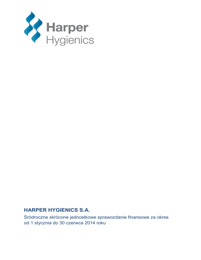 HARPER HYGIENICS S.A. Śródroczne skrócone jednostkowe sprawozdanie finansowe za okres od 1 stycznia do 30 czerwca 2014 roku 1. JEDNOSTKOWE SPRAWOZDANIE Z ZYSKÓW LUB STRAT I INNYCH CAŁKOWITYCH DOCHODÓW Nota 01.01-30.06.2014 (tys. PLN) Przychody ze sprzedaży Koszt własny sprzedaży 6.3 01.01-30.06.2013 (tys. PLN) 102 884,7 (70 871,5) 111 131,6 (76 630,2) 32 013,2 34 501,4 (17 515,7) (10 886,0) 1 342,1 (496,7) (17 928,2) (10 696,3) 2 350,4 (505,2) 4 456,9 7 722,1 460,7 (1 586,4) 124,2 (2 694,4) 3 331,2 5 151,9 Podatek dochodowy 15 117,2 (242,1) Zysk netto 18 448,4 4 909,8 361,8 60,6 18 810,2 4 970,4 0,29 0,29 0,08 0,08 Zysk brutto na sprzedaży Koszty sprzedaży Koszty zarządu Pozostałe przychody operacyjne Pozostałe koszty operacyjne Zysk na działalności operacyjnej Przychody finansowe Koszty finansowe Zysk przed opodatkowaniem Składniki innych całkowitych dochodów, które zostaną następnie przekwalifikowane na zyski lub straty po spełnieniu określonych warunków Efekt wyceny instrumentu zabezpieczającego Całkowite dochody ogółem Zysk na jedna akcję (w PLN na jedną akcję) - podstawowy - rozwodniony 5.6 5.6 Harper Hygienics S.A. Śródroczne skrócone jednostkowe sprawozdanie finansowe za okres 01.01. – 30.06.2014 2/20 2. JEDNOSTKOWE SPRAWOZDANIE Z SYTUACJI FINANSOWEJ Nota AKTYWA I. Aktywa trwałe (długoterminowe) Rzeczowe aktywa trwałe Wartości niematerialne Wieczyste użytkowanie gruntów Aktywa finansowe Aktywa z tytułu podatku odroczonego II. Aktywa obrotowe (krótkoterminowe) Zapasy Należności handlowe i pozostałe należności Należności z tyt. podatku dochodowego Krótkoterminowe rozliczenia międzyokresowe Środki pieniężne i ich ekwiwalenty Aktywa razem Nota Na dzień 30.06.2014 Na dzień 31.12.2013 (tys. PLN) (tys. PLN) 177 991,5 155 624,9 1 847,1 6 436,6 259,2 13 823,7 147 082,7 138 115,9 2 241,5 6 470,9 254,4 0,0 72 185,7 26 002,0 32 830,8 1 853,6 11 499,3 66 263,3 19 674,6 33 934,1 446,6 1 346,9 10 861,1 250 177,2 213 346,0 Na dzień 30.06.2014 Na dzień 31.12.2013 PASYWA dane przekształcone (tys. PLN) (tys. PLN) I. Kapitał własny Kapitał akcyjny Kapitał zapasowy Kapitał z tytułu stosowania rachunkowości zabezpieczeń Kapitał rezerwowy z wyceny programów motywacyjnych Zyski zatrzymane 73 358,2 1 545,6 45 813,7 - 54 364,0 1 545,6 35 154,4 (361,8) 3 952,9 22 046,0 3 768,9 14 256,9 II. Zobowiązania długoterminowe Rezerwa na odprawy emerytalne Kredyty otrzymane Zobowiązania z tyt. leasingu finansowego Zobowiązania z tyt. obligacji i innych papierów wartościowych 61 959,4 73,5 30 000,0 8 734,4 15 028,6 59 282,0 73,5 39 000,0 10 787,2 - - 1 293,5 7.2 7.2 7 429,7 693,2 7 405,2* 722,6 7.1 114 859,6 28 042,6 13 394,3 99 700,0 15 551,8 10 875,3 7.2 73 343,6 72 851,3* 79,1 421,6 250 177,2 213 346,0 Zobowiązania z tyt. odroczonego podatku dochodowego Zobowiązania inwestycyjne Długoterminowe rozliczenia międzyokresowe III. Zobowiązania krótkoterminowe Kredyty otrzymane Zobowiązania z tyt. leasingu finansowego i factoringu Zobowiązania handlowe, inne zobowiązania krótkoterminowe oraz krótkoterminowe rozliczenia międzyokresowe Wycena instrumentów pochodnych Pasywa razem 7.1 * przeklasyfikowano zobowiązanie inwestycyjne z pozycji krótkoterminowej na długoterminowe Harper Hygienics S.A. Śródroczne skrócone jednostkowe sprawozdanie finansowe za okres 01.01. – 30.06.2014 3/20 3. JEDNOSTKOWE SPRAWOZDANIE ZE ZMIAN W KAPITALE WŁASNYM 3.1. Jednostkowe sprawozdanie ze zmian w kapitale własnym za okres od 1 stycznia 2014 do 30 czerwca 2014 Kapitał zapasowy ogólny (tys. PLN) Kapitał z tyt. stosowania rachunkowości zabezpieczeń (tys. PLN) 1 545,6 35 154,4 (361,8) 3 768,9 14 256,9 54 364,0 Zysk netto okresu - - 18 448,4 18 448,4 - - 361,8 - Inne całkowite dochody ogółem - - 361,8 Całkowite dochody ogółem za okres Transakcje z właścicielami, ujęte bezpośrednio w kapitale własnym Dopłaty od i wpłaty do właścicieli - - 361,8 - 18 448,4 18 810,2 Koszt płatności w formie papierów wartościowych rozliczanych w instrumentach finansowych - - - 184,0 - 184,0 Dopłaty od i wpłaty do właścicieli ogółem - - - 184,0 - 10 659,3 - 184,0 Podział wyniku - (10 659,3) - 1 545,6 45 813,7 - 3 952,9 22 046,0 73 358,2 Kapitał akcyjny ogółem (tys. PLN) Stan na 01 stycznia 2014 roku Kapitał z wyceny programów motywacyjnych (tys. PLN) Zyski zatrzymane (tys. PLN) Razem (tys. PLN) Całkowite dochody za okres sprawozdawczy Stan na 30 czerwca 2014 roku Harper Hygienics S.A. Śródroczne skrócone jednostkowe sprawozdanie finansowe za okres 01.01. – 30.06.2014 4/20 3.2. Jednostkowe sprawozdanie ze zmian w kapitale własnym za okres od 1 stycznia 2013 do 30 czerwca 2013 Kapitał zapasowy ogólny (tys. PLN) Kapitał z tyt. stosowania rachunkowości zabezpieczeń (tys. PLN) 1 545,6 27 690,9 (846,1) 3 400,9 11 061,1 42 852,4 Zysk netto okresu - - 4 909,8 4 909,8 - - 60,6 - Inne całkowite dochody ogółem - - 60,6 Całkowite dochody ogółem za okres Transakcje z właścicielami, ujęte bezpośrednio w kapitale własnym Dopłaty od i wpłaty do właścicieli - - 60,6 - 4 909,8 4 970,4 - - - 184,2 - 184,2 Kapitał akcyjny ogółem (tys. PLN) Stan na 01 stycznia 2013 roku Kapitał z wyceny programów motywacyjnych (tys. PLN) Zyski zatrzymane (tys. PLN) Razem (tys. PLN) Całkowite dochody za okres sprawozdawczy Koszt płatności w formie papierów wartościowych rozliczanych w instrumentach finansowych Dopłaty od i wpłaty do właścicieli ogółem Podział wyniku - - - 184,2 - 7 463,5 - 184,2 Stan na 30 czerwca 2013 roku - (7 463,5) - 35 154,4 (785,5) 3 585,1 8 507,4 48 007,0 1 545,6 Harper Hygienics S.A. Śródroczne skrócone jednostkowe sprawozdanie finansowe za okres 01.01. – 30.06.2014 5/20 4. JEDNOSTKOWE SPRAWOZDANIE Z PRZEPŁYWÓW PIENIĘŻNYCH 1.01.201430.06.2014 1.01.201330.06.2013 (tys. PLN) (tys. PLN) A. Działalność operacyjna I. Zysk (strata) za okres bieżący 18 448,4 4 909,8 II. Korekty razem (7 396,5) 3 162,