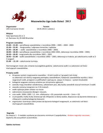 Mazowiecka Liga Judo Dzieci 2013 Organizator UKS Czerwone Smoki Termin 18.05.2013 ( sobota ) Miejsce Hala Sportowa ZS nr 2 ul. Żwirowa 16, 05-840 Brwinów Program zawodów: 15.00 – 15.30 – weryfikacja zawodników z roczników 2006 – 2005 – 2004 - 2003 15.30 – 15.45 - Rozgrzewka / odprawa trenerów i sędziów 15.45 – 18.30 – walki zawodników z roczników 2006 – 2003, 18.00 – 18.30 – weryfikacja zawodników z roczników 2002-2001, dekoracja roczników 2006 – 2003; 18.30 – 18.45 - rozgrzewka dla roczników 2002 – 2001 18.45 – 21.00 - walki zawodników z roczników 2002 – 2001; dekoracja w trakcie, po zakończeniu walk w 23 wagach 21.00 – 21.10 – zakończenie turnieju. Harmonogram może ulec zmianie (szczególnie godzina zakończenia walk ) w zależności od ilości startujących zawodników. Przepisy walki Grupowy system rozgrywania zawodów – 8 lub 6 osób w 2 grupach lub mniej w zależności od różnicy wagowej pomiędzy zawodnikami, kolejność zawodników wynika z ilości wygranych walk, przegrani w półfinałach zajmują ex. aequo 3 miejsca – system brukselski kategorie wagowe zostaną ustalone po otrzymaniu zgłoszeń, zawody mają charakter szkoleniowy, założeniem jest, aby każdy zawodnik stoczył minimum 3 walki zawody zostaną rozegrane na 2 (3) matach walki sędziuje jeden arbiter na macie zabronione stosowanie dźwigni i duszeń, czas walki 2006 i 2005 1,5 min. efektywny + GS; pozostałe roczniki – 2min + GS w przypadku małej liczby dziewcząt lub chłopców w danej wadze, dopuszcza się łączenie dziewcząt z chłopcami o jedną kategorię lżejszymi organizator rezerwuje sobie prawo do łączenia kategorii wagowych, w zależności od ilości startujących zawodników. Nagrody Za miejsca 1 - 3 medale uzyskane po stoczeniu minimum 2 pojedynków, drobne nagrody rzeczowe, dyplomy dla wszystkich uczestników. Opłata startowa 25 zł od zawodnika - startowe opłacają zawodnicy w czasie weryfikacji. Zgłaszanie zawodników Ostateczny termin zgłoszenia upływa 15.05.2013 godz. 21:59. Zgłoszenie po terminie wiąże się z wyższą opłatą startową (30zł .) Dla uproszczenia losowania, będziemy opierać się o wagi podane przez trenerów i rodziców w zgłoszeniach. Każdy z kierowników ekip ma prawo żądania weryfikacji wagi każdego zawodnika. Jeżeli weryfikowany tak zawodnik przekroczy podaną przez trenera wagę, zostanie zdyskwalifikowany. Ubezpieczenie i badania lekarskie Każdy uczestnik i uczestniczka powinien posiadać ważne ubezpieczenie i aktualne badania lekarskie, za co odpowiada klub i trener zawodnika. Rocznik 2005 i młodsi – zgoda rodziców lub opiekunów na udział w zawodach. Organizator nie bierze odpowiedzialności za rzeczy zaginione oraz za wypadki podczas walk i rozgrzewki . Informacje / zgłoszenia Andrzej Pilipczuk 501 401 183 [email protected] Serdecznie zapraszamy młodych sportowców, rodziców i wszystkich sympatyków Judo !!!