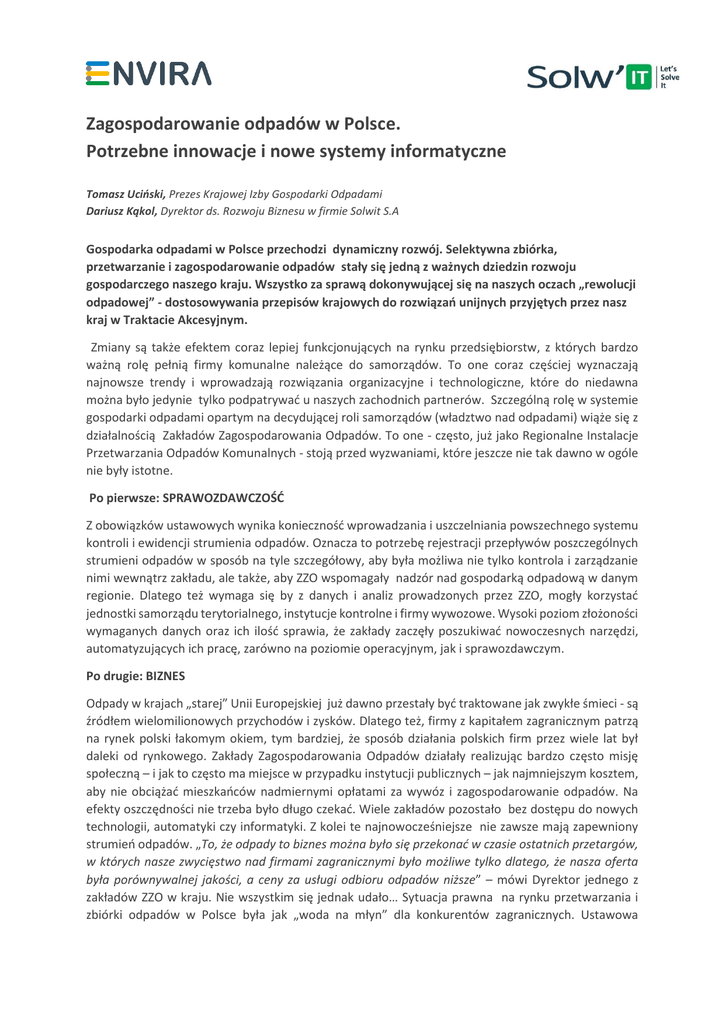 Zagospodarowanie odpadów w Polsce. Potrzebne innowacje i nowe systemy informatyczne Tomasz Uciński, Prezes Krajowej Izby Gospodarki Odpadami Dariusz Kąkol, Dyrektor ds. Rozwoju Biznesu w firmie Solwit S.A Gospodarka odpadami w Polsce przechodzi dynamiczny rozwój. Selektywna zbiórka, przetwarzanie i zagospodarowanie odpadów stały się jedną z ważnych dziedzin rozwoju gospodarczego naszego kraju. Wszystko za sprawą dokonywującej się na naszych oczach „rewolucji odpadowej” - dostosowywania przepisów krajowych do rozwiązań unijnych przyjętych przez nasz kraj w Traktacie Akcesyjnym. Zmiany są także efektem coraz lepiej funkcjonujących na rynku przedsiębiorstw, z których bardzo ważną rolę pełnią firmy komunalne należące do samorządów. To one coraz częściej wyznaczają najnowsze trendy i wprowadzają rozwiązania organizacyjne i technologiczne, które do niedawna można było jedynie tylko podpatrywać u naszych zachodnich partnerów. Szczególną rolę w systemie gospodarki odpadami opartym na decydującej roli samorządów (władztwo nad odpadami) wiąże się z działalnością Zakładów Zagospodarowania Odpadów. To one - często, już jako Regionalne Instalacje Przetwarzania Odpadów Komunalnych - stoją przed wyzwaniami, które jeszcze nie tak dawno w ogóle nie były istotne. Po pierwsze: SPRAWOZDAWCZOŚĆ Z obowiązków ustawowych wynika konieczność wprowadzania i uszczelniania powszechnego systemu kontroli i ewidencji strumienia odpadów. Oznacza to potrzebę rejestracji przepływów poszczególnych strumieni odpadów w sposób na tyle szczegółowy, aby była możliwa nie tylko kontrola i zarządzanie nimi wewnątrz zakładu, ale także, aby ZZO wspomagały nadzór nad gospodarką odpadową w danym regionie. Dlatego też wymaga się by z danych i analiz prowadzonych przez ZZO, mogły korzystać jednostki samorządu terytorialnego, instytucje kontrolne i firmy wywozowe. Wysoki poziom złożoności wymaganych danych oraz ich ilość sprawia, że zakłady zaczęły poszukiwać nowoczesnych narzędzi, automatyzujących ich pracę, zarówno na poziomie operacyjnym, jak i sprawozdawczym. Po drugie: BIZNES Odpady w krajach „starej” Unii Europejskiej już dawno przestały być traktowane jak zwykłe śmieci - są źródłem wielomilionowych przychodów i zysków. Dlatego też, firmy z kapitałem zagranicznym patrzą na rynek polski łakomym okiem, tym bardziej, że sposób działania polskich firm przez wiele lat był daleki od rynkowego. Zakłady Zagospodarowania Odpadów działały realizując bardzo często misję społeczną – i jak to często ma miejsce w przypadku instytucji publicznych – jak najmniejszym kosztem, aby nie obciążać mieszkańców nadmiernymi opłatami za wywóz i zagospodarowanie odpadów. Na efekty oszczędności nie trzeba było długo czekać. Wiele zakładów pozostało bez dostępu do nowych technologii, automatyki czy informatyki. Z kolei te najnowocześniejsze nie zawsze mają zapewniony strumień odpadów. „To, że odpady to biznes można było się przekonać w czasie ostatnich przetargów, w których nasze zwycięstwo nad firmami zagranicznymi było możliwe tylko dlatego, że nasza oferta była porównywalnej jakości, a ceny za usługi odbioru odpadów niższe” – mówi Dyrektor jednego z zakładów ZZO w kraju. Nie wszystkim się jednak udało… Sytuacja prawna na rynku przetwarzania i zbiórki odpadów w Polsce była jak „woda na młyn” dla konkurentów zagranicznych. Ustawowa transparentność polskich Zakładów Zagospodarowania Odpadów pozwalała konkurencji zagranicznej na łatwy dostęp do informacji handlowych o polskich zakładach, który w grze rynkowej normalnie nigdy nie byłby możliwy. Dziś, dzięki takim organizacjom, jak m.in. Krajowa Izba Gospodarki Odpadami, świadomość biznesowa zakładów staje się coraz powszechniejsza, a zmiany w regulacjach zdają się wyrównywać szanse między wszystkim konkurującymi na rynku podmiotami. Po trzecie: SAMORZĄD Zakłady Zagospodarowania Odpadów – podobnie jak w krajach „starej” UE - nadal w swojej przeważającej większości pozostają własnością publiczną. To powoduje, że ich działalność kojarzona jest z władzami samorządowymi. Tymi samymi, które ustalają ceny na wywóz odpadów dla gospodarstw domowych. Nie trudno jest dostrzec zależność między cenami za usługi komunalne, a zadowoleniem lub rozczarowaniem mieszkańców gmin. A to przecież potencjalni wyborcy władz samorządowych. Politycy zdają sobie sprawę, że wysokość opłat może mieć wpływ na ich reelekcję, dlatego też oczekiwanym jest obniżanie cen usług za wywóz i przetwarzanie odpadów. Taka postawa stoi w oczywistej sprzeczności z logiką biznesu i w ostatecznym efekcie ogranicza nakłady inwestycyjne zakładów ZZO. W odpowiedzi na to wyzwanie zakłady już dziś rozpoczęły poszukiwanie narzędzi informatycznych, które pozwoliłyby im precyzyjnie określić składniki kosztotwórcze, w odniesieniu do wszystkich typów odpadów. Systemy takie pozwolą zakładom selektywnie obciążać dostawców odpadów wg ich kodów i nie przenosić uśrednionych kosztów zakładu na wytwórców odpadów komunalnych. Ten trend jest zauważalny, chociaż wciąż niedoceniany przez niektórych interesariuszy zakładów. Po czwarte: PROCESY Do niedawna procesy przetwarzania w Zakładach Zagospodarowania Odpadów, można by sprowadzić do jednej tylko formuły – do prostego składowania na kwaterze składowej. Dziś – w zakładach wyposażonych w nowoczesne linie technologiczne procesy są daleko bardziej rozwinięte. Od sortowania i kompostowania do produkcji paliwa alternatywnego, o które już dziś dobijają się nie tylko właściciele rodzimych spalarni, ale również ich konkurenci zza naszej zachodniej granicy. Na masową skalę upowszechnia się wytwarzanie surowców wtórnych, które wymaga podejścia i organizacji pracy, analogicznej do tyc