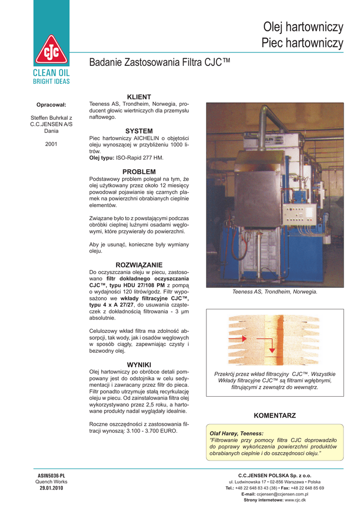 Olej hartowniczy Piec hartowniczy Badanie Zastosowania Filtra CJC™ KLIENT Opracował: Steffen Buhrkal z C.C.JENSEN A/S Dania 2001 Teeness AS, Trondheim, Norwegia, producent głowic wiertniczych dla przemysłu naftowego. SYSTEM Piec hartowniczy AICHELIN o objętości oleju wynoszącej w przybliżeniu 1000 litrów. Olej typu: ISO-Rapid 277 HM. PROBLEM Podstawowy problem polegał na tym, że olej użytkowany przez około 12 miesięcy powodował pojawianie się czarnych plamek na powierzchni obrabianych cieplnie elementów. Związane było to z powstającymi podczas obróbki cieplnej luźnymi osadami węglowymi, które przywierały do powierzchni. Aby je usunąć, konieczne były wymiany oleju. ROZWIĄZANIE Do oczyszczania oleju w piecu, zastosowano filtr dokładnego oczyszczania CJC™, typu HDU 27/108 PM z pompą o wydajności 120 litrów/godz. Filtr wyposażono we wkłady filtracyjne CJC™, typu 4 x A 27/27, do usuwania cząsteczek z dokładnością filtrowania - 3 μm absolutnie. Teeness AS, Trondheim, Norwegia. Celulozowy wkład filtra ma zdolność absorpcji, tak wody, jak i osadów węglowych w sposób ciągły, zapewniając czysty i bezwodny olej. WYNIKI Olej hartowniczy po obróbce detali pompowany jest do odstojnika w celu sedymentacji i zawracany przez filtr do pieca. Filtr ponadto utrzymuje stałą recyrkulację oleju w piecu. Od zainstalowania filtra olej wykorzystywano przez 2,5 roku, a hartowane produkty nadal wyglądały idealnie. Roczne oszczędności z zastosowania filtracji wynoszą: 3.100 - 3.700 EURO. Przekrój przez wkład filtracyjny CJC™. Wszystkie Wkłady filtracyjne CJC™ są filtrami wgłębnymi, filtrującymi z zewnątrz do wewnątrz. KOMENTARZ Olaf Harøy, Teeness: ”Filtrowanie przy pomocy filtra CJC doprowadziło do poprawy wykończenia powierzchni produktów obrabianych cieplnie i do oszczędnosci oleju.” ASIN5036-PL C.C.JENSEN POLSKA Sp. z o.o. Quench Works ul. Ludwinowska 17 • 02-856 Warszawa • Polska Tel.: +48 22 648 83 43 (38) • Fax: +48 22 648 85 69 E-mail: [email protected] Strony internetowe: www.cjc.dk 29.01.2010