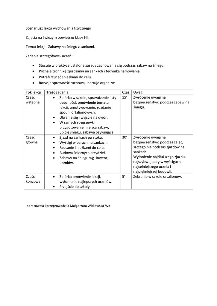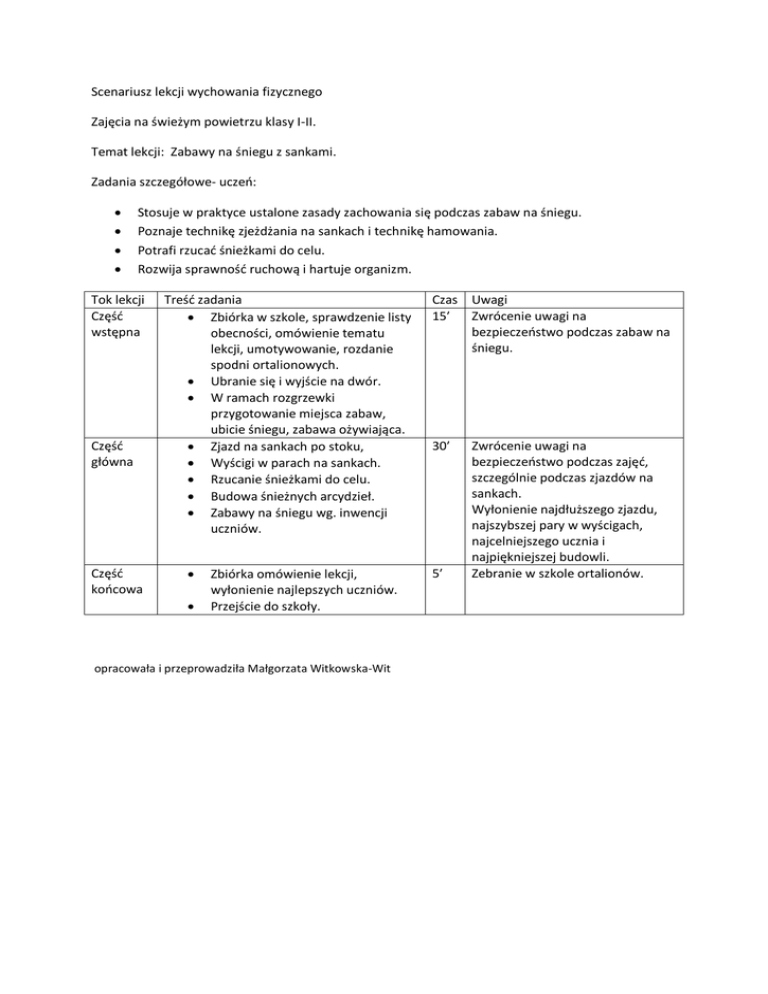 Scenariusz lekcji wychowania fizycznego Zajęcia na świeżym powietrzu klasy I-II. Temat lekcji: Zabawy na śniegu z sankami. Zadania szczegółowe- uczeń: Stosuje w praktyce ustalone zasady zachowania się podczas zabaw na śniegu. Poznaje technikę zjeżdżania na sankach i technikę hamowania. Potrafi rzucać śnieżkami do celu. Rozwija sprawność ruchową i hartuje organizm. Tok lekcji Część wstępna Część główna Część końcowa Treść zadania Zbiórka w szkole, sprawdzenie listy obecności, omówienie tematu lekcji, umotywowanie, rozdanie spodni ortalionowych. Ubranie się i wyjście na dwór. W ramach rozgrzewki przygotowanie miejsca zabaw, ubicie śniegu, zabawa ożywiająca. Zjazd na sankach po stoku, Wyścigi w parach na sankach. Rzucanie śnieżkami do celu. Budowa śnieżnych arcydzieł. Zabawy na śniegu wg. inwencji uczniów. Zbiórka omówienie lekcji, wyłonienie najlepszych uczniów. Przejście do szkoły. opracowała i przeprowadziła Małgorzata Witkowska-Wit Czas Uwagi 15′ Zwrócenie uwagi na bezpieczeństwo podczas zabaw na śniegu. 30′ 5′ Zwrócenie uwagi na bezpieczeństwo podczas zajęć, szczególnie podczas zjazdów na sankach. Wyłonienie najdłuższego zjazdu, najszybszej pary w wyścigach, najcelniejszego ucznia i najpiękniejszej budowli. Zebranie w szkole ortalionów.