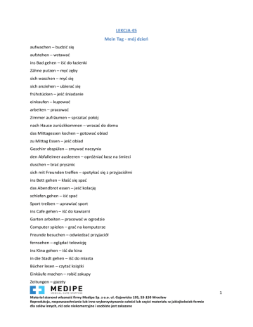 LEKCJA 45 Mein Tag - mój dzień aufwachen – budzić się aufstehen – wstawać ins Bad gehen – iść do łazienki Zähne putzen – myć zęby sich waschen – myć się sich anziehen – ubierać się frühstücken – jeść śniadanie einkaufen – kupować arbeiten – pracować Zimmer aufräumen – sprzatać pokój nach Hause zurückkommen – wracać do domu das Mittagessen kochen – gotować obiad zu Mittag Essen – jeść obiad Geschirr abspülen – zmywać naczynia den Abfalleimer ausleeren – opróżniać kosz na śmieci duschen – brać prysznic sich mit Freunden treffen – spotykać się z przyjaciółmi ins Bett gehen – kłaść się spać das Abendbrot essen – jeść kolację schlafen gehen – iść spać Sport treiben – uprawiać sport ins Cafe gehen – iść do kawiarni Garten arbeiten – pracować w ogrodzie Computer spielen – grać na komputerze Freunde besuchen – odwiedzać przyjaciół fernsehen – oglądać telewizję ins Kino gehen – iść do kina in die Stadt gehen – iść do miasta Bücher lesen – czytać książki Einkäufe machen – robić zakupy Zeitungen – gazety 1 Materiał stanowi własność firmy Medipe Sp. z o.o. ul. Gajowicka 195, 53-150 Wrocław Reprodukcja, rozpowszechnianie lub inne wykorzystywanie całości lub części materiału w jakiejkolwiek formie dla celów innych, niż cele niekomercyjne i osobiste jest zakazane Musik hören – słuchać muzyki Zeitschriften – czasopisma heute – dzisiaj morgen – jutro gestern – wczoraj gern – chętnie nicht gern – niechętnie oft – często sehr oft - bardzo często selten – rzadko meistens – najczęściej um 8 Uhr – o 8 godzinie bis 10 Uhr – do godziny 10 von 8 bis 10 Uhr – od 8 do 10 von 8 Uhr – od 8 godziny morgen – rano am Vormittag – przed południem am Nachmittag – po południu am Abend – wieczorem in der Nacht – w nocy am Wochenende – w czasie weekendu 2 Materiał stanowi własność firmy Medipe Sp. z o.o. ul. Gajowicka 195, 53-150 Wrocław Reprodukcja, rozpowszechnianie lub inne wykorzystywanie całości lub części materiału w jakiejkolwiek formie dla celów innych, niż cele niekomercyjne i osobiste jest zakazane