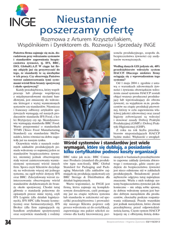 Nieustannie poszerzamy ofertę Rozmowa z Arturem Krzysztofiakiem, Wspólnikiem i Dyrektorem ds. Rozwoju i Sprzedaży INGE Państwa firma zajmuje się m.in. doradztwem przy wdrażaniu systemów i standardów zapewnienia bezpieczeństwa żywności, tj. IFS, BRC, ISO, GlobalG.A.P. W ciągu lat firmy zdążyły już się przyzwyczaić do tego, że standardy te są niezbędne w ich pracy. Czy obserwują Państwo wzrost zainteresowania tymi systemami wśród firm branży spożywczej i około spożywczej? Każdy przedsiębiorca, który współpracuje lub planuje współpracę z międzynarodowymi sieciami handlowymi, jest zmuszony do wdrożenia któregoś z wyżej wymienionych systemów czy standardów. Niemieccy i francuscy odbiorcy artykułów spożywczych wymagają od naszych producentów standardu IFS Food, z kolei Brytyjczycy czy np. Skandynawowie wymagają standardu BRC Food. Warto przypomnieć o standardach TFMS (Tesco Food Manufacturing Standard) czy standardzie McDonalds'a, które również na dobre zagościły już na naszym rynku. Oczywiście wiele z naszych rodzimych zakładów produkcyjnych posiada wdrożony co najmniej jeden ze standardów bezpieczeństwa żywności, niemniej jednak obserwujemy stały wzrost zainteresowania wymienionymi systemami wśród innych firm. Spora część Klientów decyduje się na wdrożenie więcej niż jednego systemu, na ogół wybór dotyczy IFS oraz BRC. Zdecydowany wzrost zainteresowania obserwujemy wśród standardów dedykowanych do branży około spożywczej. Chodzi tutaj głównie o standardy pokrewne do opisanych przeze mnie wyżej, czyli IFS Logistic (dla działań logistycznych), IFS HPC (dla branży kosmetycznej oraz farmaceutycznej), IFS Broker (dla firm zajmujących się handlem artykułami spożywczymi) oraz oczywiście standardy z rodziny 34 sonelu produkcyjnego, zespołu ds. bezpieczeństwa żywności czy audytorów wewnętrznych. Według danych GIS jedynie ok. 40% przedsiębiorstw wdrożyło system HACCP. Dlaczego niektóre firmy ociągają się z wprowadzeniem tego systemu? Od 1 maja 2004 r. zgodnie z ustawą o warunkach zdrowotnych żywności i żywienia obowiązkiem wdrożenia zasad systemu HACCP zostali objęci wszyscy producenci produkujący lub wprowadzający do obrotu żywność, za wyjątkiem m.in. producentów na etapie produkcji pierwotnej, którzy w celu zapewnienia właściwej jakości zdrowotnej oraz zasad higieny zobowiązani są wdrożyć i stosować zasady Dobrej Praktyki Produkcyjnej (GMP) i Dobrej Praktyki Higienicznej (GHP). Z roku na rok liczba przedsiębiorstw nieposiadających HACCP będzie maleć. Większość z uwzględ- Wśród systemów i standardów jest wiele wymagań, które się dublują, a posiadanie kilku certyfikatów podnosi koszty organizacji BRC takie jak m.in.: BRC Consumer Products (standard dla produktów typu non-food), BRC Global Standard for Packaging and Packaging Materials (dla zakładów zajmująch się produkcją opakowań) czy BRC Storage & Distribuition dla działań logistycznych. Warto wspomnieć, że INGE jest firmą, która zajmuje się kompleksowym doradztwem, czyli pomagamy już na etapie wyboru systemu lub standardu w zależności od specyfiki przedsiębiorstwa i prowadzimy naszego Klienta poprzez cały proces wdrożenia aż do certyfikacji, zapewniając mu pakiet szkoleń zarówno dla kadry kierowniczej, per- nionych w badaniach przedsiębiorstw to zapewne zakłady żywienia zbiorowego i restauracje, gdzie często podejście do bezpieczeństwa żywności jest nieco odmienne niż w zakładach produkcyjnych. Świadomość przedsiębiorców odgrywa tutaj największe znaczenie. Wielu z nich traktuje systemy bezpieczeństwa żywności jak zło konieczne – nie zdają sobie sprawy, że dobrze wdrożony system jest bardzo dobrym narzędziem dla producentów, chociażby podczas rozpatrywania reklamacji. Przede wszystkim jest jednak narzędziem, które chroni przedsiębiorcę przed odpowiedzialnością karną. Często system HACCP kojarzy się z olbrzymią ilością doku- Bezpieczeństwo i Higiena Żywności 03/110/2013 INGE mentów do wypełniania, co często jest wynikiem jego błędnego wdrożenia – niestety wina często leży tutaj po stronie firm doradczych. Prawo związane z bezpieczeństwem żywności, a co za tym idzie obowiązujące systemy i standardy nieustannie się zmieniają. Zmiany te raczej utrudniają poruszanie się w gąszczu przepisów. Jak sobie Państwo z tym radzą? Tak, to prawda. My jako firma doradcza musimy na bieżąco śledzić ustawodawstwo polskie oraz unijne. Nasi konsultanci, którzy są absolwentami technologii żywności oraz kierunków pokrewnych, świetnie sobie z tym radzą. Z nieocenioną pomocą przychodzi także nasz dział prawny, na który w sytuacjach kryzysowych zawsze możemy liczyć. Warto wspomnieć, iż oprócz pomocy wewnętrznej nasi prawnicy pomagają Klientom z branży spożywczej chociażby w opiniowaniu czy tworzeniu umów z sieciami handlowymi, reprezentowaniu ich w sprawach spornych czy nawet podczas negocjacji z odbiorcami. Funkcjonowanie przedsiębiorstw żywnościowych jest utrudnione przez mnogość tych wszystkich standardów i systemów. Być może stworzenie jednego uniwersalnego systemu byłoby najłatwiejsze. Czy byłby on jednak w stanie objąć tę różnorodność, która panuje na rynku? Jest to temat, który jest poruszany praktycznie za każdym razem, gdy rozmawiam z przedstawicielami zakładów produkcyjnych. Oczywiście jest to problem i chcielibyśmy, aby wszystkie organizacje, które są właścicielami standardów, dla dobra producentów opracowały jeden globalny standard bezpieczeństwa żywności. Niestety punkt widzenia właścicieli standardów (HDE, BRC, ISO) nie zawsze pokrywa się z naszym. Jeden dobrze dopracowany system dla konkretnej branży na pewno byłby wystarczający. W tej chwili wśród systemów i standardów jest wiele wymagań, które się dublują, a posiadanie kilku certyfikatów po pros