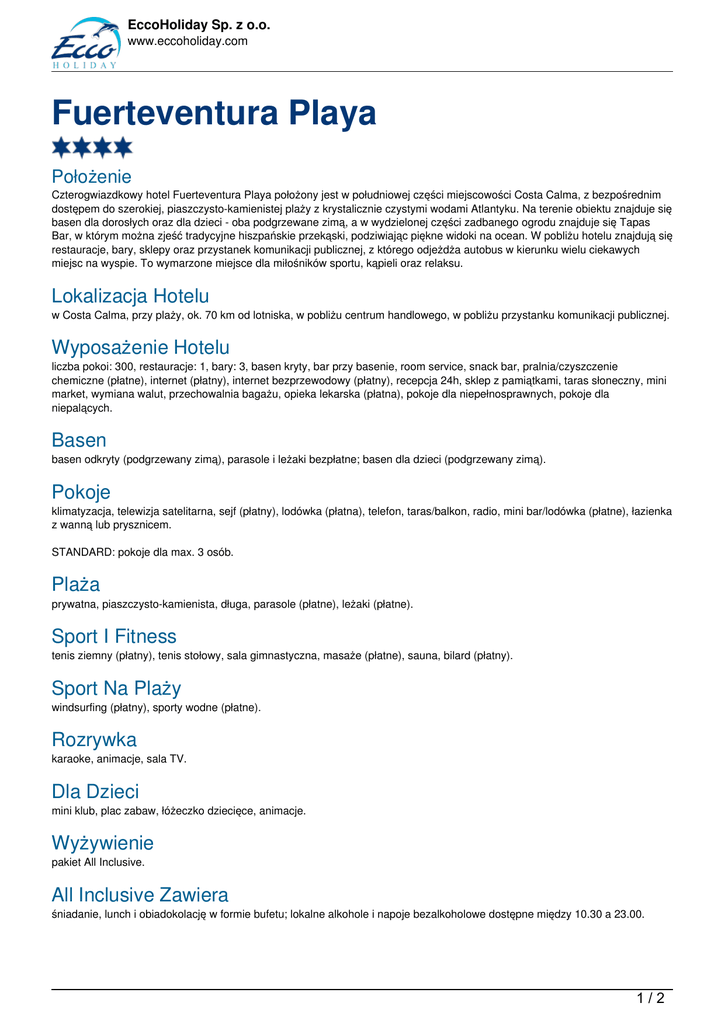 EccoHoliday Sp. z o.o. www.eccoholiday.com Fuerteventura Playa Położenie Czterogwiazdkowy hotel Fuerteventura Playa położony jest w południowej części miejscowości Costa Calma, z bezpośrednim dostępem do szerokiej, piaszczysto-kamienistej plaży z krystalicznie czystymi wodami Atlantyku. Na terenie obiektu znajduje się basen dla dorosłych oraz dla dzieci - oba podgrzewane zimą, a w wydzielonej części zadbanego ogrodu znajduje się Tapas Bar, w którym można zjeść tradycyjne hiszpańskie przekąski, podziwiając piękne widoki na ocean. W pobliżu hotelu znajdują się restauracje, bary, sklepy oraz przystanek komunikacji publicznej, z którego odjeżdża autobus w kierunku wielu ciekawych miejsc na wyspie. To wymarzone miejsce dla miłośników sportu, kąpieli oraz relaksu. Lokalizacja Hotelu w Costa Calma, przy plaży, ok. 70 km od lotniska, w pobliżu centrum handlowego, w pobliżu przystanku komunikacji publicznej. Wyposażenie Hotelu liczba pokoi: 300, restauracje: 1, bary: 3, basen kryty, bar przy basenie, room service, snack bar, pralnia/czyszczenie chemiczne (płatne), internet (płatny), internet bezprzewodowy (płatny), recepcja 24h, sklep z pamiątkami, taras słoneczny, mini market, wymiana walut, przechowalnia bagażu, opieka lekarska (płatna), pokoje dla niepełnosprawnych, pokoje dla niepalących. Basen basen odkryty (podgrzewany zimą), parasole i leżaki bezpłatne; basen dla dzieci (podgrzewany zimą). Pokoje klimatyzacja, telewizja satelitarna, sejf (płatny), lodówka (płatna), telefon, taras/balkon, radio, mini bar/lodówka (płatne), łazienka z wanną lub prysznicem. STANDARD: pokoje dla max. 3 osób. Plaża prywatna, piaszczysto-kamienista, długa, parasole (płatne), leżaki (płatne). Sport I Fitness tenis ziemny (płatny), tenis stołowy, sala gimnastyczna, masaże (płatne), sauna, bilard (płatny). Sport Na Plaży windsurfing (płatny), sporty wodne (płatne). Rozrywka karaoke, animacje, sala TV. Dla Dzieci mini klub, plac zabaw, łóżeczko dziecięce, animacje. Wyżywienie pakiet All Inclusive. All Inclusive Zawiera śniadanie, lunch i obiadokolację w formie bufetu; lokalne alkohole i napoje bezalkoholowe dostępne między 10.30 a 23.00. 1/2 EccoHoliday Sp. z o.o. www.eccoholiday.com Informacje Dodatkowe Obowiązkowa dopłata do kolacji bożonarodzeniowej i sylwestrowej w cenie. Internet bezprzewodowy w miejscach ogólnodostępnych (płatny). Oferta: Wylot 01.01.1970 Powrót 01.01.1970 godz. godz. Zakwaterowanie -() Dni dni Cena os. dorosła 2/2 Powered by TCPDF (www.tcpdf.org)