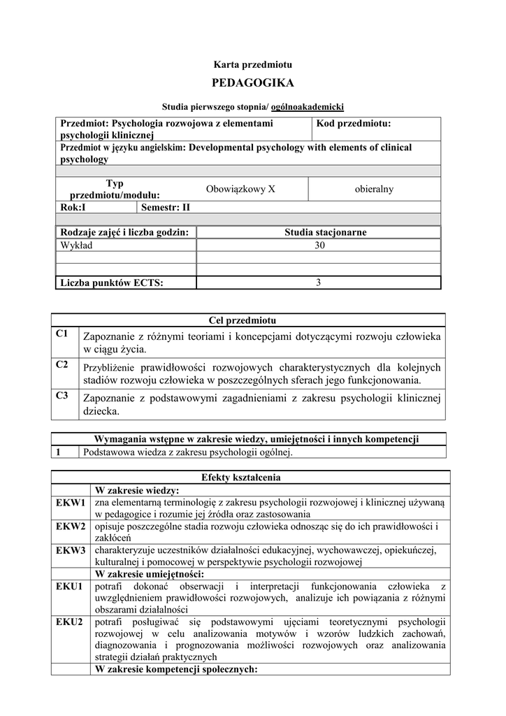 Karta przedmiotu PEDAGOGIKA Studia pierwszego stopnia/ ogólnoakademicki Przedmiot: Psychologia rozwojowa z elementami Kod przedmiotu: psychologii klinicznej Przedmiot w języku angielskim: Developmental psychology with elements of clinical psychology Typ przedmiotu/modułu: Rok:I Semestr: II Obowiązkowy X Rodzaje zajęć i liczba godzin: Wykład obieralny Studia stacjonarne 30 3 Liczba punktów ECTS: Cel przedmiotu C1 Zapoznanie z różnymi teoriami i koncepcjami dotyczącymi rozwoju człowieka w ciągu życia. C2 Przybliżenie prawidłowości rozwojowych charakterystycznych dla kolejnych stadiów rozwoju człowieka w poszczególnych sferach jego funkcjonowania. C3 Zapoznanie z podstawowymi zagadnieniami z zakresu psychologii klinicznej dziecka. 1 Wymagania wstępne w zakresie wiedzy, umiejętności i innych kompetencji Podstawowa wiedza z zakresu psychologii ogólnej. Efekty kształcenia W zakresie wiedzy: EKW1 zna elementarną terminologię z zakresu psychologii rozwojowej i klinicznej używaną w pedagogice i rozumie jej źródła oraz zastosowania EKW2 opisuje poszczególne stadia rozwoju człowieka odnosząc się do ich prawidłowości i zakłóceń EKW3 charakteryzuje uczestników działalności edukacyjnej, wychowawczej, opiekuńczej, kulturalnej i pomocowej w perspektywie psychologii rozwojowej W zakresie umiejętności: EKU1 potrafi dokonać obserwacji i interpretacji funkcjonowania człowieka z uwzględnieniem prawidłowości rozwojowych, analizuje ich powiązania z różnymi obszarami działalności EKU2 potrafi posługiwać się podstawowymi ujęciami teoretycznymi psychologii rozwojowej w celu analizowania motywów i wzorów ludzkich zachowań, diagnozowania i prognozowania możliwości rozwojowych oraz analizowania strategii działań praktycznych W zakresie kompetencji społecznych: EKK1 odpowiedzialnie przygotowuje się do swojej pracy uwzględniając prawidłowości rozwojowe podopiecznych, Treści programowe przedmiotu Forma zajęć – wykłady Treści programowe W1 W2 W3 W4 W5 W6 Psychologia rozwojowa. Przedmiot psychologii rozwojowej podstawowe definicje i pojęcia. Periodyzacja rozwoju. Rodzaje i cele zmian rozwojowych. Czynniki wywierające wpływ na charakter i wielkość zmian rozwojowych. Metody badań w psychologii rozwojowej. Diagnoza poziomu rozwoju i jej znaczenie dla optymalizacji rozwoju człowieka.. Charakterystyka okresów rozwojowych Okres prenatalny. Okres niemowlęcy. Okres poniemowlęcy. Charakterystyka okresów rozwojowych Okres przedszkolny. Okres szkolny. Definicja dojrzałości szkolnej. Charakterystyka okresów rozwojowych Adolescencja Charakterystyka okresów rozwojowych Okres dorosłości. Okres starzenia się. Liczba godzin 2 2 2 2 2 2 W7 W8 Rozwój fizyczny – prawidłowości i zaburzenia rozwoju. Rozwój biologiczny. Rozwój motoryczny - lokomocja Rozwój mototryki małej – chwyt i manipulacja. Mózgowe porażenie dziecięce – etiologia, objawy, typy, konsekwencje dla funkcjonowania. Rozwój poznawczy Rozwój funkcji poznawczych – spostrzeganie, uwaga, pamięć myślenie. Deficyty sensoryczne – etiologia i konsekwencje dla funkcjonowania jednostki. ADHD i ADD w kontekście deficytów poznawczych. 2 2 W9 Rozwój społeczny Relacje społeczne w rodzinie i w grupie rówieśniczej. Mechanizmy rozwoju społecznego. 4 Rozwój moralny Fazy rozwoju religijnego według N. Bulla. Okresy rozwoju ocen moralnych według J. Piageta. Rozwój moralny według L. Kohlberga. 2 W10 W11 Rozwój osobowości. Czynniki sprzyjające zagrażające rozwojowi. Osobowość prawidłowa i nieprawidłowa i 2 – W12 W13 W14 W15 konsekwencje dla rozwoju i funkcjonowania. Zaburzenia rozwojowe, zaburzenia zachowania (w tym zespół nadpobudliwości psychoruchowej), zaburzenia emocjonalne (w tym lęki i fobie). Zaburzenia lękowe i nastroju. Zaburzenia osobowości. 2 Agresja i przemoc (w tym agresja elektroniczna). Uzależnienia (w tym od środków psychoaktywnych i komputera). 2 Zaburzenia odżywiania. Problemy zdrowotne dziecka i ich wpływ na jego sytuację szkolną. Niepełnosprawność fizyczna i intelektualna oraz jej konsekwencje psychologiczne. Zaburzenia w procesie rozwoju językowego. Całościowe zaburzenia w rozwoju 2 2 30 Suma godzin: Metody i środki dydaktyczne M1 M2 M3 M4 SD1 Wykład konwencjonalny Dyskusja dydaktyczna Wykład konwersatoryjny Pokaz Prezentacja multimedialna Sposoby oceniania Ocenianie kształtujące F1 Aktywność podczas zajęć P1 Ocenianie podsumowujące Egzamin pisemny (wykład) Obciążenie pracą studenta Średnia liczba godzin na realizowanie aktywności (Godziny kontaktowe z wykładowcą, 30 realizowane w formie zajęć dydaktycznych – łączna liczba godzin w semestrze) (Godziny kontaktowe z wykładowcą 2 realizowane w formie np. konsultacji – łączna liczba godzin w semestrze) Przygotowanie się do egzaminu 35 Forma aktywności Analiza literatury 23 90 3 Suma Liczba punktów ECTS Literatura podstawowa Harwas – Napierała B., Trempała J. (red.)., Psychologia rozwoju człowieka. Charakterystyka okresów życia człowieka, PWN Warszawa 2006. Harwas – Napierała B., Trempała J. (red.)., Psychologia rozwoju człowieka. Rozwój funkcji psychicznych, PWN Warszawa 2006. Kalat J., Biologiczne podstawy psychologii, PWN Warszawa 2006 Przetacznik- Gierowska M., Tyszkowa M., Psychologia rozwoju człowieka. Zagadnienia ogólne, PWN Warszawa 2006. Sęk H., Psychologia kliniczna, PWN, Warszawa 2005 Literatura uzupełniająca Kendall P. C., Zaburzenia okresu dzieciństwa i adolescencji, Gdańsk 2004 Łobocki M., W trosce o wychowanie w szkole, Kraków 2007. Piaget J, Inteligencja, Warszawa 1967. Piaget J, Narodziny inteligencji, Warszawa 1966. Pankowska D, Wychowanie a role płciowe, Gdańsk 2005. Stepulak M, Tajemnica zawodowa psychologa w relacjach osobowych, Lublin 2002. Stepulak M, Wybrane zagadnienia z psychologii szkolnej, Lublin 2009. Strelau J. (red.), Psychologia podręcznik akademicki, Gdańsk 2014. Trempała J., Psyc