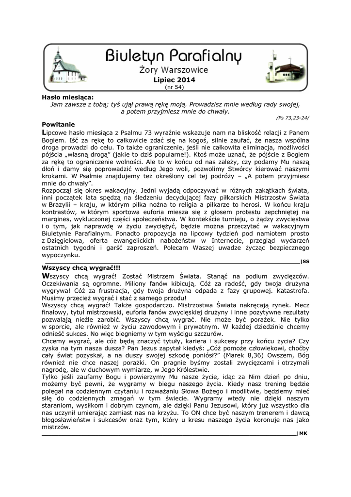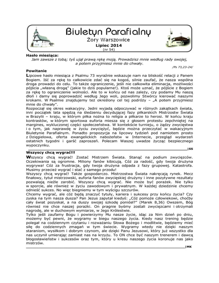 Lipiec 2014 (nr 54) Hasło miesiąca: Jam zawsze z tobą; tyś ujął prawą rękę moją. Prowadzisz mnie według rady swojej, a potem przyjmiesz mnie do chwały. /Ps 73,23-24/ Powitanie Lipcowe hasło miesiąca z Psalmu 73 wyraźnie wskazuje nam na bliskość relacji z Panem Bogiem. Iść za rękę to całkowicie zdać się na kogoś, silnie zaufać, że nasza wspólna droga prowadzi do celu. To także ograniczenie, jeśli nie całkowita eliminacja, możliwości pójścia „własną drogą” (jakie to dziś popularne!). Ktoś może uznać, że pójście z Bogiem za rękę to ograniczenie wolności. Ale to w końcu od nas zależy, czy podamy Mu naszą dłoń i damy się poprowadzić według Jego woli, pozwolimy Stwórcy kierować naszymi krokami. W Psalmie znajdujemy też określony cel tej podróży – „A potem przyjmiesz mnie do chwały”. Rozpoczął się okres wakacyjny. Jedni wyjadą odpoczywać w różnych zakątkach świata, inni początek lata spędzą na śledzeniu decydującej fazy piłkarskich Mistrzostw Świata w Brazylii – kraju, w którym piłka nożna to religia a piłkarze to herosi. W końcu kraju kontrastów, w którym sportowa euforia miesza się z głosem protestu zepchniętej na margines, wykluczonej części społeczeństwa. W kontekście turnieju, o żądzy zwycięstwa i o tym, jak naprawdę w życiu zwyciężyć, będzie można przeczytać w wakacyjnym Biuletynie Parafialnym. Ponadto propozycja na lipcowy tydzień pod namiotem prosto z Dzięgielowa, oferta ewangelickich nabożeństw w Internecie, przegląd wydarzeń ostatnich tygodni i garść zaproszeń. Polecam Waszej uwadze życząc bezpiecznego wypoczynku. ____________________________________________________________________________|SS Wszyscy chcą wygrać!!! Wszyscy chcą wygrać! Zostać Mistrzem Świata. Stanąć na podium zwycięzców. Oczekiwania są ogromne. Miliony fanów kibicują. Cóż za radość, gdy twoja drużyna wygrywa! Cóż za frustracja, gdy twoja drużyna odpada z fazy grupowej. Katastrofa. Musimy przecież wygrać i stać z samego przodu! Wszyscy chcą wygrać! Także gospodarczo. Mistrzostwa Świata nakręcają rynek. Mecz finałowy, tytuł mistrzowski, euforia fanów zwycięskiej drużyny i inne pozytywne rezultaty pozwalają nieźle zarobić. Wszyscy chcą wygrać. Nie może być porażek. Nie tylko w sporcie, ale również w życiu zawodowym i prywatnym. W każdej dziedzinie chcemy odnieść sukces. No więc biegniemy w tym wyścigu szczurów. Chcemy wygrać, ale cóż będą znaczyć tytuły, kariera i sukcesy przy końcu życia? Czy zyska na tym nasza dusza? Pan Jezus zapytał kiedyś: „Cóż pomoże człowiekowi, choćby cały świat pozyskał, a na duszy swojej szkodę poniósł?” (Marek 8,36) Owszem, Bóg również nie chce naszej porażki. On pragnie byśmy zostali zwycięzcami i otrzymali nagrodę, ale w duchowym wymiarze, w Jego Królestwie. Tylko jeśli zaufamy Bogu i powierzymy Mu nasze życie, idąc za Nim dzień po dniu, możemy być pewni, że wygramy w biegu naszego życia. Kiedy nasz trening będzie polegał na codziennym czytaniu i rozważaniu Słowa Bożego i modlitwie, będziemy mieć siłę do codziennych zmagań w tym świecie. Wygramy wtedy nie dzięki naszym staraniom, wysiłkom i dobrym czynom, ale dzięki Panu Jezusowi, który już wszystko dla nas uczynił umierając zamiast nas na krzyżu. To ON chce być naszym trenerem i dawcą błogosławieństw i sukcesów oraz tym, który u kresu naszego życia koronuje nas jako mistrzów. ____________________________________________________________________________|MK Biuletyn Parafialny 65. Tydzień Ewangelizacyjny w Dzięgielowie – 5-13.07.2014 Na samym początku wakacji polecamy Waszej uwadze największą imprezę ewangelizacyjną w Europie Środkowej. Osiem dni wykładów, seminariów, warsztatów i koncertów. Tydzień rozpoczął się wczoraj (w sobotę, 5.07) i potrwa do następnej niedzieli (13.07). W czasie popołudniowych spotkań ewangelizacyjnych mówcą będzie ks. Leszek Czyż, proboszcz parafii ewangelicko-augsburskiej w Wiśle Malince, a w trakcie wieczornych koncertów usłyszymy m.in. działający przy tej parafii zespół Cześć! czy Gabriela Gąsior & HolyNoiz (Gabriela to uczestniczka koncertu Debiutów w tegorocznym Festiwalu w Opolu). Każdego dnia przygotowany jest też atrakcyjny program dla dzieci. Szczegóły można znaleźć w Internecie na www.te.cme.org.pl oraz w programach TE. *** Dla osób, które nie mogą osobiście pojawić się pod dużym namiotem w Dzięgielowie, od kilku lat prowadzone są transmisje spotkań ewangelizacyjnych w Internecie. W tym roku po raz drugi za pośrednictwem strony www.cme.org.pl ewangelizacji będzie można nie tylko posłuchać, ale też zobaczyć. Zapraszamy na stronę CME codziennie przed 17:00! Po zakończonym spotkaniu będzie można spotkać się w wirtualnej przestrzeni z duszpasterzem za pośrednictwem strony www.duszpasterz.pl. Polecamy! _____________________________________________________________________________________________________ Nabożeństw@ Coraz większą popularnością cieszą się transmisje niedzielnych nabożeństw w Internecie. Kolejne parafie udostępniają przekaz z nabożeństw na swoich stronach internetowych. W tym gronie są aktualnie: PEA Cieszyn – godz. 8:00 i 10:00 PEA Skoczów – godz. 8:00 i 10:00 PEA Wisła Czarne – godz. 8:45 PEA Kraków – godz. 10:00 i 12:00 PEA Wisła Malinka – godz. 10:15 Po szczegóły zapraszam na strony naszego kościoła: luteranie.pl. Tam, w zakładce Nabożeństwa w Internecie znajdują się odnośniki do stron parafialnych ze szczegółami proponowanych transmisji. Zachęcam do korzystania i z tej formy uczestnictwa w nabożeństwach. _____________________________________________________________________________________________________ Najpiękniejszy Kościół w naszym mieście Portal naszemisto.pl w te wakacje proponuje kolejny plebiscyt. Tym razem wybieramy najpiękn