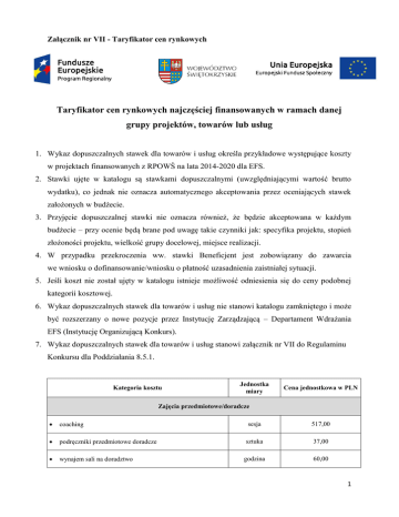 Załącznik nr VII - Taryfikator cen rynkowych Taryfikator cen rynkowych najczęściej finansowanych w ramach danej grupy projektów, towarów lub usług 1. Wykaz dopuszczalnych stawek dla towarów i usług określa przykładowe występujące koszty w projektach finansowanych z RPOWŚ na lata 2014-2020 dla EFS. 2. Stawki ujęte w katalogu są stawkami dopuszczalnymi (uwzględniającymi wartość brutto wydatku), co jednak nie oznacza automatycznego akceptowania przez oceniających stawek założonych w budżecie. 3. Przyjęcie dopuszczalnej stawki nie oznacza również, że będzie akceptowana w każdym budżecie – przy ocenie będą brane pod uwagę takie czynniki jak: specyfika projektu, stopień złożoności projektu, wielkość grupy docelowej, miejsce realizacji. 4. W przypadku przekroczenia ww. stawki Beneficjent jest zobowiązany do zawarcia we wniosku o dofinansowanie/wniosku o płatność uzasadnienia zaistniałej sytuacji. 5. Jeśli koszt nie został ujęty w katalogu istnieje możliwość odniesienia się do ceny podobnej kategorii kosztowej. 6. Wykaz dopuszczalnych stawek dla towarów i usług nie stanowi katalogu zamkniętego i może być rozszerzany o nowe pozycje przez Instytucję Zarządzającą – Departament Wdrażania EFS (Instytucję Organizującą Konkurs). 7. Wykaz dopuszczalnych stawek dla towarów i usług stanowi załącznik nr VII do Regulaminu Konkursu dla Poddziałania 8.5.1. Kategoria kosztu Jednostka miary Cena jednostkowa w PLN Zajęcia przedmiotowe/doradcze coaching podręczniki przedmiotowe doradcze wynajem sali na doradztwo sesja 517,00 sztuka 37,00 godzina 60,00 1 wynajem sali konferencyjnej godzina 100,00 wynagrodzenie doradcy zawodowego 1 godzina 150,00 Koszt racjonalnych usprawnień koszt racjonalnych usprawnień w projekcie uczestnik Zgodnie z katalogiem „Wytycznych w zakresie realizacji zasady równości szans i niedyskryminacji, w tym dostępności dla osób z niepełnosprawnościami oraz zasady równości szans kobiet i mężczyzn w ramach funduszy unijnych na lata 2014-2020” łączny koszt racjonalnych usprawnień na jednego uczestnika w projekcie nie może przekroczyć 12 tys. PLN. Kursy/szkolenia doskonalące zawodowe2 kurs barmański kurs/szkolenie 650,00 kurs kelnerski kurs/szkolenie 700,00 kurs barista kurs/szkolenie 650,00 kurs fryzjerski kurs/szkolenie 1 400,00 kurs wizażu/stylizacji kurs/szkolenie 1 000,00 kurs AutoCad kurs/szkolenie 1000,00 kurs Adobe Photoshop kurs/szkolenie 1 500,00 kurs księgowości w małej firmie kurs/szkolenie 1 500,00 kurs obrabiarek/tokarek CNC kurs/szkolenie 1 800,00 1 2 Personel projektu niezbędny do realizacji zadań merytorycznych, z wyłączeniem personelu, który zgodnie z Wytycznymi w zakresie kwalifikowalności wydatków w ramach Europejskiego Funduszu Rozwoju Regionalnego, Europejskiego Funduszu Społecznego oraz Funduszu Spójności na lata 2014-2020 ujęty jest w kosztach pośrednich. Usługa zawiera wydatki związane z organizacją i przeprowadzeniem szkolenia, m.in. wynagrodzenie wykładowcy; wynajęcie/eksploatacja sal (w tym sali dostosowanej do potrzeb osób z niepełnosprawnościami); materiały szkoleniowe; podręczniki, sprzęt techniczny np. laptop, sprzęt specjalistyczny odpowiedni do danego kursu/szkolenia dojazdy wykonawcy do miejsca świadczenia usługi. Nie należy wykazywać odrębnie tych kosztów w budżecie. 2 kurs prawa jazdy kat. B kurs 1 250,00 kurs prawa jazdy kat. C kurs 1 900,00 kurs spawacza TIG, MMA, MAG, MIG kurs 3 300,00 kurs projektowania i aranżacja ogrodów kurs/szkolenie 1 750,00 kurs florystyczny kurs/szkolenie 1 300,00 kurs obsługi kasy fiskalnej kurs/szkolenie 250,00 kurs operatora wózków widłowych podstawowy kurs 399,00 kurs pierwszej pomocy kurs 650,00 Kompetencje kluczowe matematyka godzina 80,00 przedsiębiorczość godzina 80,00 język obcy godzina 80,00 informatyka godzina 80,00 Pomoce dydaktyczne program powiększająco-mówiący oprogramowanie 2 220,00 syntezator mowy oprogramowanie 1 200,00 klawiatury specjalistyczne sztuka 3 000,00 pakiet office oprogramowanie 650,00 Wyposażenie pracowni 3 Zgodnie z zapisami Wytycznych w zakresie realizacji przedsięwzięć z udziałem środków Europejskiego Funduszu Społecznego w obszarze edukacji na lata 2014-2020 szczegółowy katalog wyposażenia pracowni lub warsztatów szkolnych dla 190 zawodów został opracowany przez MEN i jest udostępniony za pośrednictwem strony internetowej www.koweziu.edu.pl. wyposażenie pracowni /warsztatów szkolnych Meble/wyposażenie tablica szkolna sztuka 1 000,00 szafa metalowa na dokumenty sztuka 1 000,00 krzesło obrotowe sztuka 300,00 biurko dla nauczyciela sztuka 450,00 stół szkolny 2 osobowy sztuka 250,00 stolik/biurko komputerowe sztuka 350,00 krzesło szkolne sztuka 75,00 szafa/segment sztuka 450,00 Wynagrodzenie kadry edukacyjnej 2 wynagrodzenie pedagoga3 miesiąc Wynagrodzenie nauczycieli musi wynikać z kwoty bazowej ustalonej corocznie w ustawie budżetowej oraz z ustawy z dnia 26 stycznia 1982 r. Karta Nauczyciela (Dz. U. z 2006 r., Nr 97, poz. 674 Wynagrodzenie nauczycieli musi wynikać z kwoty bazowej ustalonej corocznie w ustawie budżetowej oraz z ustawy z dnia 26 stycznia 1982 r. Karta Nauczyciela (Dz. U. z 2006 r., Nr 97, poz. 674 z późn. zm.). Ponadto należy pamiętać, iż wynagrodzenie nauczyciela może być wyższe od ustalonego na podstawie aktów normatywnych tylko o dochód własny JST, w przeciwnym wypadku koszty przewyższające stawki są niekwalifikowane. Wysokość minimalnych stawek wynagrodzenia zasadniczego w złotych od 01 września 2015 r. określa rozporządzenie MEN w sprawie wysokości minimalnych stawek wynagrodzenia zasadniczego nauczycieli, ogólnych warunków przyznawania dodatków do wynagrodzenia zasadniczego oraz wynagradzania za pracę w dniu wolnym od pracy. 4 z późn. zm.). Ponadto należy pamiętać, iż wynagrodzenie nauczyciela może być wyższe od ustalonego na podstawie aktów normatywnych tylko o dochód w