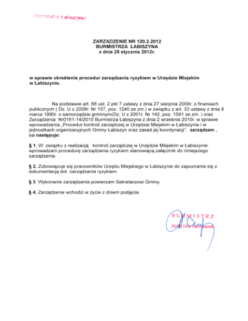 ZARZĄDZENIE NR 120.2.2012 BURMISTRZA ŁABISZYNA z dnia 25 stycznia 2012r. w sprawie określenia procedur zarządzania ryzykiem w Urzędzie Miejskim w Łabiszynie. Na podstawie art. 68 ust. 2 pkt 7 ustawy z dnia 27 sierpnia 2009r. o finansach publicznych ( Dz. U z 2009r. Nr 157, póz. 1240 ze zm.) w związku z art. 33 ustawy z dnia 8 marca 1990r. o samorządzie gminnym(Dz. U z 2001r. Nr 142, póz. 1591 ze zm.) oraz Zarządzenia Nr0151-14/2010 Burmistrza Łabiszyna z dnia 2 września 2010r. w sprawie wprowadzenia „Procedur kontroli zarządczej w Urzędzie Miejskim w Łabiszynie i w jednostkach organizacyjnych Gminy Łabiszyn oraz zasad jej koordynacji", zarządzam , co następuje: § 1. W związku z realizacją kontroli zarządczej w Urzędzie Miejskim w Łabiszynie wprowadzam procedurę zarządzania ryzykiem stanowiącą załącznik do niniejszego zarządzenia. § 2. Zobowiązuje się pracowników Urzędu Miejskiego w Łabiszynie do zapoznania się z dokumentacją dot. zarządzania ryzykiem. § 3. Wykonanie zarządzenia powierzam Sekretarzowi Gminy. § 4. Zarządzenie wchodzi w życie z dniem podjęcia. TRZ Burmistrz Łabteyw Załącznik nr 1 do zarządzenia Nr 120.2.2012 Burmistrza Łabiszyna z dnia 25 stycznia 2012r. PROCEDURY ZARZĄDZANIA RYZYKIEM W URZĘDZIE MIEJSKIM W ŁABISZYNIE. W celu poprawnego funkcjonowania systemu kontroli zarządczej w Urzędzie Miejskim w Łabiszynie wprowadzam do stosowania procedurę zarządzania ryzykiem. Ryzyko to możliwość zaistnienia zdarzenia , które będzie miało wpływ na realizację założonych celów. Mierzone jest siłą skutku oddziaływania oraz prawdopodobieństwem wystąpienia. Zarządzać ryzykiem to realizować proces , którego celem jest identyfikacja potencjalnego ryzyka , które może mieć wpływ na realizację celów i zadań Urzędu. Rozdział l Dane ogólne 1. Czynności w zakresie zarządzania ryzykiem w Urzędzie Miejskim w Łabiszynie obowiązani są wykonywać wszyscy pracownicy na stanowiskach kierowniczych urzędniczych i urzędniczych w odniesieniu do realizowanych obowiązków , na podstawie arkusza identyfikacji, analizy i reakcji na ryzyko określonego w załączniku do niniejszej procedury sporządzanego do końca stycznia każdego roku. 2. Kierujący referatami oraz pracownicy samodzielnych stanowisk odpowiadają za: 1) zarządzanie ryzykiem w zakresie działania podległej komórki i stanowiska, 2) opracowanie i przedłożenie arkuszy identyfikacji, analizy i reakcji na ryzyko wg wzoru określonego w załączniku do niniejszej procedury do Sekretarza Gminy w terminie do końca lutego każdego roku w tym: a) identyfikację i analizę ryzyka związanego z wykonywanymi zadaniami, b) analizę istniejących mechanizmów kontroli, c) regularną aktualizację arkuszy ryzyka. 3) opracowanie i przedłożenie informacji z podjętych działań ograniczających ryzyko, 4) zapewnienie, by pracownicy podległej komórki organizacyjnej byli świadomi wagi procesu zarządzania ryzykiem; 5) przegląd arkuszy ryzyk (minimum raz do roku) mający na celu analizę zestawionych w nim danych, 6) dokonanie niezbędnych zmian w arkuszu i ponowne przesłanie do Sekretarza Gminy, 3. Sekretarz Gminy : 1) zbiera i analizuje otrzymane z referatów i samodzielnych stanowisk pracy arkusze identyfikacji,analizy i reakcji na ryzyko i przedkłada Burmistrzowi, 2) prowadzi rejestr ryzyk ujawnionych w czasie procesu oceny ryzyka, 4. Zarządzanie ryzykiem podsumowuje się raz w roku w miesiącu marcu za rok poprzedni. 5. Pracownicy Urzędu są świadomi występującego ryzyka. Odpowiadają za zidentyfikowanie ryzyk towarzyszących wykonywanym przez nich konkretnym zadaniom oraz przeciwdziałanie tym ryzykom. 6. Zarządzanie ryzykiem odbywa się według zasad: 1) powiązania z celami i zadaniami Urzędu, 2) integracji z procesem zarządzania Urzędem, 3) przypisanymi odpowiedzialnościami, 4) zestawieniami zadań przeciwdziałających ryzyku do jego istotności. 7. Ustala się , że akceptowanym ryzykiem jest ryzyko nieznaczne, przy którym koszty skutecznego przeciwdziałania mogą przekraczać jego potencjalne korzyści, zdolności do skutecznego przeciwdziałania są ograniczone lub wykraczające poza decyzje i działania wewnętrzne. 8. W przypadku wystąpienia ryzyka nieakceptowanego należy podjąć działania zmniejszające zidentyfikowane ryzyko do poziomu akceptowanego. Rozdział II Proces zarządzania ryzykiem 1. Proces zarządzania ryzykiem składa się z następujących etapów: 1) Identyfikacja ryzyka W Urzędzie identyfikacja ryzyka polega na ustaleniu ryzyka zagrażającego poszczególnym działaniom określonym w Regulaminie Organizacyjnym Urzędu. Podczas identyfikacji ryzyka należy przeanalizować określone w dokumentach zakresy działania poszczególnych komórek organizacyjnych i wymienione zadania oraz zagrożenia związane z ich realizacją wraz z wewnętrznymi i zewnętrznymi przyczynami oraz możliwymi scenariuszami rozwoju zdarzeń. 2) Analiza ryzyka Zidentyfikowane ryzyko należy poddać analizie. W ramach analizy ryzyka następuje określenie przyczyn i skutków zidentyfikowanego ryzyka. Dla każdego zidentyfikowanego ryzyka określa się w komórkach organizacyjnych Urzędu: a) przyczyny ryzyka, b) skutki ryzyka, w razie jego wystąpienia, c) wpływ ryzyka, d) prawdopodobieństwo wystąpienia ryzyka, e) istniejące mechanizmy kontroli, f) propozycje możliwych zmian czyli wdrożenie działań usprawniających w danym zakresie, Do określenia prawdopodobieństwa ,skutków i poziomu istotności ryzyka stosowane są tabele i mapa ryzyka stanowiące załącznik nr 2 do procedury zarządzania ryzykiem. 3)Reakcja na ryzyko a) Reakcja na ryzyko może przybierać formy: - zmniejszenia ryzyk, np. poprzez zaprojektowanie mechanizmów kontroli; przeniesienia ryzyk, np.: wykupienie ubezpieczeń; akceptacji istniejącego ryzyka. i wdrożenie b) W celu określenia metody przeciwdziałania ryzyku należy przeanalizować: - przyczyny r