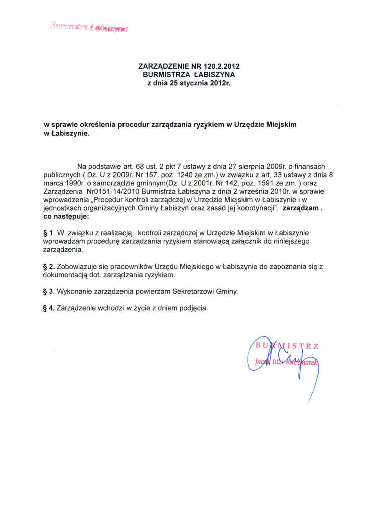 ZARZĄDZENIE NR 120.2.2012 BURMISTRZA ŁABISZYNA z dnia