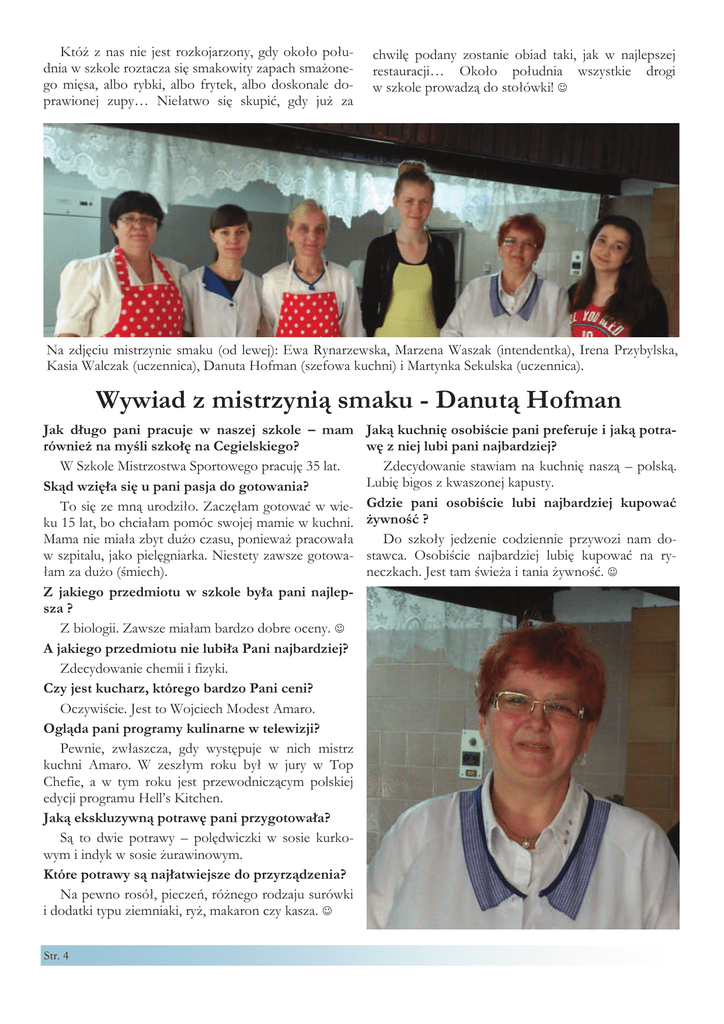Któż z nas nie jest rozkojarzony, gdy około południa w szkole roztacza się smakowity zapach smażonego mięsa, albo rybki, albo frytek, albo doskonale doprawionej zupy… Niełatwo się skupić, gdy już za chwilę podany zostanie obiad taki, jak w najlepszej restauracji… Około południa wszystkie drogi w szkole prowadzą do stołówki! J Na zdjęciu mistrzynie smaku (od lewej): Ewa Rynarzewska, Marzena Waszak (intendentka), Irena Przybylska, Kasia Walczak (uczennica), Danuta Hofman (szefowa kuchni) i Martynka Sekulska (uczennica). Wywiad z mistrzynią smaku - Danutą Hofman Jak długo pani pracuje w naszej szkole – mam również na myśli szkołę na Cegielskiego? W Szkole Mistrzostwa Sportowego pracuję 35 lat. Skąd wzięła się u pani pasja do gotowania? To się ze mną urodziło. Zaczęłam gotować w wieku 15 lat, bo chciałam pomóc swojej mamie w kuchni. Mama nie miała zbyt dużo czasu, ponieważ pracowała w szpitalu, jako pielęgniarka. Niestety zawsze gotowałam za dużo (śmiech). Z jakiego przedmiotu w szkole była pani najlepsza ? Z biologii. Zawsze miałam bardzo dobre oceny. J A jakiego przedmiotu nie lubiła Pani najbardziej? Zdecydowanie chemii i fizyki. Czy jest kucharz, którego bardzo Pani ceni? Oczywiście. Jest to Wojciech Modest Amaro. Ogląda pani programy kulinarne w telewizji? Pewnie, zwłaszcza, gdy występuje w nich mistrz kuchni Amaro. W zeszłym roku był w jury w Top Chefie, a w tym roku jest przewodniczącym polskiej edycji programu Hell’s Kitchen. Jaką ekskluzywną potrawę pani przygotowała? Są to dwie potrawy – polędwiczki w sosie kurkowym i indyk w sosie żurawinowym. Które potrawy są najłatwiejsze do przyrządzenia? Na pewno rosół, pieczeń, różnego rodzaju surówki i dodatki typu ziemniaki, ryż, makaron czy kasza. J Str. 4 Jaką kuchnię osobiście pani preferuje i jaką potrawę z niej lubi pani najbardziej? Zdecydowanie stawiam na kuchnię naszą – polską. Lubię bigos z kwaszonej kapusty. Gdzie pani osobiście lubi najbardziej kupować żywność ? Do szkoły jedzenie codziennie przywozi nam dostawca. Osobiście najbardziej lubię kupować na ryneczkach. Jest tam świeża i tania żywność. J Kto układa jadłospis? Ja i pani intendentka. Skąd bierze pani przepisy na tak pyszne dania? Większości z głowy, ale nie ukrywam, że czytam dużo gazet i książek. Wybieram z przepisów nowe składniki, które później dopasowuję do moich potraw i powstają nowe dania. Pytam też młodzież, co lubią i później, razem z koleżankami, przyrządzam potrawy według ich gustów. Jaka jest pani ulubiona potrawa? Uwielbiam zrazy wołowe z pyzami i czerwoną kapustą. To musi być pyszne. Narobiła nam Pani apetytu! (śmiech) Dziękuję, miło mi! J Ile dziennie obiadów pani gotuje? Około 260. Czy uczniowie biorą dokładki? Tak, to bardzo cieszy, bo znaczy, że im smakuje! Co daje pani dużą satysfakcję? Dużą satysfakcje daje mi to, że mogę jeździć z młodzieżą na wszelkie wyjazdy i obozy. Gotuję im wtedy i bardzo się cieszę, gdy zmęczeni po treningach odkładają puste talerze. Jestem bardzo dumna z tego, że miałam zaszczyt żywić takich mistrzów olimpijskich jak: Artur Wojdat, Rafał Szukała, Małgorzata Chojnacka, Tomasz Kaczor i wielu innych. Co lubi pani robić poza pracą? Regularnie pływam, ale oczywiście też gotuję dla swojej rodziny. Piekę różnego rodzaju ciasta, które smakują moim bliskim i znajomym, z czego się bardzo cieszę! Dziękujemy bardzo, że zgodziła się Pani z nami porozmawiać J Ja również dziękuję. Miło mi było opowiedzieć o mojej pracy, która jest jednocześnie moją pasją… Z Panią Danusią rozmawiały: Martyna Sekulska i Kasia Walczak, 1DG Marzy pani o otworzeniu własnej restauracji? Chyba jak każdy…, ale niestety jest to bardzo kosztowna sprawa. Kocham swoją pracę, nic nie sprawia mi problemu. Cieszę się, że mogę gotować dla tak wspaniałej młodzieży. I naprawdę jest to dla mnie wielka radość. Str. 5