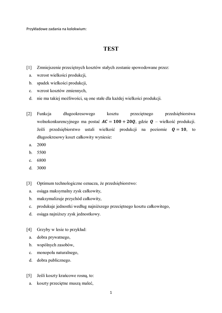 Przykładowe zadania na kolokwium: TEST [1] Zmniejszenie przeciętnych kosztów stałych zostanie spowodowane przez: a. wzrost wielkości produkcji, b. spadek wielkości produkcji, c. wzrost kosztów zmiennych, d. nie ma takiej możliwości, są one stałe dla każdej wielkości produkcji. [2] Funkcja długookresowego kosztu wolnokonkurencyjnego ma postać Jeśli przedsiębiorstwo ustali przeciętnego , gdzie wielkość produkcji na przedsiębiorstwa – wielkość produkcji. poziomie długookresowy koszt całkowity wyniesie: a. 2000 b. 5500 c. 6800 d. 3000 [3] Optimum technologiczne oznacza, że przedsiębiorstwo: a. osiąga maksymalny zysk całkowity, b. maksymalizuje przychód całkowity, c. produkuje jednostki według najniższego przeciętnego kosztu całkowitego, d. osiąga najniższy zysk jednostkowy. [4] Grzyby w lesie to przykład: a. dobra prywatnego, b. wspólnych zasobów, c. monopolu naturalnego, d. dobra publicznego. [5] Jeśli koszty krańcowe rosną, to: a. koszty przeciętne muszą maleć, 1 , to b. koszty przeciętne muszą rosnąć, c. koszty krańcowy rosną, ale koszty przeciętne mogą maleć, d. żadne z powyższych. [6] Która zależność jest prawdziwa w przypadku monopolu: a. b. ale c. i d. ale [7] a. W sytuacji występowania efektów zewnętrznych: Ilość oraz cena dobra są optymalne z punktu widzenia społeczeństwa, jeśli występuje pozytywny efekt zewnętrzny. b. Ilość dobra oraz cena są zbyt małe w sytuacji występowania negatywnego efektu zewnętrznego. c. W sytuacji braku kosztów transakcyjnych podmioty prywatne w wyniku negocjacji mogą dokonać alokacji zasobów internalizując występowanie efektów zewnętrznych. d. Ilość dobra jest zbyt duża a cena dobra zbyt mała niż to wynika z optimum społecznego w sytuacji występowania pozytywnych efektów zewnętrznych. [8] Na rynku monopolista sprzedaje 10 jednostek produktu po 12zł za sztukę. Jeśli chciałby sprzedać 11 jednostek produktu, to uzyskałby za nie cenę 11zł za sztukę. Ile wynosi przychód krańcowy ze sprzedaży 11 jednostki produktu? a. 10 b. 12 c. 11 d. 1 [9] a. Wskaż zdanie prawdziwe: Na opadającym fragmencie krzywej przeciętnych kosztów całkowitych występują stałe przychody względem skali. b. Na płaskim fragmencie krzywej przeciętnych kosztów całkowitych występują stałe przychody względem skali. c. Na rosnącym fragmencie krzywej przeciętnych kosztów całkowitych występują 2 malejące przychody względem skali. d. Przy U kształtnej krzywej przeciętnych kosztów całkowitych mamy do czynienia zawsze ze stałymi przychodami względem skali. [10] Na rynku konkurencji doskonałej: a. Przedsiębiorstwo może uzyskiwać dodatni zysk ekonomiczny w długim okresie. b. Jeśli firma ponosi straty w krótkim okresie to w długim należy spodziewać się wyjścia niektórych przedsiębiorstw z rynku. c. Przedsiębiorstwo w krótkim okresie wstrzymuje produkcję jeśli d. Pojedyncze przedsiębiorstwo wpływa na cenę produktu na rynku poprzez zmianę ilości . produkowanego dobra, Pytania otwarte: Zad 1. Odpowiadając na pytania w poniższej tabelce przyporządkuj lokalizację następujących rodzajów dóbr: dobra prywatne, monopole naturalne, wspólne zasoby, dobra publiczne. Czy dobro jest konkurencyjne? Tak Nie Tak Czy dobro jest wykluczalne? Nie Określ jakim typem dóbr są następujące dobra: (odpowiedź krótko uzasadnij) Odzież Telefonia komórkowa Grzyby w lesie państwowym Oświetlenie uliczne 3 Chodnik przy ulicy w mieście Ryby w rzece Książka Płatne autostrady o niewielkim natężeniu ruchu Zad 2. Na poniższym wykresie przedstawiono krzywe przychodu przeciętnego, przychodu krańcowego oraz kosztu przeciętnego i kosztu krańcowego monopolisty. 250 200 150 100 AC 50 0 0 a. b. c. d. 5 10 15 20 25 30 35 40 45 50 Oznacz osie oraz krzywe. Przy jakich cenie i ilości monopolista będzie maksymalizował swoje zyski? Zapisz warunek również na symbolach ogólnych. Jaka będzie cena, marża monopolistyczna, zysk jednostkowy oraz zysk całkowity? Pokaż je na rysunku. Policz stratę pustą z tytułu monopolu. Pokaż ją na rysunku. 4 ZADANIA Zad. 1 Funkcja produkcji przedsiębiorstwa jest postaci , gdzie L = liczba zatrudnionych pracowników, Y – wielkość produkcji. Przedsiębiorstwo nie ponosi kosztów stałych związanych z produkcji, wynagrodzenie jednego pracownika kształtuje się na poziomie 2000zł. Firma jest monopolistą i napotyka krzywą popytu rynkowego postaci: . a. b. c. Zad. Wyznacz punkt równowagi rynkowej. Ile monopolista będzie produkował i jakiej ceny będzie żądał za swoje produkty? Ile wyniesie marża monopolistyczna, a ile zysk jednostkowy przy optymalnej wielkości produkcji? Narysuj wykres obrazujący krzywe MC, MR i AR. Zaznacz równowagę na rynku monopolistycznym oraz wyznacz (algebraicznie i graficznie) jaka byłaby równowaga na rynku konkurencji doskonałej? Ile wynosi strata pusta z tytułu działania monopolu? Oblicz ją oraz zaznacz na wykresie. 2 Funkcja krótkookresowych kosztów wolnokonkurencyjnego ma postać całkowitych przedsiębiorstwa . Przedsiębiorstwo sprzedaje swoje produkty za 40zł za sztukę. a. b. c. Podaj postać algebraiczną: kosztu stałego, kosztu zmiennego, przeciętnego kosztu całkowitego, przeciętnego kosztu zmiennego, przeciętnego kosztu stałego. Jaką ilość wyrobów powinno wytwarzać to przedsiębiorstwo aby maksymalizować zysk całkowity? Podaj postać algebraiczną krótkookresowej krzywej podaży przedsiębiorstwa. Przy jakiej cenie firma wstrzyma produkcję? 5