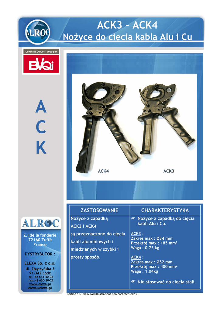 ACK3 – ACK4 NoŜyce do cięcia kabla Alu i Cu A C K ACK4 ACK3 ZASTOSOWANIE NoŜyce z zapadką ACK3 i ACK4 Z.I de la fonderie 72160 Tuffé France są przeznaczone do cięcia kabli aluminiowych i miedzianych w szybki i DYSTRYBUTOR : ELEXA Sp. z o.o. Ul. Zbąszyńska 3 91-342 Łódź tel. 42 633-40-08 fax: 42 630-20-22 www.elexa.pl [email protected] prosty sposób. CHARAKTERYSTYKA NoŜyce z zapadką do cięcia kabli Alu i Cu. ACK3 : Zakres max : Ø34 mm Przekrój max : 185 mm² Waga : 0.75 kg ACK4 : Zakres max : Ø52 mm Przekrój max : 400 mm² Waga : 1.04kg Nie stosować do cięcia stali. Edition 12/ 2006 /A0 Illustrations non contractuelles