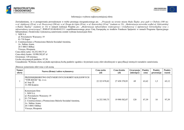 Informacja o wyborze najkorzystniejszej oferty Zawiadamiamy, że w postępowaniu prowadzonym w trybie przetargu nieograniczonego pn.: „Przejazdy na terenie miasta Ruda Śląska: przy pętli w Chebziu (100 m); w ul. Asfaltowej (20 m); w ul. Dworcowej (286 m); w ul. Droga do Lipin (20 m); w ul. Katowickiej (10 m)” (zadanie nr 53), „Modernizacja torowiska wzdłuż ul. Zabrzańskiej w Rudzie Śląskiej” (zadanie nr 55) w ramach realizacji Projektu pn.: „Modernizacja infrastruktury tramwajowej i trolejbusowej w Aglomeracji Górnośląskiej wraz z infrastrukturą towarzyszącą”, POIS.07.03.00-00-012/11 współfinansowanego przez Unię Europejską ze środków Funduszu Spójności w ramach Programu Operacyjnego Infrastruktura i Środowisko wykonawcą zamówienia zostało wybrane konsorcjum firm: 1. NDI S.A. ul. Powstańców Warszawy 19 81-718 Sopot 2. Construcctiones y Promociones Balzola Sociadad Anonima, Av. Sabino Arana, 20 3 48013 Bilbao Vizcaya, Hiszpania Cena oferty netto: 16.252.505,75 zł Cena oferty brutto: 19.990.582,07 zł Gwarancja: 120 miesięcy Liczba otrzymanych punktów: 97,39. Uzasadnienie: Wybrana oferta uzyskała największą liczbę punktów zgodnie z kryteriami oceny ofert określonymi w specyfikacji istotnych warunków zamówienia. Zbiorcze zestawienie ofert wraz z ich oceną Numer oferty Nazwa (firma) i adres wykonawcy Cena netto (zł) 1 PRZEDSIĘBIORSTWO INŻYNIERYJNYCH ROBÓT KOLEJOWYCH "TOR-KRAK" Sp. z o.o. ul. Isep 2E 31-588 Kraków 22 323 878,82 2 Konsorcjum firm: 1. NDI S.A. ul. Powstańców Warszawy 19 81-718 Sopot 2. Construcctiones y Promociones Balzola Sociadad Anonima, Av. Sabino Arana, 20 3 48013 Bilbao Vizcaya, Hiszpania 16 252 505,75 Cena brutto (zł) Gwarancja (miesiące) Punkty cena Punkty gwarancja Punkty razem 27 458 370,95 69 63,62 1,5 65,12 19 990 582,07 120 87,39 10 97,39 Numer oferty Nazwa (firma) i adres wykonawcy Cena netto (zł) Cena brutto (zł) Gwarancja (miesiące) Punkty cena Punkty gwarancja Punkty razem 3 Przedsiębiorstwo Usług Technicznych INTERCOR Sp. z o.o. ul. Okólna 10 42-400 Zawiercie 21 196 159,05 26 071 275,63 80 67,01 3,33 70,34 4 Konsorcjum firm 1. Kolejowe Zakłady Nawierzchniowe „Bieżanów” Sp. z o.o. ul. Półłanki 25 30-740 Kraków 2. Przedsiębiorstwo Napraw i Utrzymania Infrastruktury Kolejowej w Krakowie Sp. z o.o. ul. Prokocimska 4 30-556 Kraków 26 668 289,74 32 801 996,38 60 53,26 0 53,26 5 Konsorcjum firm: 1. Skanska S.A. ul. Gen. J. Zajączka 9 01-518 Warszawa 2. Skanska a.s. Libalova 1/2348 149 00 Praga 4 Chodov, Republika Czeska 18 069 715,44 22 225 749,99 120 78,60 10 88,60 6 ZUE S.A. ul.Kazimierza Czapińskiego 3 30-048 Kraków 15 780 732,52 19 410 301,00 96 90,00 6 96,00