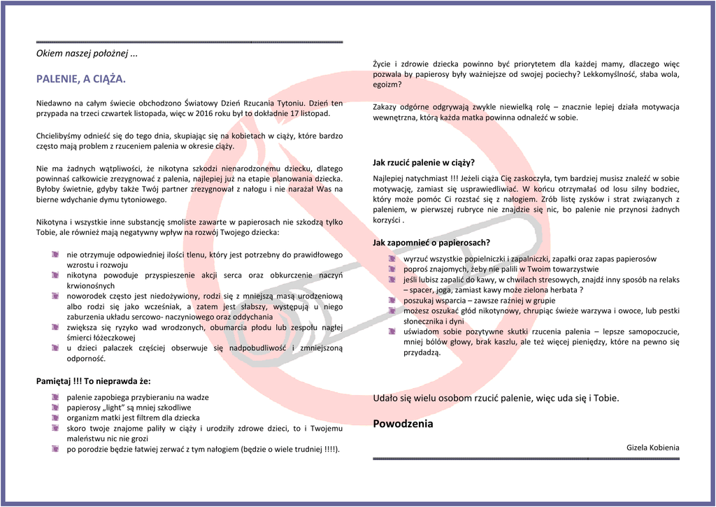 Okiem naszej położnej ... PALENIE, A CIĄŻA. Życie i zdrowie dziecka powinno być priorytetem dla każdej mamy, dlaczego więc pozwala by papierosy były ważniejsze od swojej pociechy? Lekkomyślność, słaba wola, egoizm? Niedawno na całym świecie obchodzono Światowy Dzień Rzucania Tytoniu. Dzień ten przypada na trzeci czwartek listopada, więc w 2016 roku był to dokładnie 17 listopad. Zakazy odgórne odgrywają zwykle niewielką rolę – znacznie lepiej działa motywacja wewnętrzna, którą każda matka powinna odnaleźć w sobie. Chcielibyśmy odnieść się do tego dnia, skupiając się na kobietach w ciąży, które bardzo często mają problem z rzuceniem palenia w okresie ciąży. Nie ma żadnych wątpliwości, że nikotyna szkodzi nienarodzonemu dziecku, dlatego powinnaś całkowicie zrezygnować z palenia, najlepiej już na etapie planowania dziecka. Byłoby świetnie, gdyby także Twój partner zrezygnował z nałogu i nie narażał Was na bierne wdychanie dymu tytoniowego. Nikotyna i wszystkie inne substancję smoliste zawarte w papierosach nie szkodzą tylko Tobie, ale również mają negatywny wpływ na rozwój Twojego dziecka: Jak rzucić palenie w ciąży? Najlepiej natychmiast !!! Jeżeli ciąża Cię zaskoczyła, tym bardziej musisz znaleźć w sobie motywację, zamiast się usprawiedliwiać. W końcu otrzymałaś od losu silny bodziec, który może pomóc Ci rozstać się z nałogiem. Zrób listę zysków i strat związanych z paleniem, w pierwszej rubryce nie znajdzie się nic, bo palenie nie przynosi żadnych korzyści . Jak zapomnieć o papierosach? nie otrzymuje odpowiedniej ilości tlenu, który jest potrzebny do prawidłowego wzrostu i rozwoju nikotyna powoduje przyspieszenie akcji serca oraz obkurczenie naczyń krwionośnych noworodek często jest niedożywiony, rodzi się z mniejszą masą urodzeniową albo rodzi się jako wcześniak, a zatem jest słabszy, występują u niego zaburzenia układu sercowo- naczyniowego oraz oddychania zwiększa się ryzyko wad wrodzonych, obumarcia płodu lub zespołu nagłej śmierci łóżeczkowej u dzieci palaczek częściej obserwuje się nadpobudliwość i zmniejszoną odporność. wyrzuć wszystkie popielniczki i zapalniczki, zapałki oraz zapas papierosów poproś znajomych, żeby nie palili w Twoim towarzystwie jeśli lubisz zapalić do kawy, w chwilach stresowych, znajdź inny sposób na relaks – spacer, joga, zamiast kawy może zielona herbata ? poszukaj wsparcia – zawsze raźniej w grupie możesz oszukać głód nikotynowy, chrupiąc świeże warzywa i owoce, lub pestki słonecznika i dyni uświadom sobie pozytywne skutki rzucenia palenia – lepsze samopoczucie, mniej bólów głowy, brak kaszlu, ale też więcej pieniędzy, które na pewno się przydadzą. Pamiętaj !!! To nieprawda że: palenie zapobiega przybieraniu na wadze papierosy „light” są mniej szkodliwe organizm matki jest filtrem dla dziecka skoro twoje znajome paliły w ciąży i urodziły zdrowe dzieci, to i Twojemu maleństwu nic nie grozi po porodzie będzie łatwiej zerwać z tym nałogiem (będzie o wiele trudniej !!!!). Udało się wielu osobom rzucić palenie, więc uda się i Tobie. Powodzenia Gizela Kobienia