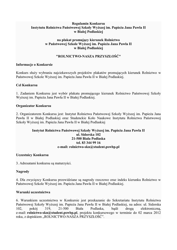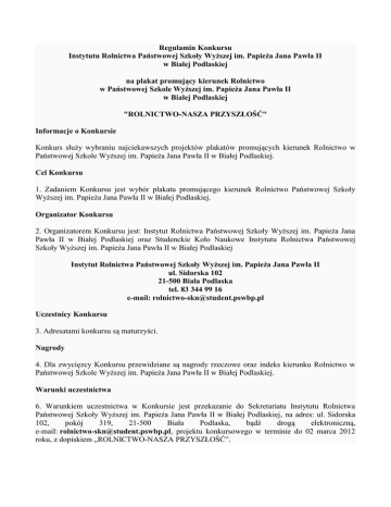 Regulamin Konkursu Instytutu Rolnictwa Państwowej Szkoły Wyższej im. Papieża Jana Pawła II w Białej Podlaskiej na plakat promujący kierunek Rolnictwo w Państwowej Szkole Wyższej im. Papieża Jana Pawła II w Białej Podlaskiej "ROLNICTWO-NASZA PRZYSZŁOŚĆ" Informacje o Konkursie Konkurs służy wybraniu najciekawszych projektów plakatów promujących kierunek Rolnictwo w Państwowej Szkole Wyższej im. Papieża Jana Pawła II w Białej Podlaskiej. Cel Konkursu 1. Zadaniem Konkursu jest wybór plakatu promującego kierunek Rolnictwo Państwowej Szkoły Wyższej im. Papieża Jana Pawła II w Białej Podlaskiej. Organizator Konkursu 2. Organizatorem Konkursu jest: Instytut Rolnictwa Państwowej Szkoły Wyższej im. Papieża Jana Pawła II w Białej Podlaskiej oraz Studenckie Koło Naukowe Instytutu Rolnictwa Państwowej Szkoły Wyższej im. Papieża Jana Pawła II w Białej Podlaskiej Instytut Rolnictwa Państwowej Szkoły Wyższej im. Papieża Jana Pawła II ul. Sidorska 102 21-500 Biała Podlaska tel. 83 344 99 16 e-mail: [email protected] Uczestnicy Konkursu 3. Adresatami konkursu są maturzyści. Nagrody 4. Dla zwycięzcy Konkursu przewidziane są nagrody rzeczowe oraz indeks kierunku Rolnictwo w Państwowej Szkole Wyższej im. Papieża Jana Pawła II w Białej Podlaskiej. Warunki uczestnictwa 6. Warunkiem uczestnictwa w Konkursie jest przekazanie do Sekretariatu Instytutu Rolnictwa Państwowej Szkoły Wyższej im. Papieża Jana Pawła II w Białej Podlaskiej, na adres: ul. Sidorska 102, pokój 319, 21-500 Biała Podlaska, bądź drogą elektroniczną, e-mail: [email protected], projektu konkursowego w terminie do 02 marca 2012 roku, z dopiskiem „ROLNICTWO-NASZA PRZYSZŁOŚĆ”. 7. Złożenie projektu plakatu jest równoznaczne z udzieleniem Organizatorowi Konkursu zgody na wielokrotne nieodpłatne publikowanie plakatu oraz podanie nazwiska autora w materiałach promocyjnych związanych z Konkursem, a także na wykorzystanie plakatu w celach promocyjnych. Ogłoszenie wyników Konkursu 8. Rozstrzygnięcie Konkursu nastąpi w terminie 12 marca 2012 roku, a laureat zostanie powiadomiony o wygranej telefonicznie. 9. Wyniki Konkursu zostaną ogłoszone podczas Dni Otwartych Państwowej Szkoły Wyższej im. Papieża Jana Pawła II w Białej Podlaskiej, dnia 15 marca 2012 roku. Jury Konkursu 10. Wyboru projektu dokona Jury powołane przez Dyrektora Instytutu Rolnictwa Państwowej Szkoły Wyższej im. Papieża Jana Pawła II w Białej Podlaskiej. 11. Decyzja Jury jest ostateczna, a uczestnikom nie przysługuje prawo do odwołań. Warunki techniczne projektów 12. Technika wykonania prac jest dowolna. 13. Uczestnicy mogą nadsyłać dowolną liczbę plakatów. 14. Projekty plakatów należy przesyłać na płycie CD, DVD lub e-mailem, w formacie JPG. Dopuszcza się również możliwość przesłania projektów wykonanych ręcznie na papierze (w przypadku prac plastycznych). 15. Do każdego projektu powinna być dołączona informacja z podaniem imienia i nazwiska autora, adresu, telefonu, e-maila, nazwy i adresu szkoły oraz klasy. Zobowiązania końcowe 16. Praca konkursowa nie może być wcześniej publikowana i nie może naruszać praw osób trzecich, a w szczególności cudzych praw autorskich. 17. Koszty dostarczenia projektów pokrywa uczestnik. Prace nie będą odsyłane. 18. Organizator Konkursu nie ponosi odpowiedzialności za ewentualne przedłużenie, skrócenie, zmiany lub odwołanie Konkursu z przyczyn od niego niezależnych. 19. Przystąpienie do Konkursu oznacza wyrażenie zgody bez zastrzeżeń na warunki niniejszego Regulaminu. 20. Wszelkie zapytania i informacje należy kierować elektronicznie na adres: [email protected]. Osobą do kontaktu z ramienia Organizatora jest Magdalena Us, tel. 508 604 721. Biała Podlaska, 28.11.2011