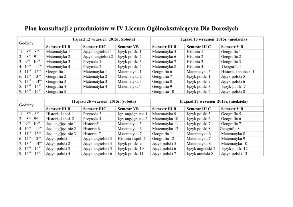 Plan konsultacji z przedmiotów w IV Liceum Ogólnokształcącym Dla Dorosłych I zjazd 12 wrzesień 2015r. (sobota) Godziny 00 45 1. 8 - 8 2. 850 - 935 3. 940 - 1025 4. 1045 – 1130 5. 1135 - 1220 6. 1225 - 1310 7. 1315 – 1400 8. 1405 - 1450 9. 1455 - 1540 Godziny 1. 800 - 845 2. 850 - 935 3. 940 - 1025 4. 1045 – 1130 5. 1135 - 1220 6. 1225 - 1310 7. 1315 – 1400 8. 1405 - 1450 9. 1455 - 1540 Semestr III B Matematyka 1 Matematyka 2 Matematyka 3 Matematyka 4 Geografia 1 Geografia 2 Geografia 3 Geografia 4 Geografia 5 Semestr IIIC Język angielski 1 Język angielski 2 Przyroda 1 Przyroda 2 Matematyka 1 Matematyka 2 Matematyka 3 Matematyka 4 Semestr VB Język polski 1 Język polski 2 Język polski 3 Język polski 4 Matematyka 1 Matematyka 2 Matematyka 3 Matematyka4 I zjazd 13 wrzesień 2015r. (niedziela) Semestr III B Matematyka 5 Matematyka 6 Matematyka 7 Matematyka 8 Geografia 6 Geografia 7 Geografia 8 Geografia 9 Geografia 10 II zjazd 26 wrzesień 2015r. (sobota) Semestr III B Historia i społ. 1 Historia i społ. 2 Jęz. ang/jęz. nie.1 Jęz. ang/jęz. nie.2 Jęz. ang/jęz. nie.3 Język polski 1 Język polski 2 Język polski 3 Język polski 4 Semestr IIIC Przyroda 3 Przyroda 4 Historia5 Historia 6 Historia 7 Język angielski 3 Język angielski 4 Język angielski 5 Język angielski 6 Semestr VB Jęz. ang/jęz. nie.1 Jęz. ang/jęz. nie.2 Matematyka 5 Matematyka 6 Matematyka 7 Historia i społ. 2 Język polski 9 Język polski 10 Język polski 11 Semestr III C Historia 1 Historia 2 Historia 3 Historia 4 Matematyka 5 Język polski 1 Język polski 2 Język polski 3 Język polski 4 Semestr V B Geografia 1 Geografia 2 Geografia 3 Geografia 4 Historia i społecz. 1 Język polski 5 Język polski 6 Język polski 7 Język polski 8 II zjazd 27 wrzesień 2015r. (niedziela) Semestr III B Matematyka 9 Matematyka 10 Matematyka 11 Matematyka 12 Geografia 11 Geografia 12 Język polski 5 Język polski 6 Język polski 7 Semestr III C Język polski 5 Język polski 6 Język polski 7 Język polski 8 Matematyka 6 Matematyka 7 Matematyka 8 Język angielski 7 Język anielski 8 Semestr V B Geografia 5 Geografia 6 Geografia 7 Geografia 8 Matematyka 8 Matematyka 9 Matematyka 10 Język polski 12 Język polski 13 III zjazd 10 październik 2015r. (sobota) Godziny 1. 800 - 845 2. 850 - 935 3. 940 - 1025 4. 1045 – 1130 5. 1135 - 1220 6. 1225 - 1310 7. 1315 – 1400 8. 1405 - 1450 9. 1455 - 1540 Semestr IIIC Język polski 9 Język polski 10 Język polski 11 Język polski 12 Język angielski 9 Język anielski 10 Język angielski 11 Język anielski 12 Język anielski 13 Semestr VB Matematyka 11 Matematyka 12 Matematyka 13 Geografia 9 Geografia 10 Geografia 11 Język polski 14 Język polski 15 Język polski 16 IV zjazd 24 październik 2015r. (sobota) Godziny 00 Semestr III B Jęz. ang/jęz. nie.4 Jęz. ang/jęz. nie.5 Jęz. ang/jęz. nie.6 Jęz. ang/jęz. nie.7 Język polski 8 Język polski 9 Język polski 10 Język polski 11 Język polski 12 45 1. 8 - 8 2. 850 - 935 3. 940 - 1025 4. 1045 – 1130 5. 1135 - 1220 6. 1225 - 1310 7. 1315 – 1400 8. 1405 - 1450 9. 1455 - 1540 Semestr III B Język polski 13 Język polski 14 Język polski 15 Język polski 16 Matematyka 17 Matematyka 18 Matematyka 19 Matematyka 20 Semestr IIIC Historia 12 Historia 13 Historia 14 Historia 15 Przyroda 5 Język polski 13 Język polski 14 Język polski 15 Język polski 16 Semestr VB Matematyka 18 Matematyka 19 Matematyka 20 Matematyka 21 Historia i społ. 5 Historia i społ. 6 Geografia 12 Geografia 13 Geografia 14 III zjazd 11 październik 2015r. (niedziela) Semestr III B Matematyka 13 Matematyka 14 Matematyka 15 Matematyka 16 Historia i społ. 3 Historia i społ. 4 Geografia 13 Geografia 14 Geografia 15 Semestr III C Historia 8 Historia 9 Historia 10 Historia 11 Matematyka 9 Matematyka 10 Matematyka 11 Język anielski 14 Język anielski 15 Semestr V B Matematyka 14 Matematyka 15 Matematyka 16 Matematyka 17 Jęz. ang/jęz. nie.3 Jęz. ang/jęz. nie.4 Jęz. ang/jęz. nie.5 Historia i społ. 3 Historia i społ. 4 IV zjazd 25 październik 2015r. (niedziela) Semestr III B Historia i społ. 5 Historia i społ. 6 Historia i społ. 7 Matematyka 21 Matematyka 22 Matematyka 23 Jęz. ang/jęz. nie.8 Jęz. ang/jęz. nie.9 Jęz.ang/jęz.nie.10 Semestr III C Język anielski 16 Język anielski 17 Język anielski 18 Historia 16 Historia 17 Historia 18 Matematyka 12 Matematyka 13 Matematyka 14 Semestr V B Matematyka 22 Matematyka 23 Matematyka 24 Matematyka 25 Jęz. ang/jęz. nie.6 Jęz. ang/jęz. nie.7 Język polski 17 Język polski 18 Język polski 19 V zjazd 14 listopad 2015r. (sobota) Godziny 1. 800 - 845 2. 850 - 935 3. 940 - 1025 4. 1045 – 1130 5. 1135 - 1220 6. 1225 - 1310 7. 1315 – 1400 8. 1405 - 1450 9. 1455 - 1540 Semestr IIIC Język polski 17 Język polski 18 Język polski 19 Język polski 20 Przyroda 6 Język anielski 19 Język anielski 20 Język anielski 21 Język anielski 22 Semestr VB Matematyka 26 Matematyka 27 Matematyka 28 Matematyka 29 Geografia 15 Geografia 16 Geografia 17 Geografia 18 VI zjazd 28 listopad 2015r. (sobota) Godziny 00 Semestr III B Matematyka 24 Matematyka 25 Matematyka 26 Matematyka 27 Język polski 17 Język polski 18 Język polski 19 Język polski 20 Geografia 16 45 1. 8 - 8 2. 850 - 935 3. 940 - 1025 4. 1045 – 1130 5. 1135 - 1220 6. 1225 - 1310 7. 1315 – 1400 8. 1405 - 1450 9. 1455 - 1540 Semestr III B Język polski 21 Język polski 22 Język polski 23 Język polski 24 Geografia 20 Geografia 21 Geografia 22 Geografia 23 Geografia 24 Semestr IIIC Historia 24 Historia 25 Historia 26 Historia 27 Historia 28 Język polski 21 Język polski 22 Język polski 23 Język polski 24 Semestr VB Geografia 22 Geografia 23 Geografia 24 Geografia 25 Matematyka 30 Historia i społ. 7 Historia i społ. 8 Historia i społ. 9 V zjazd 15 listopad 2015r. (niedziela) Semestr III B Geografia 17 Geografia 18 Geografia 19 Jęz.ang/jęz nie.11 Jęz.ang/jęz.nie.12 Matematyka 28 Matematyka 29 Matematyka 30 Matematyka 31 Semestr III C Hist