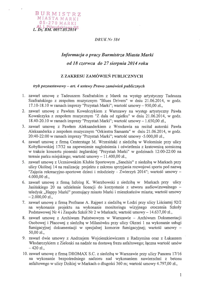 BUR 1\1 1ST R Z MIASTA MARKI 05-270 MARKI s L.1Jzhfd btff .~ .~~1~5 DRUKNr584 Informacja 0 pracy Burmistrza Miasta Marki od 18 czerwca do 27 sierpnia 2014 roku Z ZAKRESU ZAMOWIEN PUBLICZNYCH tryb pozaustawowy - art 4 ustawy Prawo zam6wien publicznych 1. zawarl umOWy z Tadeuszem Szafrailskim z Marek na wystyp artystyczny Tadeusza Szafrailskiego z zespolem muzycznym "Blues Drivers" w dniu 21.06.2014, w godz. 17.10-18.10 w ramach imprezy "Przystan Marki"; wartosc umowy - 950,00 zl., 2. zawarl umOWy z Pawlem Kowalczykiem z Warszawy na wystyp artystyczny Pciwla Kowalczyka z zespolem muzycznym "Z dala od zgielku" w dniu 21.06.2014, w godz. 18.40-20.10 w ramach imprezy "Przystan Marki"; wartosc umowy - 1.650,00 zl., 3. zawarl umOWy z Pawlem Aleksanderkiem z Wroclawia na recital autorski Pawla Aleksanderka z zespolem muzycznym "Orkiestra Samanta" w dniu 21.06.2014, w godz. 20:40-22:00 w ramach imprezy "Przystan Marki"; wartosc umowy -5.000,00 zl., 4. zawarl umOWy z firm,!- Centerstage M. Wrzesinski z siedzib,!- w Wolominie przy ulicy Kobylkowskiej 17/32 na zapewnienie naglosnienia i oswietlenia z kratownic,!- sceniczn,!w trakcie koncertu piosenki zeglarskiej "Przystail Marki" w godzinach 12:00-22:00 na terenie parku miejskiego; wartosc umowy - 11.400,00 zl., 5. zawarl umOWy z Uczniowskim Klubie Sportowym "Sanchin" z siedzib,!- w Markach przy ulicy Ok6lnej 14 na realizacjy projektu z zakresu sprzyjania rozwojowi sportu pod nazw'!"Zajycia rekreacyjno-sportowe dzieci i mlodzieZy - Zwierzyll 2014"; wartosc umowy 4.000,00 zl., 6. zawarl umOWy z firm,!- Infolog K. Wierzbowski z siedzib,!- w Markach przy ulicy · Jasinskiego 20 na udzielenie licencji do korzystanie z utworu audiowizuwalnego teledysk "Happy Marki" promuj,!-cy rniasto Marki i mieszkailc6w rniasta; wartosc umciwy - 2.000,00 zl., 7. zawarl umOWy z firm,!- Pro frame A. Rajpert z siedzib,!- w Lodzi przy ulicy Lisciastej 92/2 na wykonanie projektu na wykonarue monitoringu wizyjnego otoczerua Szkoly Podstawowej Nr 4 i Zespolu Szk6l Nr 2 w Markach; wartosc umowy - 14.637,00 zl., 8. zawarl umOWy z Archiwum Pailstwowym w Warszawie - Archiwum Dokumentacji Osobowej i Placowej z siedzib,!- w Milan6wku przy ulicy Okrzei 1 na wykonanie uslugi fumigacyjnej dokumentacji w specjalnej komorze fumigacyjnej; wartosc umowy 50,00 zl., 9. zawarl dwie umowy z Andrzejem Wojcieszkiewiczem z Radzymina oraz z Lukaszem Wlodarczykiem z Zielonki na nadz6r na dostaw,!- frezu asfaltowego; l,!-czna wartosc um6w - 420 zl., 10. zawarl umOWy z firm,!- DROMAX S.C. z siedzib,!- w Warszawie przy ulicy Pancera 17/16 na wykonanie bezposredniego nadzoru nad wykonaniem nawierzchni z betonu asfaltowego w ulicy Dzikiej w Markach 0 dlugosci 360 m; wartosc umowy 4.797,00 zl., 1 11 . zawarl umowy z firm,! Sygnity S.A. z siedzib,! w Warszawie przy alejach Jerozolimskich 180 na swiadczenie uslugi serwisu eksploatacyjnego oprogramowania komputerowego System Ewidencji Ludnosci (SELWIN) oraz Rejestru Wyborcow (RWWIN); wartosc umowy - 1.353,00 zl., 12. zawarl umowy z firm,! ZBIGBUD Zbigniew Mi'!cz z siedzib,! w Warszawie przy ulicy Kadrowej 99 10k. 402 na remont pomieszczenia biurowego Urzydu Miasta Marki; wartosc umowy - 4.080,00 zl., 13. zawarl umowy z fmn,! PHU Dudzinscy C. Dudzinski z siedzib,! w Warszawie przy ulicy Lewandow 11 na wynajem toalet przenosnych w dniu 26.07.2014 "VII Memorial Huberta Manteuffla 0 puchar Burmistrza Miasta Marki"; wartosc umowy - bezplatna, 14. zawarl umowy z firm,! Uslugi Budowy Drog z siedzib,! w Wolominie przy ulicy Lukasiewicza 10 na wykonanie dwoch progow zwa1niaj,!cych w ulicy gen. J. Sowinskiego w Markach; wartosc umowy - 5.019,00 zl., 15. zawarl umowy z Powiatem Wolominskim z siedzib,! w Wolominie przy ul. Pr,!dzyilskiego 3 na przygotowanie dokumentacji projektowo - kosztorysowej budowy szkoly ponadgimnazjalnej wraz z laboratorium przy ul. Wspolnej w Markach; wartosc umowy 390.000,00 zl., 16. zawarl umowy z Jerzym Siedlarczykiem z Wyszkowa na wykonanie repliki siodla kawaleryjskiego wzor ,,36"d1a Stowarzyszenia Milosnikow Kawalerii im. I Pulku Ulanow Krechowieckiech z Kobylki; wartosc umowy - 3.500,00 zl. , 17. zawarl umOWy z firm,! Przedsiybiorstwo Hydro - Trans z siedzib,! w Markach przy ulicy Mieszka I 17111 na budowy studni chlonnej na skrzyzowaniu ulic Jana III Sobieskiego i Rydza Smiglego w Markach; wartosc umowy - 5.990,10 zl., 18. zawarl umowy z Hann,! Zlotoszewsk'!- Niedzialek z Warszawy na sporz,!dzenie opinii w charakterze bieglego w sprawie zmiany stanu wody na gruncie dzialek or ewid. 178/1 , 178/2, 179 w obr. 5-04 przy ulicy Warszawskiej w Markach; wartosc umowy 2.800,00 zl., 19. zawarl porozumienie z Powiatem Wolominskim z siedzib,! w Wolominie przy ulicy Pr,!dzyilskiego 3 na podjycia wspolpracy przy budowie obiektow gimnazjum i szkoly ponadgimnazjalnej przy ulicy Wspolnej w Markach; wartosc umowy - 13.000.000,00 zl., 20. zawarl umowy z fmn,! VIATAR S.C. z siedzib,! w Tamowie przy ulicy Wita Stwosza 18 na przebudowy sygnalizacji swietlnej na skrzyzowaniu ulic Okolna i Bandurskiego w Markach; wartosc umowy - 30.000,00 zl., 21. zawarl umowy z fmn,! DROMAX S.C. R. Lulis i W. Lulis z siedzib,! w Warszawie przy ulicy Pancera 17116 na wykonanie nadzoru inwestorskiego nad budow,! kompleksu rekreacyjno - sportowego przy ulicy Turystycznej w Markach; wartosc umowy - 7.134,00 zl., 22. zawarl trzy umowy z Bogumil,! Kozakiewicz z Warszawy, Ludmil,! Choinsk,! z Warszawy oraz Robertem Danielakiem z Marek na uczestnictwo w posiedzeniu Gminnej komisji urbanistyczno - architektonicznej w sprawie miejscowego planu zagospodarowania przestrzennego osiedla "Lesna" ; l'!czna wartosc umow - 1.400,00 zl., 23. zawarl umowy z fmn,! Uslugi Budowy Drog Z. Rakowski z siedzib,! w Wolominie przy ulicy Lukasiewicza 10 na wykonanie 9 progow zwalniaj'!cych w ulicy Braci Briggsow w Markach; wartosc umowy - 24.711 ,19 zl., 24. zawarl umowy z firm,! Szorta1 Sp. z 0.0. z siedzib,! w Warszawa przy ulicy Grubowskiej 80/82 na organizacjy 4 pokazow filmowych na terenie Parku Mi
