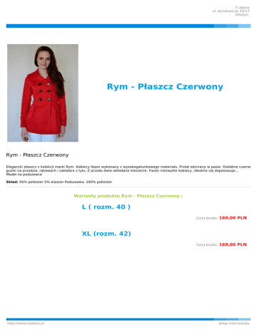 Ti Adoro ul. Jeziołowicza 25/12 Olsztyn Rym - Płaszcz Czerwony Rym - Płaszcz Czerwony Elegancki płaszcz z kolekcji marki Rym. Kobiecy fason wykonany z wysokogatunkowego materiału. Przód odcinany w pasie. Ozdobne czarne guziki na przodzie, rękawach i zakładce z tyłu. Z przodu dwie wkładane kieszenie. Fason niezwykle kobiecy, idealnie się dopasowuje... Model na podszewce Skład: 95% poliester 5% elastan Podszewka: 100% poliester Warianty produktu Rym - Płaszcz Czerwony : L ( rozm. 40 ) Cena brutto: 169,00 PLN Cena brutto: 169,00 PLN XL (rozm. 42) http://www.tiadoro.pl sklep internetowy