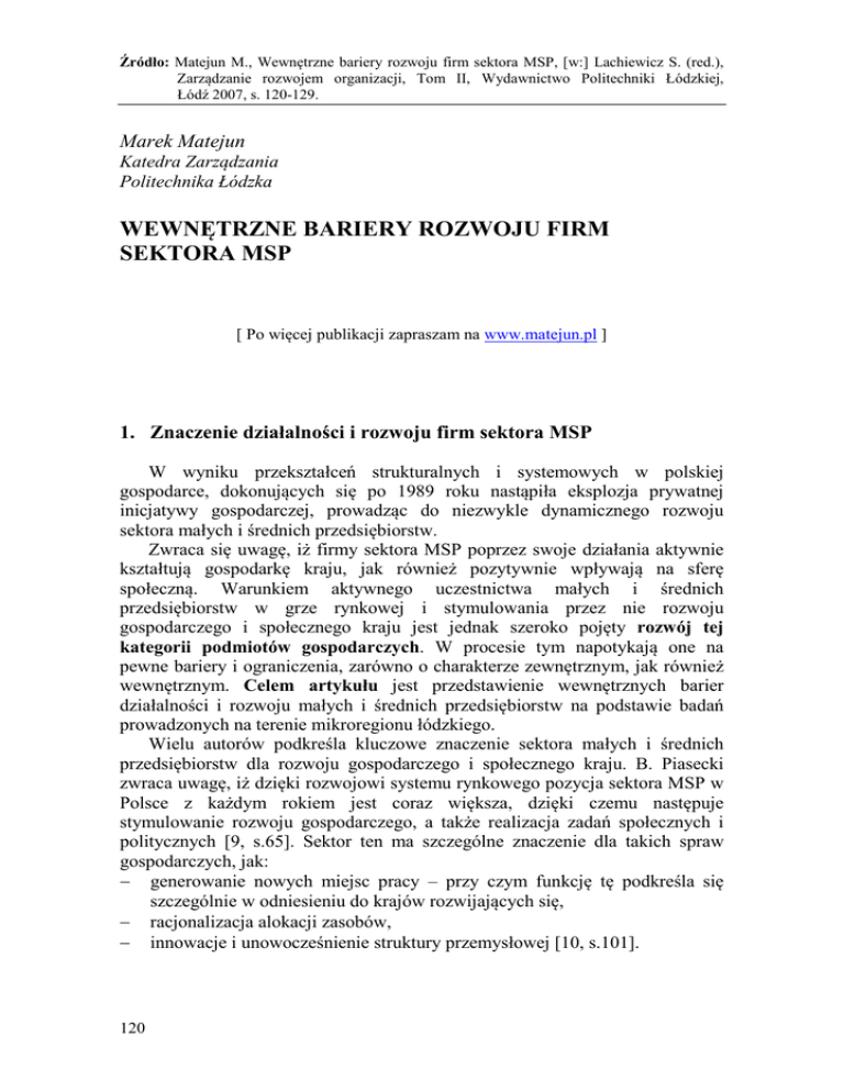 Źródło: Matejun M., Wewnętrzne bariery rozwoju firm sektora MSP, [w:] Lachiewicz S. (red.), Zarządzanie rozwojem organizacji, Tom II, Wydawnictwo Politechniki Łódzkiej, Łódź 2007, s. 120-129. Marek Matejun Katedra Zarządzania Politechnika Łódzka WEWNĘTRZNE BARIERY ROZWOJU FIRM SEKTORA MSP [ Po więcej publikacji zapraszam na www.matejun.pl ] 1. Znaczenie działalności i rozwoju firm sektora MSP W wyniku przekształceń strukturalnych i systemowych w polskiej gospodarce, dokonujących się po 1989 roku nastąpiła eksplozja prywatnej inicjatywy gospodarczej, prowadząc do niezwykle dynamicznego rozwoju sektora małych i średnich przedsiębiorstw. Zwraca się uwagę, iż firmy sektora MSP poprzez swoje działania aktywnie kształtują gospodarkę kraju, jak również pozytywnie wpływają na sferę społeczną. Warunkiem aktywnego uczestnictwa małych i średnich przedsiębiorstw w grze rynkowej i stymulowania przez nie rozwoju gospodarczego i społecznego kraju jest jednak szeroko pojęty rozwój tej kategorii podmiotów gospodarczych. W procesie tym napotykają one na pewne bariery i ograniczenia, zarówno o charakterze zewnętrznym, jak również wewnętrznym. Celem artykułu jest przedstawienie wewnętrznych barier działalności i rozwoju małych i średnich przedsiębiorstw na podstawie badań prowadzonych na terenie mikroregionu łódzkiego. Wielu autorów podkreśla kluczowe znaczenie sektora małych i średnich przedsiębiorstw dla rozwoju gospodarczego i społecznego kraju. B. Piasecki zwraca uwagę, iż dzięki rozwojowi systemu rynkowego pozycja sektora MSP w Polsce z każdym rokiem jest coraz większa, dzięki czemu następuje stymulowanie rozwoju gospodarczego, a także realizacja zadań społecznych i politycznych [9, s.65]. Sektor ten ma szczególne znaczenie dla takich spraw gospodarczych, jak: − generowanie nowych miejsc pracy – przy czym funkcję tę podkreśla się szczególnie w odniesieniu do krajów rozwijających się, − racjonalizacja alokacji zasobów, − innowacje i unowocześnienie struktury przemysłowej [10, s.101]. 120 Źródło: Matejun M., Wewnętrzne bariery rozwoju firm sektora MSP, [w:] Lachiewicz S. (red.), Zarządzanie rozwojem organizacji, Tom II, Wydawnictwo Politechniki Łódzkiej, Łódź 2007, s. 120-129. W.M. Grudzewski i I. Hejduk zwracają uwagę, iż przyspieszenie rozwoju sektora małych i średnich przedsiębiorstw jest jednym z kluczowych problemów transformacji polskiej gospodarki. Podkreślają przy tym, że badania prowadzone w krajach wysokorozwiniętych potwierdzają, że firmy zaliczane do grupy small businessu charakteryzują się dużą elastycznością działania, wysoką innowacyjnością, dynamiką wzrostu zatrudnienia, czy znaczącym udziałem we wzroście dochodu narodowego [5, s.11]. B. Nogalski i inni zauważają, iż małe i średnie przedsiębiorstwa zajmują kluczowe miejsce w polityce społeczno-ekonomicznej wielu państw, a ich rozwój uznawany jest za jedną z miar wzrostu gospodarczego oraz przejaw zdrowej konkurencji rynkowej [8, s.5]. K. Safin powołuje się na słowa P. Druckera podkreślając, że sektor MSP jest „solą gospodarki rynkowej” i stanowi bazę demokratycznego porządku społeczno-gospodarczego [12, s.47]. Z. Pierścionek podkreśla istotną rolę małych i średnich przedsiębiorstw w rozwijaniu przedsiębiorczości, nowych potrzeb, nowych dziedzin i sposobów działania. Zwraca on uwagę, że szczególna rola sektora MSP w gospodarce oraz szczególna rola społeczna sprawiają, iż są one przedmiotem zainteresowania polityki we wszystkich prawie krajach świata, co związane jest m.in. z preferencjami dla zakładania takich podmiotów oraz równoważeniem naturalnych słabości wynikających z ich niewielkiej skali działania [11, s.321]. M. Greta i T. Kostrzewa-Zielińska również wyrażają się entuzjastycznie o roli sektora MSP w gospodarce państw zjednoczonej Europy, a wśród ich zalet wymieniają m.in. ekspansywność rynkową oraz elastyczność wyrażającą się w zdolności do szybkiego dostosowania do wymagań rynkowych [3, s.103]. R.W. Griffin podkreśla również ważną rolę małych przedsiębiorstw w gospodarce Stanów Zjednoczonych, twierdząc m.in. że tworzą one więcej miejsc pracy niż przedsiębiorstwa wielkie [4, s.733]. Rozwój wiedzy na temat funkcjonowania małych i średnich przedsiębiorstw wskazuje jednak, iż należy zachować pewną ostrożność w zakresie formułowania tak pozytywnych ocen dotyczących znaczenia sektora MSP dla gospodarki i wzrostu gospodarczego. W literaturze podkreśla się bowiem liczne słabości sektora MSP [zob. np. 3, s.104], a także kontrowersje odnośnie trwałości i jakości miejsc pracy w tej grupie przedsiębiorstw. P. Dominiak wyraźnie wskazuje ponadto na pewne wyhamowanie gospodarczej roli oraz efektów w zakresie tworzenia nowych miejsc pracy przez małe i średnie przedsiębiorstwa. Wnioski wynikające z ogólnych danych statystycznych wskazują, iż wielkość sektora MSP i zmiany jego aktywności nie przekładają się bezpośrednio na makroekonomiczne efekty [2, s.103]. Trendy te mogą być symptomem nowych wyzwań dla małych i średnich przedsiębiorstw oraz nauki, która analizuje uwarunkowania ich funkcjonowania. 121 Źródło: Matejun M., Wewnętrzne bariery rozwoju firm sektora MSP, [w:] Lachiewicz S. (red.), Zarządzanie rozwojem organizacji, Tom II, Wydawnictwo Politechniki Łódzkiej, Łódź 2007, s. 120-129. 2. Bariery rozwoju małych i średnich przedsiębiorstw o charakterze wewnętrznym Problematyka działalności i rozwoju organizacji jest przedmiotem licznych badań i studiów teoretycznych na gruncie nauki organizacji i zarządzania. Rozważania literaturowe na ten temat dotyczą najczęściej następujących grup problemów: − pojęcia wzrostu i rozwoju organizacji, − mierników rozwoju organizacji, − faz i etapów (cykli życia), przez jakie przechodzą rozwijające się or