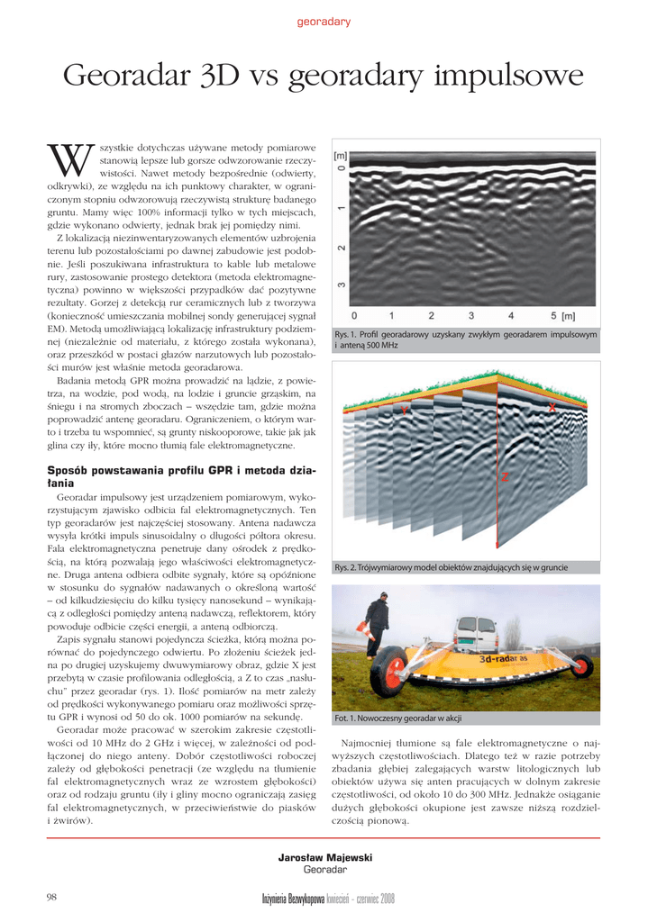 georadary Georadar 3D vs georadary impulsowe W szystkie dotychczas używane metody pomiarowe stanowią lepsze lub gorsze odwzorowanie rzeczywistości. Nawet metody bezpośrednie (odwierty, odkrywki), ze względu na ich punktowy charakter, w ograniczonym stopniu odwzorowują rzeczywistą strukturę badanego gruntu. Mamy więc 100% informacji tylko w tych miejscach, gdzie wykonano odwierty, jednak brak jej pomiędzy nimi. Z lokalizacją niezinwentaryzowanych elementów uzbrojenia terenu lub pozostałościami po dawnej zabudowie jest podobnie. Jeśli poszukiwana infrastruktura to kable lub metalowe rury, zastosowanie prostego detektora (metoda elektromagnetyczna) powinno w większości przypadków dać pozytywne rezultaty. Gorzej z detekcją rur ceramicznych lub z tworzywa (konieczność umieszczania mobilnej sondy generującej sygnał EM). Metodą umożliwiającą lokalizację infrastruktury podziemnej (niezależnie od materiału, z którego została wykonana), oraz przeszkód w postaci głazów narzutowych lub pozostałości murów jest właśnie metoda georadarowa. Badania metodą GPR można prowadzić na lądzie, z powietrza, na wodzie, pod wodą, na lodzie i gruncie grząskim, na śniegu i na stromych zboczach – wszędzie tam, gdzie można poprowadzić antenę georadaru. Ograniczeniem, o którym warto i trzeba tu wspomnieć, są grunty niskooporowe, takie jak jak glina czy iły, które mocno tłumią fale elektromagnetyczne. Rys. 1. Profil georadarowy uzyskany zwykłym georadarem impulsowym i anteną 500 MHz Sposób powstawania profilu GPR i metoda działania Georadar impulsowy jest urządzeniem pomiarowym, wykorzystującym zjawisko odbicia fal elektromagnetycznych. Ten typ georadarów jest najczęściej stosowany. Antena nadawcza wysyła krótki impuls sinusoidalny o długości półtora okresu. Fala elektromagnetyczna penetruje dany ośrodek z prędkością, na którą pozwalają jego właściwości elektromagnetyczne. Druga antena odbiera odbite sygnały, które są opóźnione w stosunku do sygnałów nadawanych o określoną wartość – od kilkudziesięciu do kilku tysięcy nanosekund – wynikającą z odległości pomiędzy anteną nadawczą, reflektorem, który powoduje odbicie części energii, a anteną odbiorczą. Zapis sygnału stanowi pojedyncza ścieżka, którą można porównać do pojedynczego odwiertu. Po złożeniu ścieżek jedna po drugiej uzyskujemy dwuwymiarowy obraz, gdzie X jest przebytą w czasie profilowania odległością, a Z to czas „nasłuchu” przez georadar (rys. 1). Ilość pomiarów na metr zależy od prędkości wykonywanego pomiaru oraz możliwości sprzętu GPR i wynosi od 50 do ok. 1000 pomiarów na sekundę. Georadar może pracować w szerokim zakresie częstotliwości od 10 MHz do 2 GHz i więcej, w zależności od podłączonej do niego anteny. Dobór częstotliwości roboczej zależy od głębokości penetracji (ze względu na tłumienie fal elektromagnetycznych wraz ze wzrostem głębokości) oraz od rodzaju gruntu (iły i gliny mocno ograniczają zasięg fal elektromagnetycznych, w przeciwieństwie do piasków i żwirów). Rys. 2. Trójwymiarowy model obiektów znajdujących się w gruncie Fot. 1. Nowoczesny georadar w akcji Najmocniej tłumione są fale elektromagnetyczne o najwyższych częstotliwościach. Dlatego też w razie potrzeby zbadania głębiej zalegających warstw litologicznych lub obiektów używa się anten pracujących w dolnym zakresie częstotliwości, od około 10 do 300 MHz. Jednakże osiąganie dużych głębokości okupione jest zawsze niższą rozdzielczością pionową. Jarosław Majewski Georadar 98 Inżynieria Bezwykopowa kwiecień – czerwiec 2008 georadary Rys. 3. Przykładowy wynik pracy georadaru nowej generacji zawiera wysokorozdzielcze sygnały, zachowując dużą głębokość penetracji Anteny średnio- i niskoczęstotliwościowe umożliwiają wykrycie większych obiektów, zaś anteny o wysokich częstotliwościach, w zakresie 1–2 GHz, charakteryzują się dużą szczegółowością i wykrywają np. poszczególne pręty zbrojeniowe w konstrukcji betonowej. Obróbka danych GPR Wynikiem badań georadarowych są tzw. falogramy, czyli zapis wszystkich sygnałów zarejestrowanych podczas profilowania. Ich obróbka staje się kluczowym zadaniem operatora georadaru. W celu uzyskania interesujących nas informacji dane można obrabiać na wiele sposobów. Surowy obraz nie zawsze jest czytelny (zwłaszcza, jeśli szukamy subtelnych anomalii lub kiedy np. występuje wiele zakłóceń pochodzących od innych obiektów), dlatego też ilość danych i ich prawidłowa obróbka ma istotne znaczenie. 3D i GPR Georadar daje nam możliwość uzyskania liniowego obrazu anomalii pod powierzchnią ziemi czy wody lub w innym ośrodku, np. w betonie czy asfalcie. Otrzymujemy zatem dwuwymiarowy przekrój XZ, gdzie X to przebyta odległość, a Z to czas przeliczany na głębokość. Poprzez złożenie wielu profili dwuwymiarowych, wykonanych równolegle w równym odstępie (rys. 2), otrzymujemy w pełni trójwymiarowy model obiektów znajdujących się w gruncie. Można taki efekt uzyskać również poprzez prowadzenie pomiaru linią łamaną o dowolnym kształcie przy użyciu georadaru sprzężonego z GPSem. W takim modelu rozdzielczość danych na osi X zależy od częstotliwości wysyłania sygnału GPR lub/i prędkości profilowania, natomiast rozdzielczość w osi Y zależy od odległości pomiędzy kolejnymi profilami, zaś w osi Z – od częstotliwości fali. Systemy wieloantenowe Następnym krokiem w rozwoju technologii GPR było stworzenie systemów wieloantenowych. Większość dostępnych georadarów ma możliwość pracy z dwiema lub większą ilością anten, co daje następujące korzyści: – zastosowanie anten o różnej częstotliwości pozwala na uzyskanie odczytów niskorozdzielczych, penetrujących ośrodek do większych głębokości, baz utraty detali na płytszych głębokościach; – zastosowa
