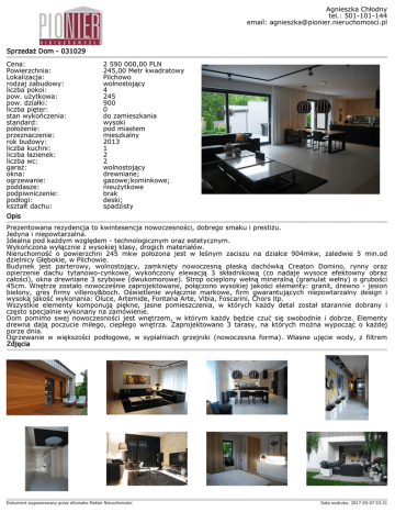 Agnieszka Chłodny tel.: 501-101-144 email: [email protected] Sprzedaż Dom - 031029 Cena: Powierzchnia: Lokalizacja: rodzaj zabudowy: liczba pokoi: pow. użytkowa: pow. działki: liczba pięter: stan wykończenia: standard: położenie: przeznaczenie: rok budowy: liczba kuchni: liczba łazienek: liczba wc: garaż: okna: ogrzewanie: poddasze: podpiwniczenie: podłogi: kształt dachu: Opis 2 590 000,00 PLN 245,00 Metr kwadratowy Pilchowo wolnostojący 4 245 900 0 do zamieszkania wysoki pod miastem mieszkalny 2013 1 2 2 wolnostojący drewniane; gazowe;kominkowe; nieużytkowe brak deski; spadzisty Prezentowana rezydencja to kwintesencja nowoczesności, dobrego smaku i prestiżu. Jedyna i niepowtarzalna. Idealna pod każdym względem - technologicznym oraz estetycznym. Wykończona wyłącznie z wysokiej klasy, drogich materiałów. Nieruchomość o powierzchni 245 mkw położona jest w leśnym zaciszu na działce 904mkw, zaledwie 5 min.od dzielnicy Głębokie, w Pilchowie. Budynek jest parterowy, wolnostojący, zamknięty nowoczesną płaską dachówką Creaton Domino, rynny oraz opierzenie dachu tytanowo-cynkowe, wykończony elewacją 3 składnikową (co nadaje wysoce efektowny obraz całości), okna drewniane 3 szybowe (dwukomorowe). Strop ocieplony wełną mineralną (granulat wełny) o grubości 45cm. Wnętrze zostało nowocześnie zaprojektowane, połączono wysokiej jakości elementy: granit, drewno - jesion bielony, gres firmy villeroy&boch. Oświetlenie wyłącznie markowe, firm gwarantujących niepowtarzalny design i wysoką jakość wykonania: Oluce, Artemide, Fontana Arte, Vibia, Foscarini, Chors itp. Wszystkie elementy komponują piękne, jasne pomieszczenia, w których każdy detal został starannie dobrany i często specjalnie wykonany na zamówienie. Dom pomimo swej nowoczesności jest wnętrzem, w którym każdy będzie czuć się swobodnie i dobrze. Elementy drewna dają poczucie miłego, ciepłego wnętrza. Zaprojektowano 3 tarasy, na których można wypocząć o każdej porze dnia. Ogrzewanie w większości podłogowe, w sypialniach grzejniki (nowoczesna forma). Własne ujęcie wody, z filtrem Zdjęcia Dokument wygenerowany przez eKomako Makler Nieruchomości Data wydruku: 2017-03-07 03:31