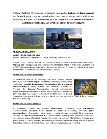 Oddział Zagłębia Węglowego organizuje wycieczkę techniczno-krajoznawczą do Bawarii połączoną ze zwiedzaniem elektrowni słonecznej i elektrowni atomowej w Niemczech w terminie 17 – 21 czerwca 2015 r. (środa – niedziela) Zapraszamy członków SEP wraz z osobami towarzyszącymi! PROGRAM RAMOWY: 1 dzień – 17.06.2015 r. (środa): Wyjazd z Katowic ul. Ceglana 67 – Zajazd Sportowy. Zbiórka 05.45. Przejazd przez Czechy i Austrię. Po drodze obiad w restauracji. Przejazd do miejscowości Pocking, gdzie znajduje się jedna elektrownia słoneczna, która w momencie uruchomienia w 2006 była największym tego typu obiektem na świecie. Przyjazd do hotelu w okolicach Monachium. Zakwaterowanie, obiadokolacja i nocleg. 2 dzień – 18.06.2015 r. (czwartek): Po śniadaniu przejazd do słynnego na całym świecie zakątka Bawarii, w okolice Schwangau. Zwiedzimy najbardziej znany zamek „szalonego” Ludwika Bawarskiego- Neunswchanstein oraz zamek Hohenschwangau, który należał do rodziców Ludwika II. Przejazd do Garmisch-Partenkirche, słynnej miejscowości wypoczynkowej w niemieckich Alpach położonej u stóp najwyższej góry Zugspitze. Czas wolny w Garmisch Partenkirchen w trakcie którego zaprosimy uczestników m.in. pod słynną skocznię narciarską. Obiadokolacja i powrót do hotelu na nocleg. 3 dzień – 19.06.2015 r. (piątek): Po śniadaniu przejazd do centrum Monachium. Zobaczymy m.in Marienplatz z XV-wiecznym kościołem NMP, kościół św. Piotra z XI wieku, barokowy pałac Nymphendburg. Odwiedzimy także jeden z najsłynniejszych monachijskich browarów, założony w 1607 roku Hofbrauhaus – każdy uczestnik obowiązkowo powinien spróbować tam niesamowitego złocistego napoju. Czas wolny w centrum Monachium. Przejazd pod Alianz Arenę – stadion Bayernu Monachium na którym regularnie swoje mecze rozgrywa Robert Lewandowski. Obiadokolacja, czas wolny do dyspozycji grupy i nocleg. 4 dzień – 20.06.2015 r. (sobota): Po śniadaniu wykwaterowanie. Wyjazd do elektrowni jądrowej w Günzburg Gundremmingen. Zwiedzanie wnętrza elektrowni. Przejazd do Norynbergii. Tego dnia zapraszamy na spacer po Starym Mieście, podczas którego zobaczymy Kościół św. Wawrzyńca, Rynek Główny z Piękną Fontanną i kościołem Frauenkirche, Stary Ratusz, Kościół św. Sebalda, w którym znajduje się kilka dzieł Wita Stwosza, zamek cesarski. Przejazd do hotelu obiadokolacja i nocleg. 5 dzień – 20.06.2015 r. (sobota): Po śniadaniu wyjazd w drogę powrotną do Katowic. Po drodze obiad w restauracji. Przyjazd na miejsce w godzinach wieczornych. Koszt dla członków OZW SEP to 1400 zł a dla niestowarzyszonych 1500 zł. W cenie jest zapewnione: - 4 noclegi (hotel ****, pokoje 2,3 osobowe z łazienkami). - zwiedzanie według programu - transport autokarem klasy LUX (barek, klimatyzacja, DVD, toaleta) - opieka pilota / przewodnika - wyżywienie HB (śniadania, obiadokolacje) - Ubezpieczenie KL,NNW Dodatkowo obowiązkowo płatne gotówką w trakcie wyjazdu: bilety wstępu, opłata przewodnicka, zestawy słuchawkowe – 50 euro/os. Zaliczkę 30% (1400 zł/1500 zł) odpowiednio w kwocie 420 zł /450 zł należy wpłacić do dnia 20 kwietnia br. na konto: P KO BP S A I O /K a t o w ic e N r 1 1 1 0 20 2 31 3 00 0 0 3 1 0 2 0 1 77 7 94 5 ZAPRASZAMY!