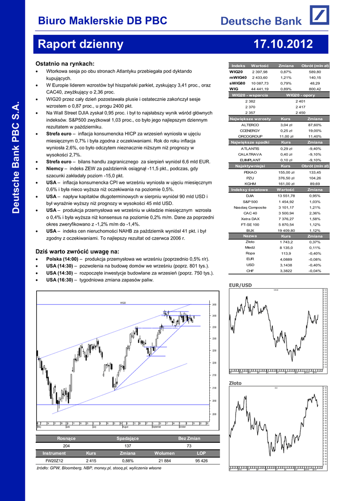 Biuro Maklerskie DB PBC bobbww Raport dzienny 17.10.2012 Ostatnio na rynkach: Deutsche Bank PBC S.A. Wartość Zmiana Obrót (mln zł) WIG20 2 397,98 0,87% 589,80 mWIG40 2 433,60 1,21% 140,15 sWIG80 10 087,73 0,79% 48,29 WIG 44 441,19 0,89% 800,42 Indeks Wtorkowa sesja po obu stronach Atlantyku przebiegała pod dyktando kupujących. W Europie liderem wzrostów był hiszpański parkiet, zyskujący 3,41 proc., oraz CAC40, zwyżkujący o 2,36 proc. WIG20 przez cały dzień pozostawała plusie i ostatecznie zakończył sesje wzrostem o 0,87 proc., u progu 2400 pkt. Na Wall Street DJIA zyskał 0,95 proc. i był to najsłabszy wynik wśród głównych indeksów. S&P500 zwyżkował 1,03 proc., co było jego najlepszym dziennym rezultatem w październiku. Strefa euro – inflacja konsumencka HICP za wrzesień wyniosła w ujęciu miesięcznym 0,7% i była zgodna z oczekiwaniami. Rok do roku inflacja wyniosła 2,6%, co było odczytem nieznacznie niższym niż prognozy w wysokości 2,7%. Strefa euro – bilans handlu zagranicznego za sierpień wyniósł 6,6 mld EUR. Niemcy – indeks ZEW za październik osiągnął -11,5 pkt., podczas, gdy szacunki zakładały poziom -15,0 pkt. USA – inflacja konsumencka CPI we wrześniu wyniosła w ujęciu miesięcznym 0,6% i była nieco wyższa niż oczekiwania na poziomie 0,5%. USA – napływ kapitałów długoterminowych w sierpniu wyniósł 90 mld USD i był wyraźnie wyższy niż prognozy w wysokości 45 mld USD. USA – produkcja przemysłowa we wrześniu w układzie miesięcznym wzrosła o 0,4% i była wyższa niż konsensus na poziomie 0,2% m/m. Dane za poprzedni okres zweryfikowano z -1,2% m/m do -1,4%. USA – indeks cen nieruchomości NAHB za październik wyniósł 41 pkt. i był zgodny z oczekiwaniami. To najlepszy rezultat od czerwca 2006 r. WIG20 - wsparcia WIG20 - opory 2 382 2 401 2 370 2 417 2 357 Kurs Zmiana ALTERCO 3,04 zł 87,60% CCENERGY 0,25 zł 19,00% ORCOGROUP 11,00 zł 11,40% Największe spadki Kurs Zmiana ATLANTIS 0,29 zł -9,40% CALATRAVA 0,40 zł -9,10% EUIMPLANT 0,10 zł -9,10% Najaktywniejsi Kurs Obrót (mln zł) PEKAO 155,00 zł 133,45 PZU 376,50 zł 104,26 KGHM 161,00 zł 89,69 Indeksy światowe Wartość Zmiana DJIA 13 551,78 0,95% S&P 500 1 454,92 1,03% Nasdaq Composite 3 101,17 1,21% CAC 40 3 500,94 2,36% Xetra DAX 7 376,27 1,58% FT-SE 100 5 870,54 1,12% BUX 19 409,80 1,12% Nazwa Kurs Zmiana 0,37% Dziś warto zwrócić uwagę na: Polska (14:00) – produkcja przemysłowa we wrześniu (poprzednio 0,5% r/r). USA (14:30) – pozwolenia na budowę domów we wrześniu (poprz. 801 tys.). USA (14:30) – rozpoczęte inwestycje budowlane za wrzesień (poprz. 750 tys.). USA (16:30) – tygodniowa zmiana zapasów paliw. 2 450 Największe wzrosty Złoto 1 743,2 Miedź 8 135,0 0,11% Ropa 113,9 -0,40% EUR 4,0889 -0,08% USD 3,1438 -0,40% CHF 3,3822 -0,04% EUR/USD EUR/USD WIG20 2450 2400 2350 2300 2250 2200 1.360 1.355 1.350 1.345 1.340 1.335 1.330 1.325 1.320 1.315 1.310 1.305 1.300 1.295 1.290 1.285 1.280 1.275 1.270 1.265 1.260 1.255 1.250 1.245 1.240 1.235 1.230 1.225 1.220 1.215 1.210 1.205 1.200 1.195 2 9 16 23 30 6 13 20 27 5 12 19 26 2 9 16 23 30 7 14 21 28 4 11 18 25 2 9 16 23 30 6 13 20 27 3 10 17 24 1 8 15 22 29 2012 February March April May June July August September October 2150 Złoto 2100 GOLD 2050 2000 30 7 May 14 21 28 4 June 11 18 25 2 July 9 16 23 30 6 August 13 20 27 3 10 September 17 24 1 8 October 15 22 Rosnące Spadające Bez Zmian 204 137 73 29 1820 1810 1800 1790 1780 1770 1760 1750 1740 1730 1720 1710 1700 1690 1680 1670 1660 1650 1640 1630 1620 1610 1600 1590 1580 1570 Instrument Kurs Zmiana Wolumen LOP FW20Z12 2 415 0,88% 21 884 95 426 1560 1550 1540 1530 1520 1510 źródło: GPW, Bloomberg, NBP, money.pl, stooq.pl, wyliczenia własne 3 9 16 23 30 6 13 20 27 5 12 19 26 2 9 16 23 30 7 14 21 28 4 11 18 25 2 9 16 23 30 6 13 20 27 3 10 17 24 1 8 15 22 29 2012 February March April May June July August September October Kupujący dominują na giełdach S&P500 S&P500 1490 1480 1470 Wczorajsza sesja upłynęła pod znakiem kontynuacji wzrostów z poniedziałku, a giełdowe indeksy z nawiązką zacierają niekorzystne wrażenie z poprzedniego tygodnia. W odróżnieniu do sesji otwierającej tydzień, tym razem popyt od początku nie pozostawił wątpliwości, co do tego że kontroluje sytuację. Powody były podobne jak dzień wcześniej, czyli kolejne lepsze od oczekiwań dane makro oraz wyniki spółek amerykańskich. 1460 1450 1440 1430 1420 1410 1400 1390 1380 1370 1360 1350 1340 1330 1320 Deutsche Bank PBC S.A. 1310 1300 Jeszcze przed południem na rynki nadeszła pozytywna informacja o niespodziewanym wzroście indeksu niemieckiego instytutu Zew do -11,5 pkt. co potwierdza polepszające się nastroje za Odra. W Stanach Zjednoczonych wrześniowa produkcja przemysłowa była lepsza od prognoz (0,4 proc. vs. 0,2 proc.), a informacje o sierpniowym napływie długoterminowych kapitałów do USA, który okazał się dwukrotnie wyższy niż zakładano, dodatkowo wsparły pozytywny sentyment. Kolejne dobre wiadomości napłynęły z tamtejszych spółek. Wyniki Coca-Cola, Johnson & Johnson i Goldman Sachs pobiły rynkowy konsensus, co zwłaszcza w przypadku tej ostatniej firmy zostało przyjęte z optymizmem (zysk na akcję wyniósł 2,85 USD, podczas gdy spodziewano się 2,12 USD, a wyraźnie lepsze były też przychody). Kolejnym korzystnym impulsem był odczyt indeksu nieruchomości NAHB za październik, który z rezultatem 41 pkt. znalazł się na najwyższym poziomie od czerwca 2006 roku. W Europie liderem wzrostów był hiszpański parkiet, zyskujący 3,41 proc., oraz CAC40, zwyżkujący o 2,36 proc. Na Wall Street DJIA zyskał 0,95 proc. i był to najsłabszy wynik wśród głównych indeksów. S&P500 zwyżkował 1,03 proc., co było jego najlepszym dziennym rezultatem w październiku, a najlepiej zachował się Nasdaq Composite, który wzrósł o 1,21 proc. 1290 1280 1270 1260 1250 27 3 9 17 23 30 6 13 21 27 5 12 19 