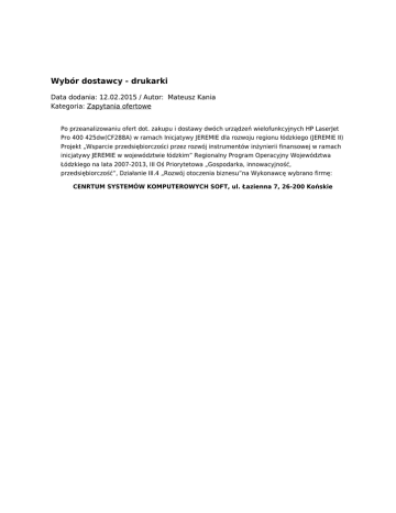 Wybór dostawcy - drukarki Data dodania: 12.02.2015 / Autor: Mateusz Kania Kategoria: Zapytania ofertowe Po przeanalizowaniu ofert dot. zakupu i dostawy dwóch urządzeń wielofunkcyjnych HP LaserJet Pro 400 425dw(CF288A) w ramach Inicjatywy JEREMIE dla rozwoju regionu łódzkiego (JEREMIE II) Projekt „Wsparcie przedsiębiorczości przez rozwój instrumentów inżynierii finansowej w ramach inicjatywy JEREMIE w województwie łódzkim” Regionalny Program Operacyjny Województwa Łódzkiego na lata 2007-2013, III Oś Priorytetowa „Gospodarka, innowacyjność, przedsiębiorczość”, Działanie III.4 „Rozwój otoczenia biznesu”na Wykonawcę wybrano firmę: CENRTUM SYSTEMÓW KOMPUTEROWYCH SOFT, ul. Łazienna 7, 26-200 Końskie