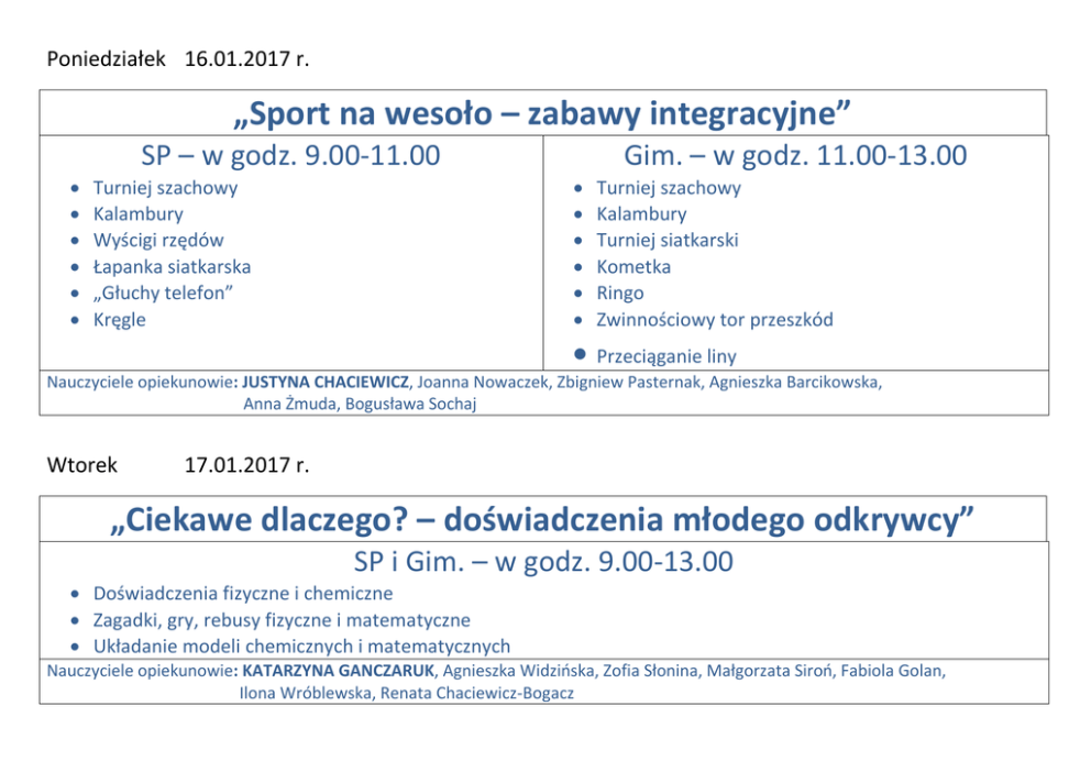 Poniedziałek 16.01.2017 r. „Sport na wesoło – zabawy integracyjne” SP – w godz. 9.00-11.00 Gim. – w godz. 11.00-13.00 Turniej szachowy Kalambury Wyścigi rzędów Łapanka siatkarska „Głuchy telefon” Kręgle Turniej szachowy Kalambury Turniej siatkarski Kometka Ringo Zwinnościowy tor przeszkód Przeciąganie liny Nauczyciele opiekunowie: JUSTYNA CHACIEWICZ, Joanna Nowaczek, Zbigniew Pasternak, Agnieszka Barcikowska, Anna Żmuda, Bogusława Sochaj Wtorek 17.01.2017 r. „Ciekawe dlaczego? – doświadczenia młodego odkrywcy” SP i Gim. – w godz. 9.00-13.00 Doświadczenia fizyczne i chemiczne Zagadki, gry, rebusy fizyczne i matematyczne Układanie modeli chemicznych i matematycznych Nauczyciele opiekunowie: KATARZYNA GANCZARUK, Agnieszka Widzińska, Zofia Słonina, Małgorzata Siroń, Fabiola Golan, Ilona Wróblewska, Renata Chaciewicz-Bogacz Środa 18.01.2017 r. „Zimowe fantazje – zajęcia artystyczne” SP i Gim. – w godz. 9.00-13.00 Zajęcia plastyczne inspirujące do tworzenia własnych projektów, wzorów: Magiczny papierowy świat z wykorzystaniem orgiami „Serduszkowe życzenia Walentynkowe” – przeplatanka z kolorowego papieru Papierowa wiklina Nauczyciele opiekunowie: EWA KLOC, Bernarda Bogusz, Monika Grochowska, Anna Kozak –Okońska, Agnieszka Tokarska, Edyta Partyka Czwartek 19.01.2017 r. „Spotkanie z naturą – wycieczka do lasu” Członkowie SKKT i inni chętni z SP i Gim. – w godz. 9.00-13.00 Piesza wycieczka do lasu Poszukiwanie tropów zwierząt Dokarmianie zwierząt i ptaków Ognisko z pieczeniem kiełbasek * Uczniowie muszą w tym dniu przynieść ze sobą ziarno, marchewki itp. dla zwierząt oraz kiełbasę na ognisko. Nauczyciele opiekunowie: ELŻBIETA SIDOROWSKA, Monika Kapłan, Wacław Modrzyński, Monika Zalewska, Grzegorz Bedliński Piątek 20.01.2017 r. „W zdrowym ciele – zdrowy duch” SP – w godz. 9.00-11.00 Turniej tenisa stołowego Rozgrywki zespołowe w piłkę nożną Gim. – w godz. 11.00-13.00 Turniej tenisa stołowego Rozgrywki zespołowe w piłkę nożną Nauczyciele opiekunowie: DARIUSZ BEDNARUK, Ewa Pasztelan, Beata Sagan-Zalewska, Dorota Żóraw, Monika Oraczewska Poniedziałek 23.01.2017 r. „Ferie z filmem” SP i Gim. – w godz. 9.00-13.00 Oglądanie filmów Klub dyskusyjny Tworzenie recenzji Bawimy się w reżyserów – odgrywanie scenek, dialogów itp. Nauczyciele opiekunowie: BEATA ŁASKI, Sylwia Delekta-Prokopiuk, Tomasz Szymona, Maria Kosacka, Anna Cyfra, Wanda Szawuła Wtorek 24.01.2017 r. „Pozdrowienia z ferii zimowych – zajęcia komputerowe ” SP i Gim. – w godz. 9.00-13.00 Tworzenie kartek, folderów, przewodników Planowanie ofert wypoczynku Podróże wirtualne Nauczyciele opiekunowie: EDYTA CZERNIAK, Joanna Górnik, Agnieszka Kotyńska, Aneta Matuszak, Ewa Pułka, Iwona Niemiec Środa 25.01.2017 r. „Znam Polskę – poznam świat!” SP i Gim. – w godz. 9.00-13.00 Gry i zabawy z językiem angielskim Gry planszowe, quizy o Wielkiej Brytanii i Stanach Zjednoczonych Piosenki anglojęzyczne np. George Michael, Sting, Celin Dion Powitanie Nowego Roku w różnych krajach świata – ciekawostki kulinarne, zwyczaje Rosyjska Maslenica – co to takiego? Film i quiz o Petersburgu Nauczyciele opiekunowie: IWONA JÓŹWIK, Justyna Tomasiak, Jolanta Karwat, Edyta Misiewicz-Hulewska, Paulina Wronisz, Jolanta Bartniczuk, Anna Stefańczyk Czwartek 26.01.2017 r. „Zima w tęczowych kolorach – zajęcia artystyczne” SP i Gim. – w godz. 9.00-13.00 Tworzenie masek karnawałowych Zimowy pejzaż malowany farbami Karaoke, zabawy ruchowe Magiczne kółeczka – składanie papierowych modeli Rozgrywki w tenisa stołowego i kometkę Turniej gier stolikowych Nauczyciele opiekunowie: ANNA KOŁODZIEJ, Eliza Jóśko, Aneta Niespodziewańska, Tomasz Oziemczuk Piątek 27.01.2017 r. „Robótki na różne okazje” SP i Gim. – w godz. 9.00-13.00 Przyszywanie guzików, cerowanie Robótki ręczne – druty, szydełko Zasady nakrywania stołu, Tworzenie menu na różne okazje *Uczniowie muszą przynieść guziki, skrawki materiałów, igły, nici, druty, szydełka, włóczki Nauczyciele opiekunowie: MARTA NOWACKA, Teresa Dąbek, Maria Urbaniak, Małgorzata Popow, Joanna Romanowska