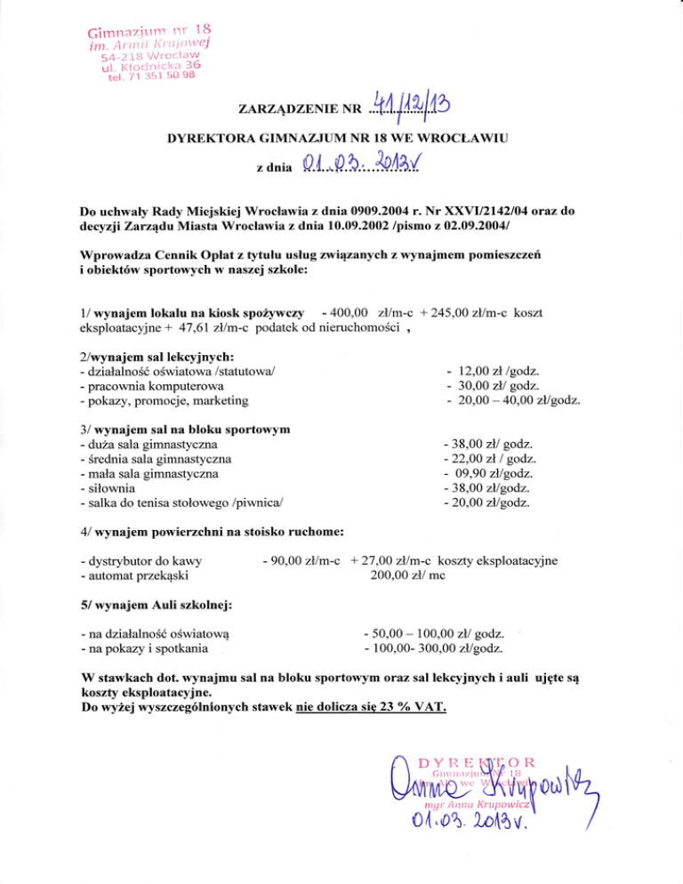 Girnlrazittt,ll lll, 1 8 inl. Ał,tnii !,:i liitłweJ 54 .ł LlJ, \j/1,3ri,lw 'J."li!,i?i.ł3du" zARzĄDzENIE -" łl.// fu.ab DYREKTORA GIMNAZJUMNR 18 WE WROCŁAWIU z dnia Do uchwaĘ Rady Miejskiej Wrocławia z dnia 0909.2004 r. Nr XXVIl214żl04 oraz do decyzji Zarząda Miasta Wrocławia z dnia 10.09.2002 ipismo z 02.09.2004l Wprowadza Cennik Opłat z Ętułu usług nłiązanych z wynajmem pomieszczeń i obiektów sportowych w naszej szkole: łvynajem lokalu na kiosk spożywcry - 400,00 złlm-c + 245,00 zŁlm-c kosź eksploatacyjne + 47,6I złlm-c podatek od nieruchomości, 1/ 2/łrynajem sal lekryjnych: - działalnośćoświatowa l statutowa/ - pracownia komputerowa - pokazy, promocje, marketing - wynajem sal na bloku spońowym - duża sala gimnasĘczna - średniasala gimnasĘczna - mńa sala gimnastyczna - siłownia 12,00 zł lgodz. 30,00 złl godz. 20,00 - 40,00 złlgodz. 3/ - 38,00 zŁl godz. -22,00 ń l godz. - 09,90 złlgodz. - 38,00 złlgodz. - 20,00 złlgodz. - salka do tenisa stołowego /piwnica/ 4/ wynajem powierzchni na stoisko ruchome: - dystrybutor do kawy - automat przekąski 5/ złlm-c + 2],00 zŁlm-c, koszty eksploatacyjne 200,00 złlmc wynajem Auli szkolnej: na działalnośćoświatową -napokazy i spotkania - 90,00 - 100,00 złl godz. - 100,00- 300,00 złlgodz. - 50,00 W stawkach dot. wynajmu sal na bloku sportowym oraz sal lekryjnych i auli ujęte są koszty eksploataryjne. Do wyżej wyszczególnlonych stawek nie dolicza sie 23 7o VAT. 0Lil