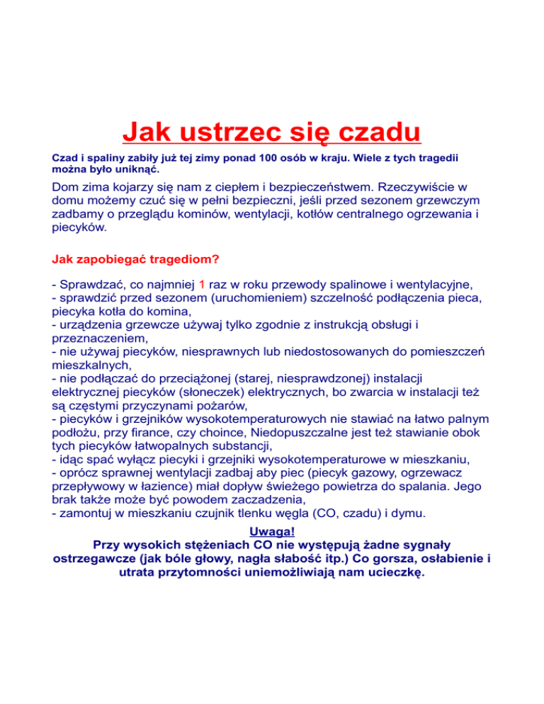 Jak ustrzec się czadu Czad i spaliny zabiły już tej zimy ponad 100 osób w kraju. Wiele z tych tragedii można było uniknąć. Dom zima kojarzy się nam z ciepłem i bezpieczeństwem. Rzeczywiście w domu możemy czuć się w pełni bezpieczni, jeśli przed sezonem grzewczym zadbamy o przeglądu kominów, wentylacji, kotłów centralnego ogrzewania i piecyków. Jak zapobiegać tragediom? - Sprawdzać, co najmniej 1 raz w roku przewody spalinowe i wentylacyjne, - sprawdzić przed sezonem (uruchomieniem) szczelność podłączenia pieca, piecyka kotła do komina, - urządzenia grzewcze używaj tylko zgodnie z instrukcją obsługi i przeznaczeniem, - nie używaj piecyków, niesprawnych lub niedostosowanych do pomieszczeń mieszkalnych, - nie podłączać do przeciążonej (starej, niesprawdzonej) instalacji elektrycznej piecyków (słoneczek) elektrycznych, bo zwarcia w instalacji też są częstymi przyczynami pożarów, - piecyków i grzejników wysokotemperaturowych nie stawiać na łatwo palnym podłożu, przy firance, czy choince, Niedopuszczalne jest też stawianie obok tych piecyków łatwopalnych substancji, - idąc spać wyłącz piecyki i grzejniki wysokotemperaturowe w mieszkaniu, - oprócz sprawnej wentylacji zadbaj aby piec (piecyk gazowy, ogrzewacz przepływowy w łazience) miał dopływ świeżego powietrza do spalania. Jego brak także może być powodem zaczadzenia, - zamontuj w mieszkaniu czujnik tlenku węgla (CO, czadu) i dymu. Uwaga! Przy wysokich stężeniach CO nie występują żadne sygnały ostrzegawcze (jak bóle głowy, nagła słabość itp.) Co gorsza, osłabienie i utrata przytomności uniemożliwiają nam ucieczkę. Co robić, gdy powstanie pożar !!! - gdy zauważyłeś pożar w mieszkaniu zakręć gaz, wyłącz prąd zamknij okna i drzwi aby ograniczyć dopływ tlenu, a tym samym możliwość rozprzestrzeniania się pożaru, - dzwoń pod numer straży pożarnej - 998 lub 112, (podaj swoje imię i nazwisko, dokładny adres, co się pali oraz czy jest zagrożone życie ludzkie) i wykonuj polecenia strażaków, - zaalarmuj pozostałych domowników oraz sąsiadów, - jeżeli możesz przystąp do gaszenia pożaru, - gdy nie jesteś w stanie sam ugasić ognia jak najszybciej opuść zagrożone miejsce. Czasem jest za późno Niestety wielu z nas zapomina o tym, podobnie jak o zasadach właściwego użytkowania urządzeń grzewczych i gazowych. Tylko tej zimy doprowadziło to do wielu niepotrzebnych tragedii. Naprawdę wolimy przypominać i ostrzegać. Niestety co roku sytuacja się powtarza o tej porze. Zima to więcej pożarów od piecyków i tragicznych zaczadzeń. Dlatego gorąca prośba o zdrowy rozsądek i wyobraźnię do wszystkich użytkowników piecyków i urządzeń grzewczych. Tlenek węgla (czad) - cichy zabójca Tlenek węgla (CO) jest gazem powstającym w wyniku niepełnego spalania węgla i substancji, które w swym składzie węgiel posiadają. Jest tym groźniejszy, bo nie posiada smaku, zapachu, barwy, nie szczypie w oczy i nie "dusi w gardle". Najczęstszą przyczyną zatrucia są pożary i wadliwa instalacja grzewcza. Tlenek węgla do organizmu wchłania się, gdy oddychamy. Kiedy już jest w płucach, wiążę się z hemoglobiną, tworząc tzw. karboksyhemoglobinę, która uszkadza m.in.: ośrodkowy układ nerwowy i naczyniowo - sercowy. Wysiłek fizyczny, wysoka temperatura, stres - a te zjawiska zawsze występują przy pożarze - dodatkowo wpływają na szybkość przesycania organizmu CO poprzez wymuszanie większej częstotliwości oddechu. Po 6-7 minutach przebywania w pomieszczeniu, w którym stężenie CO wynosi ok. 70 proc. doprowadza do nieodwracalnych zmian w organizmie, a po 20 minutach następuje zgon. Jednak przy większej ilości CO w pomieszczeniach zamkniętych śmierć może nastąpić błyskawicznie, już po kilku oddechach, na skutek uduszenia w wyniku porażenia ośrodków oddychania.