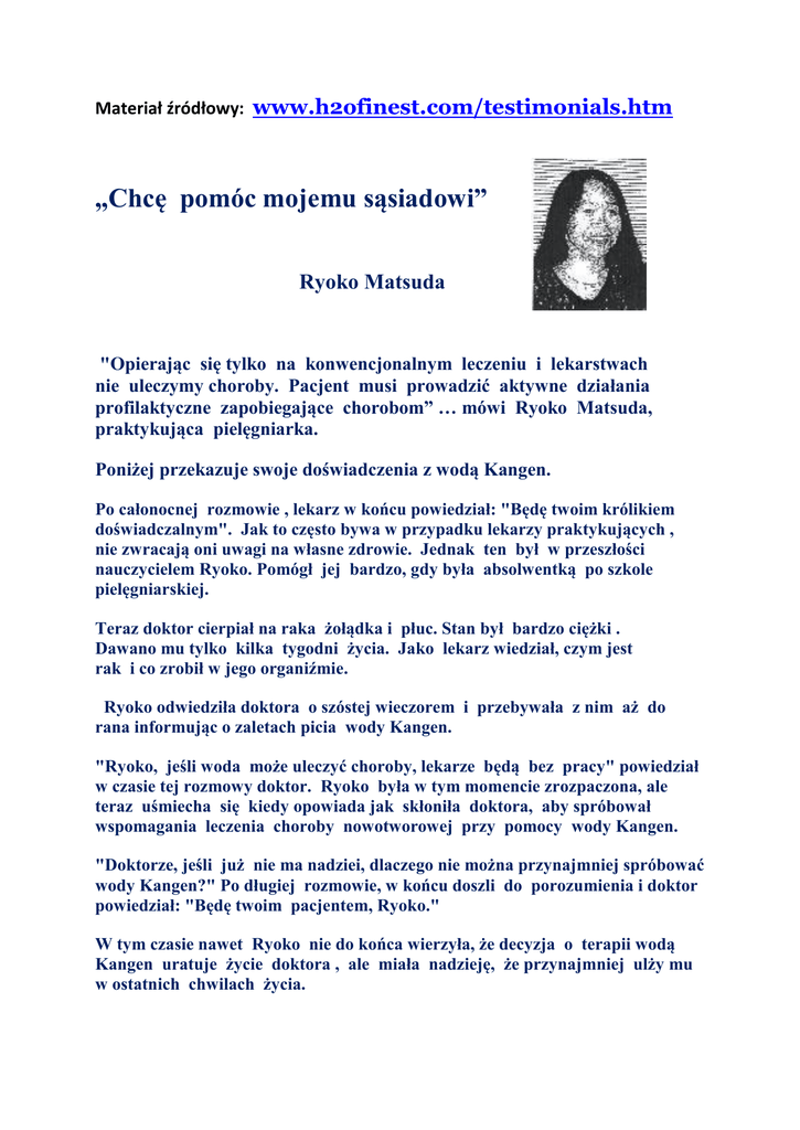 Materiał źródłowy: www.h2ofinest.com/testimonials.htm „Chcę pomóc mojemu sąsiadowi” Ryoko Matsuda "Opierając się tylko na konwencjonalnym leczeniu i lekarstwach nie uleczymy choroby. Pacjent musi prowadzić aktywne działania profilaktyczne zapobiegające chorobom” … mówi Ryoko Matsuda, praktykująca pielęgniarka. Poniżej przekazuje swoje doświadczenia z wodą Kangen. Po całonocnej rozmowie , lekarz w końcu powiedział: "Będę twoim królikiem doświadczalnym". Jak to często bywa w przypadku lekarzy praktykujących , nie zwracają oni uwagi na własne zdrowie. Jednak ten był w przeszłości nauczycielem Ryoko. Pomógł jej bardzo, gdy była absolwentką po szkole pielęgniarskiej. Teraz doktor cierpiał na raka żołądka i płuc. Stan był bardzo ciężki . Dawano mu tylko kilka tygodni życia. Jako lekarz wiedział, czym jest rak i co zrobił w jego organiźmie. Ryoko odwiedziła doktora o szóstej wieczorem i przebywała z nim aż do rana informując o zaletach picia wody Kangen. "Ryoko, jeśli woda może uleczyć choroby, lekarze będą bez pracy" powiedział w czasie tej rozmowy doktor. Ryoko była w tym momencie zrozpaczona, ale teraz uśmiecha się kiedy opowiada jak skłoniła doktora, aby spróbował wspomagania leczenia choroby nowotworowej przy pomocy wody Kangen. "Doktorze, jeśli już nie ma nadziei, dlaczego nie można przynajmniej spróbować wody Kangen?" Po długiej rozmowie, w końcu doszli do porozumienia i doktor powiedział: "Będę twoim pacjentem, Ryoko." W tym czasie nawet Ryoko nie do końca wierzyła, że decyzja o terapii wodą Kangen uratuje życie doktora , ale miała nadzieję, że przynajmniej ulży mu w ostatnich chwilach życia. Następnego dnia doktor wypił cztery litry wody Kangen. W kolejnym dniu zwymiotował jakąś ciemną substancją. Ciemne, wręcz czarne stolce zostały usunięte z jego organizmu w ogromnej ilości. Zwiększył spożycie wody Kangen najpierw do sześciu , a potem aż do ośmiu litrów na dobę. Nieprawdopodobne, ale nie stwierdzono u niego raka już w trzecim tygodniu od rozpoczęcia picia wody Kangen. Ryoko: „Ucieszyłam się bardzo, gdy doktor powiedział: "Udało się!" Doktor powrócił do aktywnego wykonywania swojego zawodu . Woda Kangen w jego przypadku okazała się skuteczniejsza od nowoczesnej zachodniej medycyny. "Wierzę w moc wody Kangen", mówi Ryoko. "Odziedziczyłem gen raka. Piję wodę Kangen codziennie i planuje żyć długo, zdrowo choćby przez wzgląd na moje dzieci. " Ryoko urodziła się z ogólnym słabym stanem zdrowia. Miała chore serce od czasu, gdy była dzieckiem. Cierpiała też na reumatoidalne zapalenie stawów oraz astmę. Na szczęście wszystkie te problemy zniknęły, gdy zaczęła pić wodę Kangen. Ryoko pracuje jako pielęgniarka opieki domowej. Dzięki własnym pozytywnym doświadczeniom mogła pomóc wyprowadzić z raka trzydziestu jej chorych na raka pacjentów przy pomocy wody Kangen. Dwudziestu sześciu z nich było w stanie powrócić do normalnego, produktywnego życia. Ryoko dowiedziała się o systemie wody Kangen od sprzedawcy tych urządzeń dwa lata temu i natychmiast zakupiła jonizator. Ryoko uważa: "Ludzie powinni być bardziej zainteresowani medycyną prewencyjną". Ryoko widziała wielu kobiet chorych na raka piersi, po operacjach, które wróciły do swoich domów. Często jednak po dwóch-trzech miesiącach następował nawrót choroby i ponowny pobyt w szpitalu. Jako praktykująca pielęgniarka co do jednej rzeczy Ryoko jest przekonana, że nawroty u chorych na nowotwór występują, ponieważ pacjenci uważają, iż są już trwale wyleczeni i nie ma potrzeby zmiany stylu ich życia. "Chcę uczyć ludzi, jak zachować zdrowie korzystając z filozofii firmy Enagic " – mówi Ryoko . „Zmień swoją wodę … zmień swoje życie”